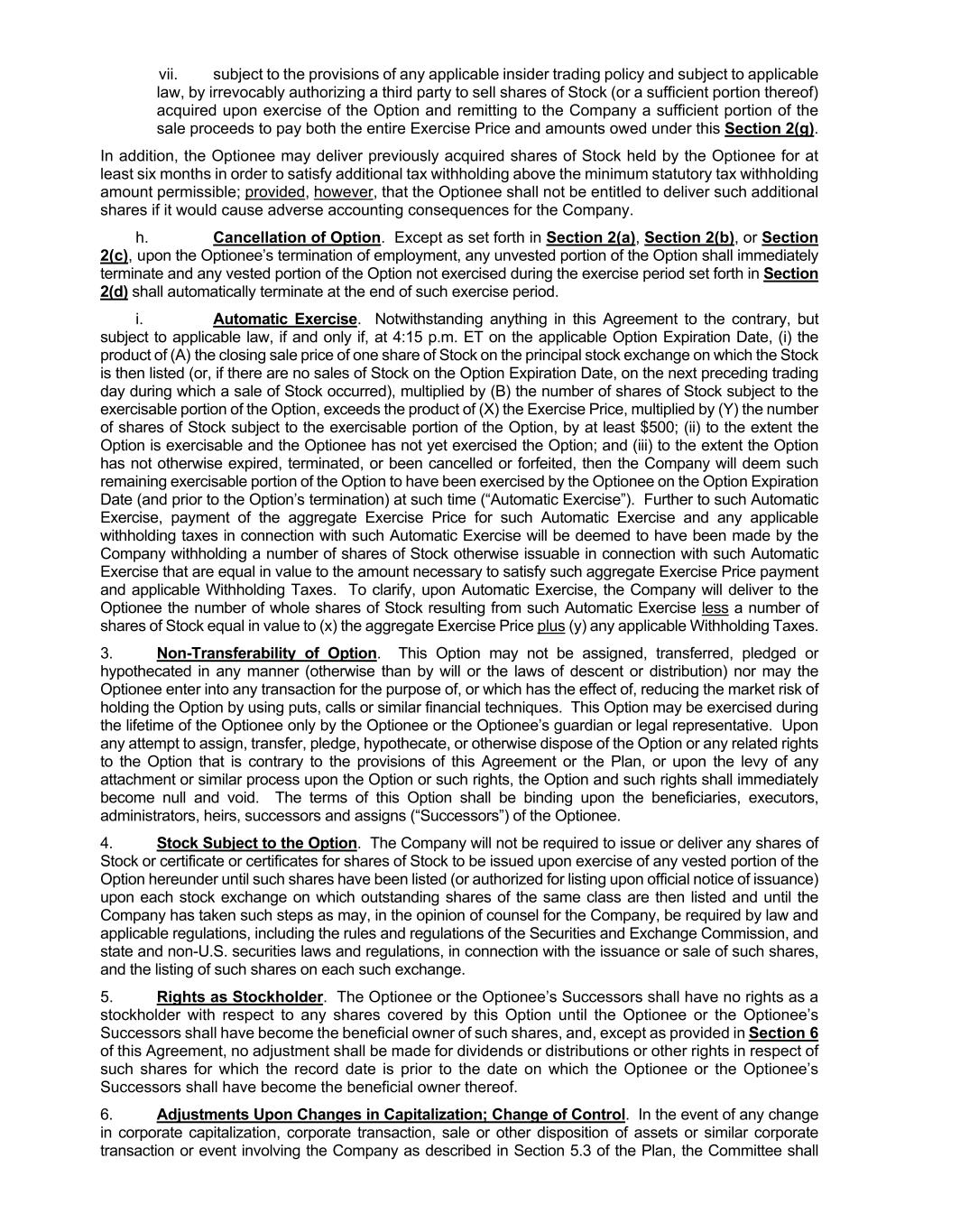 vii. subject to the provisions of any applicable insider trading policy and subject to applicable law, by irrevocably authorizing a third party to sell shares of Stock (or a sufficient portion thereof) acquired upon exercise of the Option and remitting to the Company a sufficient portion of the sale proceeds to pay both the entire Exercise Price and amounts owed under this Section 2(g). In addition, the Optionee may deliver previously acquired shares of Stock held by the Optionee for at least six months in order to satisfy additional tax withholding above the minimum statutory tax withholding amount permissible; provided, however, that the Optionee shall not be entitled to deliver such additional shares if it would cause adverse accounting consequences for the Company. h. Cancellation of Option. Except as set forth in Section 2(a), Section 2(b), or Section 2(c), upon the Optionee’s termination of employment, any unvested portion of the Option shall immediately terminate and any vested portion of the Option not exercised during the exercise period set forth in Section 2(d) shall automatically terminate at the end of such exercise period. i. Automatic Exercise. Notwithstanding anything in this Agreement to the contrary, but subject to applicable law, if and only if, at 4:15 p.m. ET on the applicable Option Expiration Date, (i) the product of (A) the closing sale price of one share of Stock on the principal stock exchange on which the Stock is then listed (or, if there are no sales of Stock on the Option Expiration Date, on the next preceding trading day during which a sale of Stock occurred), multiplied by (B) the number of shares of Stock subject to the exercisable portion of the Option, exceeds the product of (X) the Exercise Price, multiplied by (Y) the number of shares of Stock subject to the exercisable portion of the Option, by at least $500; (ii) to the extent the Option is exercisable and the Optionee has not yet exercised the Option; and (iii) to the extent the Option has not otherwise expired, terminated, or been cancelled or forfeited, then the Company will deem such remaining exercisable portion of the Option to have been exercised by the Optionee on the Option Expiration Date (and prior to the Option’s termination) at such time (“Automatic Exercise”). Further to such Automatic Exercise, payment of the aggregate Exercise Price for such Automatic Exercise and any applicable withholding taxes in connection with such Automatic Exercise will be deemed to have been made by the Company withholding a number of shares of Stock otherwise issuable in connection with such Automatic Exercise that are equal in value to the amount necessary to satisfy such aggregate Exercise Price payment and applicable Withholding Taxes. To clarify, upon Automatic Exercise, the Company will deliver to the Optionee the number of whole shares of Stock resulting from such Automatic Exercise less a number of shares of Stock equal in value to (x) the aggregate Exercise Price plus (y) any applicable Withholding Taxes. 3. Non-Transferability of Option. This Option may not be assigned, transferred, pledged or hypothecated in any manner (otherwise than by will or the laws of descent or distribution) nor may the Optionee enter into any transaction for the purpose of, or which has the effect of, reducing the market risk of holding the Option by using puts, calls or similar financial techniques. This Option may be exercised during the lifetime of the Optionee only by the Optionee or the Optionee’s guardian or legal representative. Upon any attempt to assign, transfer, pledge, hypothecate, or otherwise dispose of the Option or any related rights to the Option that is contrary to the provisions of this Agreement or the Plan, or upon the levy of any attachment or similar process upon the Option or such rights, the Option and such rights shall immediately become null and void. The terms of this Option shall be binding upon the beneficiaries, executors, administrators, heirs, successors and assigns (“Successors”) of the Optionee. 4. Stock Subject to the Option. The Company will not be required to issue or deliver any shares of Stock or certificate or certificates for shares of Stock to be issued upon exercise of any vested portion of the Option hereunder until such shares have been listed (or authorized for listing upon official notice of issuance) upon each stock exchange on which outstanding shares of the same class are then listed and until the Company has taken such steps as may, in the opinion of counsel for the Company, be required by law and applicable regulations, including the rules and regulations of the Securities and Exchange Commission, and state and non-U.S. securities laws and regulations, in connection with the issuance or sale of such shares, and the listing of such shares on each such exchange. 5. Rights as Stockholder. The Optionee or the Optionee’s Successors shall have no rights as a stockholder with respect to any shares covered by this Option until the Optionee or the Optionee’s Successors shall have become the beneficial owner of such shares, and, except as provided in Section 6 of this Agreement, no adjustment shall be made for dividends or distributions or other rights in respect of such shares for which the record date is prior to the date on which the Optionee or the Optionee’s Successors shall have become the beneficial owner thereof. 6. Adjustments Upon Changes in Capitalization; Change of Control. In the event of any change in corporate capitalization, corporate transaction, sale or other disposition of assets or similar corporate transaction or event involving the Company as described in Section 5.3 of the Plan, the Committee shall