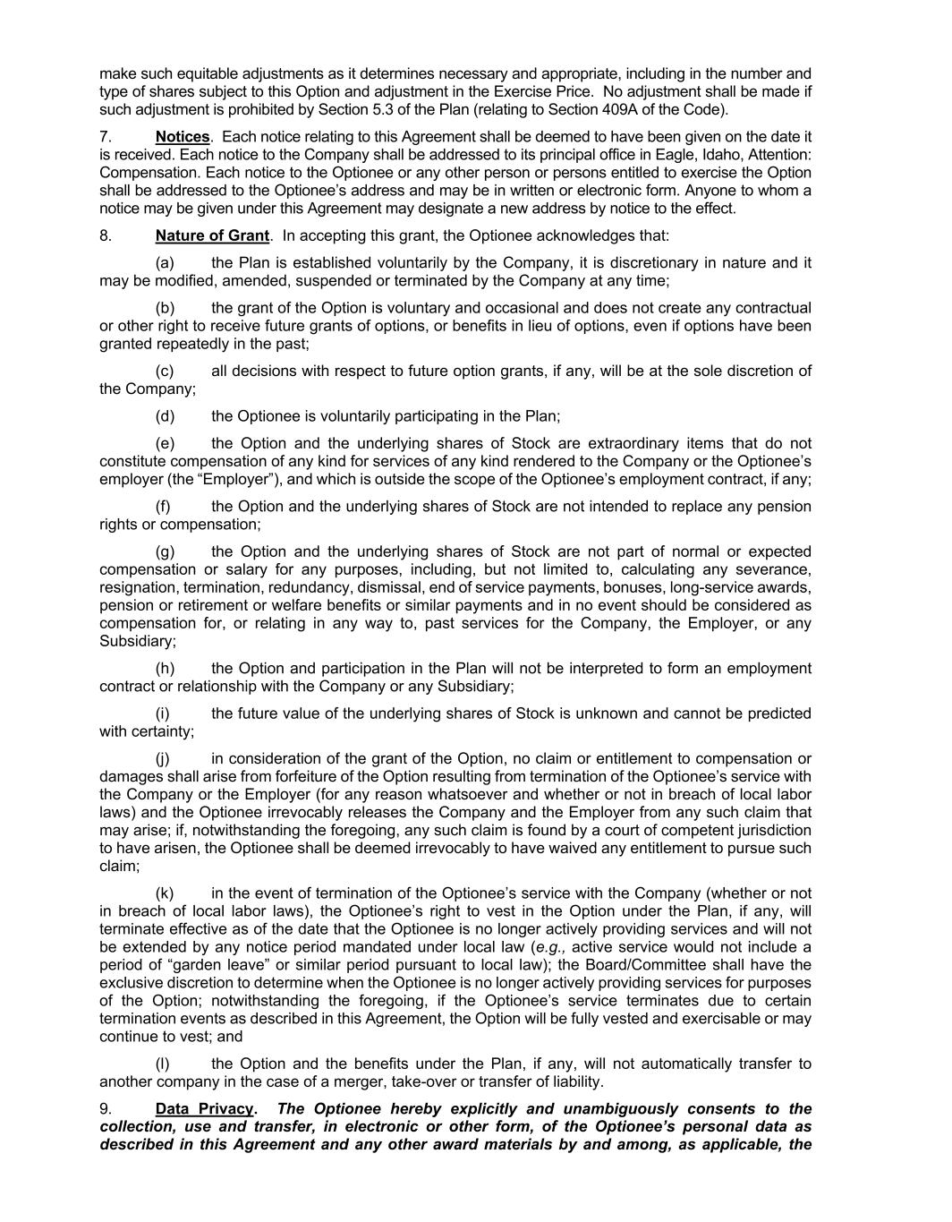 make such equitable adjustments as it determines necessary and appropriate, including in the number and type of shares subject to this Option and adjustment in the Exercise Price. No adjustment shall be made if such adjustment is prohibited by Section 5.3 of the Plan (relating to Section 409A of the Code). 7. Notices. Each notice relating to this Agreement shall be deemed to have been given on the date it is received. Each notice to the Company shall be addressed to its principal office in Eagle, Idaho, Attention: Compensation. Each notice to the Optionee or any other person or persons entitled to exercise the Option shall be addressed to the Optionee’s address and may be in written or electronic form. Anyone to whom a notice may be given under this Agreement may designate a new address by notice to the effect. 8. Nature of Grant. In accepting this grant, the Optionee acknowledges that: (a) the Plan is established voluntarily by the Company, it is discretionary in nature and it may be modified, amended, suspended or terminated by the Company at any time; (b) the grant of the Option is voluntary and occasional and does not create any contractual or other right to receive future grants of options, or benefits in lieu of options, even if options have been granted repeatedly in the past; (c) all decisions with respect to future option grants, if any, will be at the sole discretion of the Company; (d) the Optionee is voluntarily participating in the Plan; (e) the Option and the underlying shares of Stock are extraordinary items that do not constitute compensation of any kind for services of any kind rendered to the Company or the Optionee’s employer (the “Employer”), and which is outside the scope of the Optionee’s employment contract, if any; (f) the Option and the underlying shares of Stock are not intended to replace any pension rights or compensation; (g) the Option and the underlying shares of Stock are not part of normal or expected compensation or salary for any purposes, including, but not limited to, calculating any severance, resignation, termination, redundancy, dismissal, end of service payments, bonuses, long-service awards, pension or retirement or welfare benefits or similar payments and in no event should be considered as compensation for, or relating in any way to, past services for the Company, the Employer, or any Subsidiary; (h) the Option and participation in the Plan will not be interpreted to form an employment contract or relationship with the Company or any Subsidiary; (i) the future value of the underlying shares of Stock is unknown and cannot be predicted with certainty; (j) in consideration of the grant of the Option, no claim or entitlement to compensation or damages shall arise from forfeiture of the Option resulting from termination of the Optionee’s service with the Company or the Employer (for any reason whatsoever and whether or not in breach of local labor laws) and the Optionee irrevocably releases the Company and the Employer from any such claim that may arise; if, notwithstanding the foregoing, any such claim is found by a court of competent jurisdiction to have arisen, the Optionee shall be deemed irrevocably to have waived any entitlement to pursue such claim; (k) in the event of termination of the Optionee’s service with the Company (whether or not in breach of local labor laws), the Optionee’s right to vest in the Option under the Plan, if any, will terminate effective as of the date that the Optionee is no longer actively providing services and will not be extended by any notice period mandated under local law (e.g., active service would not include a period of “garden leave” or similar period pursuant to local law); the Board/Committee shall have the exclusive discretion to determine when the Optionee is no longer actively providing services for purposes of the Option; notwithstanding the foregoing, if the Optionee’s service terminates due to certain termination events as described in this Agreement, the Option will be fully vested and exercisable or may continue to vest; and (l) the Option and the benefits under the Plan, if any, will not automatically transfer to another company in the case of a merger, take-over or transfer of liability. 9. Data Privacy. The Optionee hereby explicitly and unambiguously consents to the collection, use and transfer, in electronic or other form, of the Optionee’s personal data as described in this Agreement and any other award materials by and among, as applicable, the