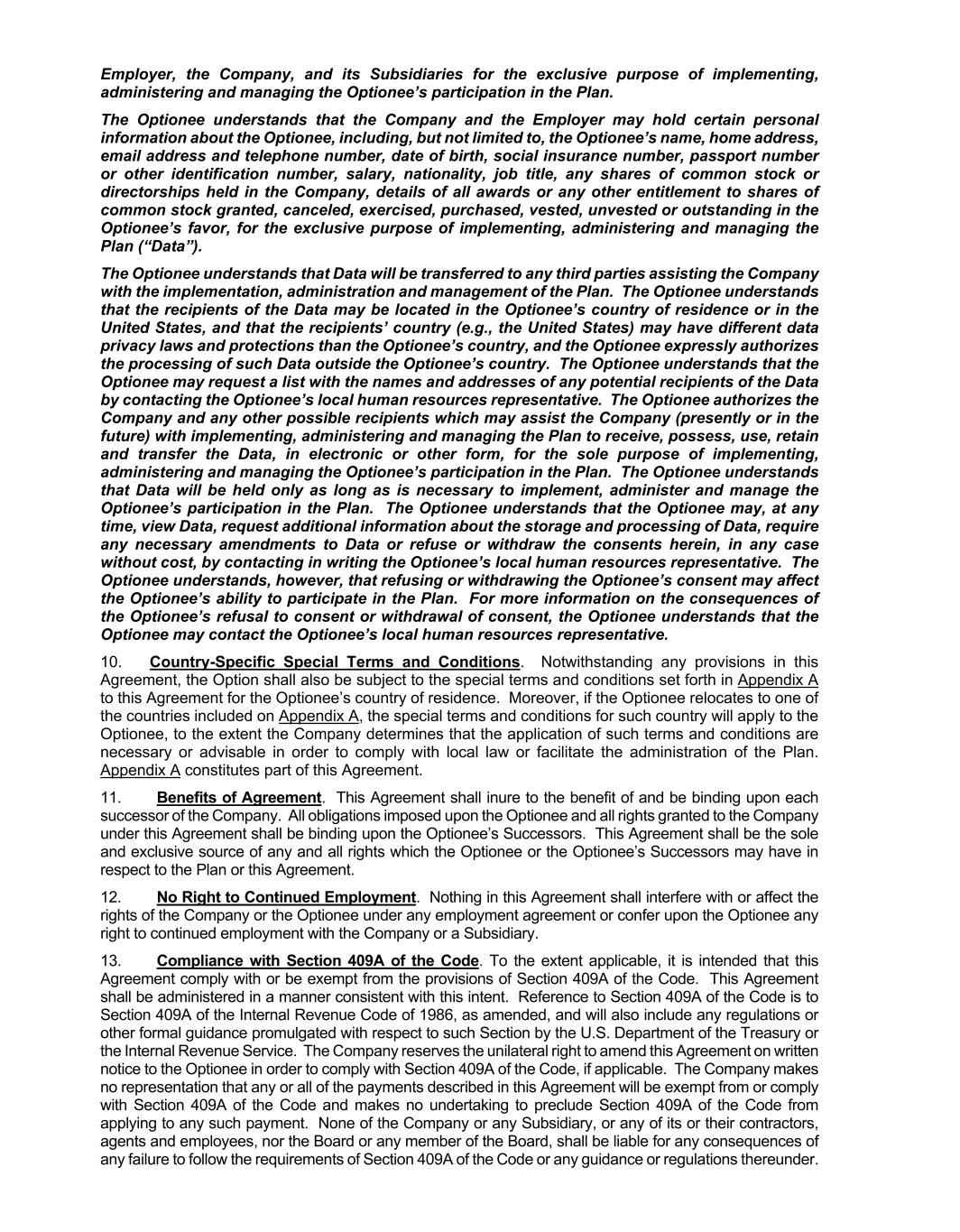 Employer, the Company, and its Subsidiaries for the exclusive purpose of implementing, administering and managing the Optionee’s participation in the Plan. The Optionee understands that the Company and the Employer may hold certain personal information about the Optionee, including, but not limited to, the Optionee’s name, home address, email address and telephone number, date of birth, social insurance number, passport number or other identification number, salary, nationality, job title, any shares of common stock or directorships held in the Company, details of all awards or any other entitlement to shares of common stock granted, canceled, exercised, purchased, vested, unvested or outstanding in the Optionee’s favor, for the exclusive purpose of implementing, administering and managing the Plan (“Data”). The Optionee understands that Data will be transferred to any third parties assisting the Company with the implementation, administration and management of the Plan. The Optionee understands that the recipients of the Data may be located in the Optionee’s country of residence or in the United States, and that the recipients’ country (e.g., the United States) may have different data privacy laws and protections than the Optionee’s country, and the Optionee expressly authorizes the processing of such Data outside the Optionee’s country. The Optionee understands that the Optionee may request a list with the names and addresses of any potential recipients of the Data by contacting the Optionee’s local human resources representative. The Optionee authorizes the Company and any other possible recipients which may assist the Company (presently or in the future) with implementing, administering and managing the Plan to receive, possess, use, retain and transfer the Data, in electronic or other form, for the sole purpose of implementing, administering and managing the Optionee’s participation in the Plan. The Optionee understands that Data will be held only as long as is necessary to implement, administer and manage the Optionee’s participation in the Plan. The Optionee understands that the Optionee may, at any time, view Data, request additional information about the storage and processing of Data, require any necessary amendments to Data or refuse or withdraw the consents herein, in any case without cost, by contacting in writing the Optionee’s local human resources representative. The Optionee understands, however, that refusing or withdrawing the Optionee’s consent may affect the Optionee’s ability to participate in the Plan. For more information on the consequences of the Optionee’s refusal to consent or withdrawal of consent, the Optionee understands that the Optionee may contact the Optionee’s local human resources representative. 10. Country-Specific Special Terms and Conditions. Notwithstanding any provisions in this Agreement, the Option shall also be subject to the special terms and conditions set forth in Appendix A to this Agreement for the Optionee’s country of residence. Moreover, if the Optionee relocates to one of the countries included on Appendix A, the special terms and conditions for such country will apply to the Optionee, to the extent the Company determines that the application of such terms and conditions are necessary or advisable in order to comply with local law or facilitate the administration of the Plan. Appendix A constitutes part of this Agreement. 11. Benefits of Agreement. This Agreement shall inure to the benefit of and be binding upon each successor of the Company. All obligations imposed upon the Optionee and all rights granted to the Company under this Agreement shall be binding upon the Optionee’s Successors. This Agreement shall be the sole and exclusive source of any and all rights which the Optionee or the Optionee’s Successors may have in respect to the Plan or this Agreement. 12. No Right to Continued Employment. Nothing in this Agreement shall interfere with or affect the rights of the Company or the Optionee under any employment agreement or confer upon the Optionee any right to continued employment with the Company or a Subsidiary. 13. Compliance with Section 409A of the Code. To the extent applicable, it is intended that this Agreement comply with or be exempt from the provisions of Section 409A of the Code. This Agreement shall be administered in a manner consistent with this intent. Reference to Section 409A of the Code is to Section 409A of the Internal Revenue Code of 1986, as amended, and will also include any regulations or other formal guidance promulgated with respect to such Section by the U.S. Department of the Treasury or the Internal Revenue Service. The Company reserves the unilateral right to amend this Agreement on written notice to the Optionee in order to comply with Section 409A of the Code, if applicable. The Company makes no representation that any or all of the payments described in this Agreement will be exempt from or comply with Section 409A of the Code and makes no undertaking to preclude Section 409A of the Code from applying to any such payment. None of the Company or any Subsidiary, or any of its or their contractors, agents and employees, nor the Board or any member of the Board, shall be liable for any consequences of any failure to follow the requirements of Section 409A of the Code or any guidance or regulations thereunder.