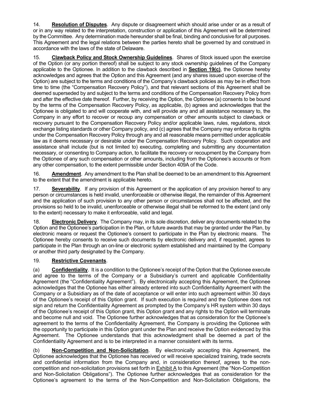 14. Resolution of Disputes. Any dispute or disagreement which should arise under or as a result of or in any way related to the interpretation, construction or application of this Agreement will be determined by the Committee. Any determination made hereunder shall be final, binding and conclusive for all purposes. This Agreement and the legal relations between the parties hereto shall be governed by and construed in accordance with the laws of the state of Delaware. 15. Clawback Policy and Stock Ownership Guidelines. Shares of Stock issued upon the exercise of the Option (or any portion thereof) shall be subject to any stock ownership guidelines of the Company applicable to the Optionee. In addition to the clawback described in Section 19(c), the Optionee hereby acknowledges and agrees that the Option and this Agreement (and any shares issued upon exercise of the Option) are subject to the terms and conditions of the Company’s clawback policies as may be in effect from time to time (the “Compensation Recovery Policy”), and that relevant sections of this Agreement shall be deemed superseded by and subject to the terms and conditions of the Compensation Recovery Policy from and after the effective date thereof. Further, by receiving the Option, the Optionee (a) consents to be bound by the terms of the Compensation Recovery Policy, as applicable, (b) agrees and acknowledges that the Optionee is obligated to and will cooperate with, and will provide any and all assistance necessary to, the Company in any effort to recover or recoup any compensation or other amounts subject to clawback or recovery pursuant to the Compensation Recovery Policy and/or applicable laws, rules, regulations, stock exchange listing standards or other Company policy, and (c) agrees that the Company may enforce its rights under the Compensation Recovery Policy through any and all reasonable means permitted under applicable law as it deems necessary or desirable under the Compensation Recovery Policy. Such cooperation and assistance shall include (but is not limited to) executing, completing and submitting any documentation necessary, or consenting to Company action, to facilitate the recovery or recoupment by the Company from the Optionee of any such compensation or other amounts, including from the Optionee’s accounts or from any other compensation, to the extent permissible under Section 409A of the Code. 16. Amendment. Any amendment to the Plan shall be deemed to be an amendment to this Agreement to the extent that the amendment is applicable hereto. 17. Severability. If any provision of this Agreement or the application of any provision hereof to any person or circumstances is held invalid, unenforceable or otherwise illegal, the remainder of this Agreement and the application of such provision to any other person or circumstances shall not be affected, and the provisions so held to be invalid, unenforceable or otherwise illegal shall be reformed to the extent (and only to the extent) necessary to make it enforceable, valid and legal. 18. Electronic Delivery. The Company may, in its sole discretion, deliver any documents related to the Option and the Optionee’s participation in the Plan, or future awards that may be granted under the Plan, by electronic means or request the Optionee’s consent to participate in the Plan by electronic means. The Optionee hereby consents to receive such documents by electronic delivery and, if requested, agrees to participate in the Plan through an on-line or electronic system established and maintained by the Company or another third party designated by the Company. 19. Restrictive Covenants. (a) Confidentiality. It is a condition to the Optionee’s receipt of the Option that the Optionee execute and agree to the terms of the Company or a Subsidiary’s current and applicable Confidentiality Agreement (the “Confidentiality Agreement”). By electronically accepting this Agreement, the Optionee acknowledges that the Optionee has either already entered into such Confidentiality Agreement with the Company or a Subsidiary as of the date of acceptance or will enter into such agreement within 30 days of the Optionee’s receipt of this Option grant. If such execution is required and the Optionee does not sign and return the Confidentiality Agreement as prompted by the Company’s HR system within 30 days of the Optionee’s receipt of this Option grant, this Option grant and any rights to the Option will terminate and become null and void. The Optionee further acknowledges that as consideration for the Optionee’s agreement to the terms of the Confidentiality Agreement, the Company is providing the Optionee with the opportunity to participate in this Option grant under the Plan and receive the Option evidenced by this Agreement. The Optionee understands that this acknowledgment shall be deemed a part of the Confidentiality Agreement and is to be interpreted in a manner consistent with its terms. (b) Non-Competition and Non-Solicitation. By electronically accepting this Agreement, the Optionee acknowledges that the Optionee has received or will receive specialized training, trade secrets and confidential information from the Company and, in consideration thereof, agrees to the non- competition and non-solicitation provisions set forth in Exhibit A to this Agreement (the “Non-Competition and Non-Solicitation Obligations”). The Optionee further acknowledges that as consideration for the Optionee’s agreement to the terms of the Non-Competition and Non-Solicitation Obligations, the