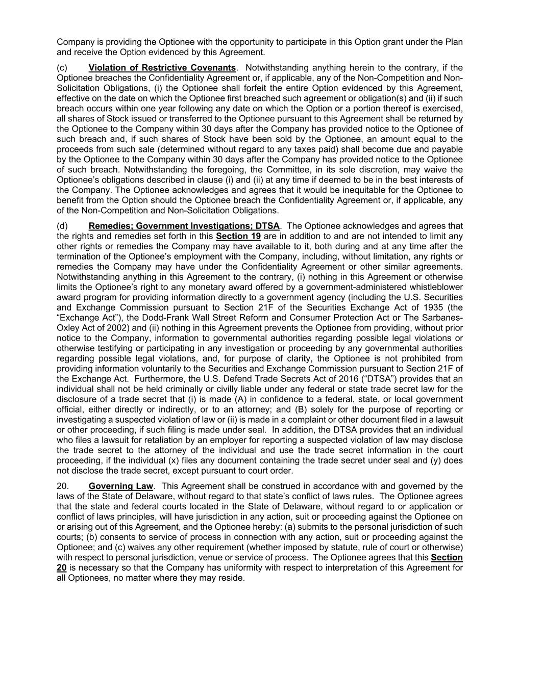 Company is providing the Optionee with the opportunity to participate in this Option grant under the Plan and receive the Option evidenced by this Agreement. (c) Violation of Restrictive Covenants. Notwithstanding anything herein to the contrary, if the Optionee breaches the Confidentiality Agreement or, if applicable, any of the Non-Competition and Non- Solicitation Obligations, (i) the Optionee shall forfeit the entire Option evidenced by this Agreement, effective on the date on which the Optionee first breached such agreement or obligation(s) and (ii) if such breach occurs within one year following any date on which the Option or a portion thereof is exercised, all shares of Stock issued or transferred to the Optionee pursuant to this Agreement shall be returned by the Optionee to the Company within 30 days after the Company has provided notice to the Optionee of such breach and, if such shares of Stock have been sold by the Optionee, an amount equal to the proceeds from such sale (determined without regard to any taxes paid) shall become due and payable by the Optionee to the Company within 30 days after the Company has provided notice to the Optionee of such breach. Notwithstanding the foregoing, the Committee, in its sole discretion, may waive the Optionee’s obligations described in clause (i) and (ii) at any time if deemed to be in the best interests of the Company. The Optionee acknowledges and agrees that it would be inequitable for the Optionee to benefit from the Option should the Optionee breach the Confidentiality Agreement or, if applicable, any of the Non-Competition and Non-Solicitation Obligations. (d) Remedies; Government Investigations; DTSA. The Optionee acknowledges and agrees that the rights and remedies set forth in this Section 19 are in addition to and are not intended to limit any other rights or remedies the Company may have available to it, both during and at any time after the termination of the Optionee’s employment with the Company, including, without limitation, any rights or remedies the Company may have under the Confidentiality Agreement or other similar agreements. Notwithstanding anything in this Agreement to the contrary, (i) nothing in this Agreement or otherwise limits the Optionee’s right to any monetary award offered by a government-administered whistleblower award program for providing information directly to a government agency (including the U.S. Securities and Exchange Commission pursuant to Section 21F of the Securities Exchange Act of 1935 (the “Exchange Act”), the Dodd-Frank Wall Street Reform and Consumer Protection Act or The Sarbanes- Oxley Act of 2002) and (ii) nothing in this Agreement prevents the Optionee from providing, without prior notice to the Company, information to governmental authorities regarding possible legal violations or otherwise testifying or participating in any investigation or proceeding by any governmental authorities regarding possible legal violations, and, for purpose of clarity, the Optionee is not prohibited from providing information voluntarily to the Securities and Exchange Commission pursuant to Section 21F of the Exchange Act. Furthermore, the U.S. Defend Trade Secrets Act of 2016 (“DTSA”) provides that an individual shall not be held criminally or civilly liable under any federal or state trade secret law for the disclosure of a trade secret that (i) is made (A) in confidence to a federal, state, or local government official, either directly or indirectly, or to an attorney; and (B) solely for the purpose of reporting or investigating a suspected violation of law or (ii) is made in a complaint or other document filed in a lawsuit or other proceeding, if such filing is made under seal. In addition, the DTSA provides that an individual who files a lawsuit for retaliation by an employer for reporting a suspected violation of law may disclose the trade secret to the attorney of the individual and use the trade secret information in the court proceeding, if the individual (x) files any document containing the trade secret under seal and (y) does not disclose the trade secret, except pursuant to court order. 20. Governing Law. This Agreement shall be construed in accordance with and governed by the laws of the State of Delaware, without regard to that state’s conflict of laws rules. The Optionee agrees that the state and federal courts located in the State of Delaware, without regard to or application or conflict of laws principles, will have jurisdiction in any action, suit or proceeding against the Optionee on or arising out of this Agreement, and the Optionee hereby: (a) submits to the personal jurisdiction of such courts; (b) consents to service of process in connection with any action, suit or proceeding against the Optionee; and (c) waives any other requirement (whether imposed by statute, rule of court or otherwise) with respect to personal jurisdiction, venue or service of process. The Optionee agrees that this Section 20 is necessary so that the Company has uniformity with respect to interpretation of this Agreement for all Optionees, no matter where they may reside.