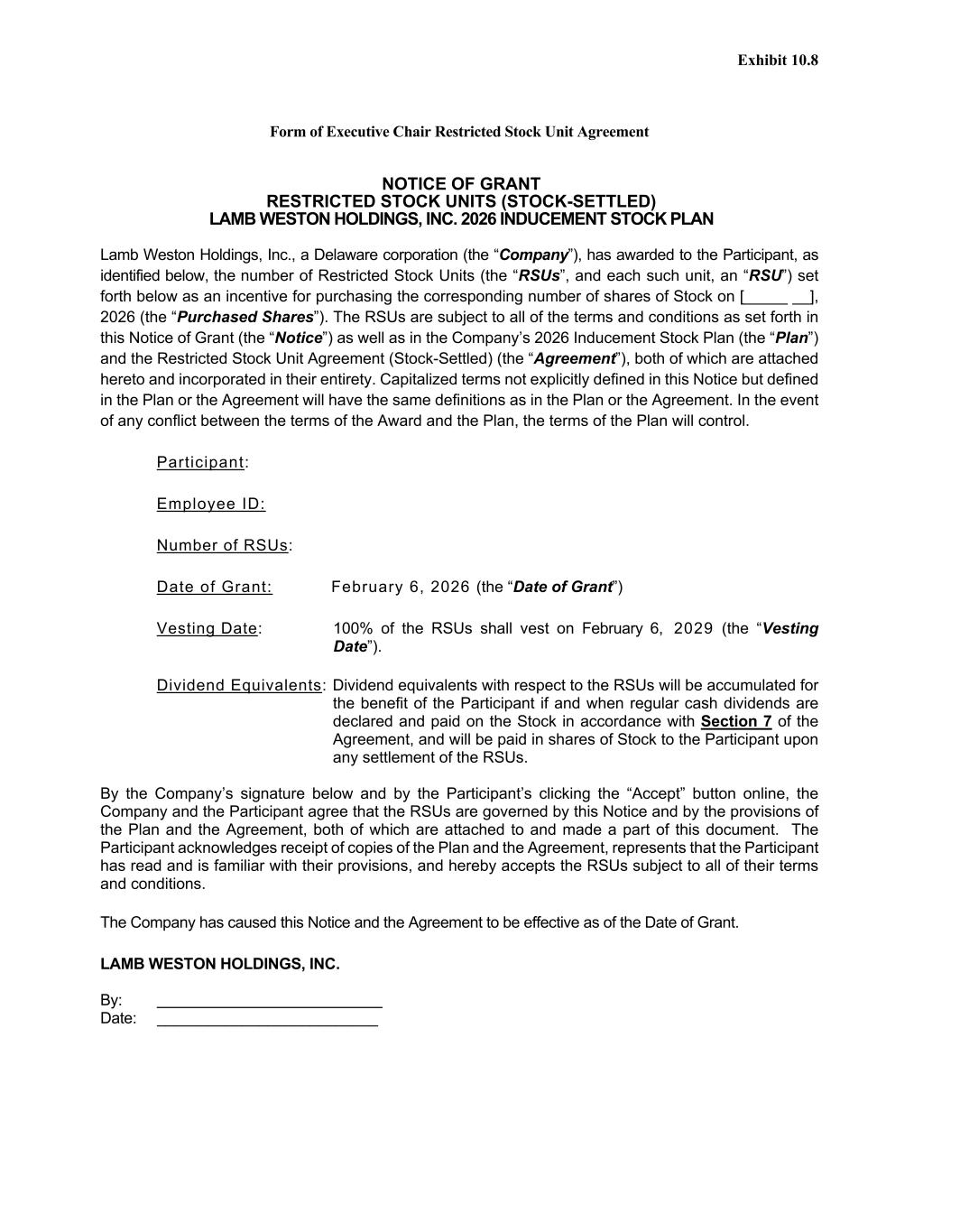 Exhibit 10.8 Form of Executive Chair Restricted Stock Unit Agreement NOTICE OF GRANT RESTRICTED STOCK UNITS (STOCK-SETTLED) LAMB WESTON HOLDINGS, INC. 2026 INDUCEMENT STOCK PLAN Lamb Weston Holdings, Inc., a Delaware corporation (the “Company”), has awarded to the Participant, as identified below, the number of Restricted Stock Units (the “RSUs”, and each such unit, an “RSU”) set forth below as an incentive for purchasing the corresponding number of shares of Stock on [_____ __], 2026 (the “Purchased Shares”). The RSUs are subject to all of the terms and conditions as set forth in this Notice of Grant (the “Notice”) as well as in the Company’s 2026 Inducement Stock Plan (the “Plan”) and the Restricted Stock Unit Agreement (Stock-Settled) (the “Agreement”), both of which are attached hereto and incorporated in their entirety. Capitalized terms not explicitly defined in this Notice but defined in the Plan or the Agreement will have the same definitions as in the Plan or the Agreement. In the event of any conflict between the terms of the Award and the Plan, the terms of the Plan will control. Participant: Employee ID: Number of RSUs: Date of Grant: February 6, 2026 (the “Date of Grant”) Vesting Date: 100% of the RSUs shall vest on February 6, 2029 (the “Vesting Date”). Dividend Equivalents: Dividend equivalents with respect to the RSUs will be accumulated for the benefit of the Participant if and when regular cash dividends are declared and paid on the Stock in accordance with Section 7 of the Agreement, and will be paid in shares of Stock to the Participant upon any settlement of the RSUs. By the Company’s signature below and by the Participant’s clicking the “Accept” button online, the Company and the Participant agree that the RSUs are governed by this Notice and by the provisions of the Plan and the Agreement, both of which are attached to and made a part of this document. The Participant acknowledges receipt of copies of the Plan and the Agreement, represents that the Participant has read and is familiar with their provisions, and hereby accepts the RSUs subject to all of their terms and conditions. The Company has caused this Notice and the Agreement to be effective as of the Date of Grant. LAMB WESTON HOLDINGS, INC. By: Date: __________________________