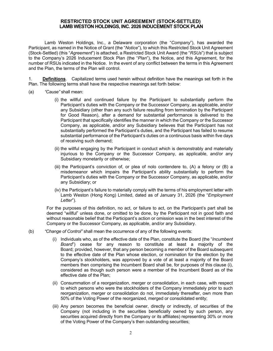2 RESTRICTED STOCK UNIT AGREEMENT (STOCK-SETTLED) LAMB WESTON HOLDINGS, INC. 2026 INDUCEMENT STOCK PLAN Lamb Weston Holdings, Inc., a Delaware corporation (the “Company”), has awarded the Participant, as named in the Notice of Grant (the “Notice”), to which this Restricted Stock Unit Agreement (Stock-Settled) (this “Agreement”) is attached, a Restricted Stock Unit Award (the “RSUs”) that is subject to the Company’s 2026 Inducement Stock Plan (the “Plan”), the Notice, and this Agreement, for the number of RSUs indicated in the Notice. In the event of any conflict between the terms in this Agreement and the Plan, the terms of the Plan will control. 1. Definitions. Capitalized terms used herein without definition have the meanings set forth in the Plan. The following terms shall have the respective meanings set forth below: (a) “Cause” shall mean: (i) the willful and continued failure by the Participant to substantially perform the Participant’s duties with the Company or the Successor Company, as applicable, and/or any Subsidiary (other than any such failure resulting from termination by the Participant for Good Reason), after a demand for substantial performance is delivered to the Participant that specifically identifies the manner in which the Company or the Successor Company, as applicable, and/or any Subsidiary believes that the Participant has not substantially performed the Participant’s duties, and the Participant has failed to resume substantial performance of the Participant’s duties on a continuous basis within five days of receiving such demand; (ii) the willful engaging by the Participant in conduct which is demonstrably and materially injurious to the Company or the Successor Company, as applicable, and/or any Subsidiary monetarily or otherwise; (iii) the Participant’s conviction of, or plea of nolo contendere to, (A) a felony or (B) a misdemeanor which impairs the Participant’s ability substantially to perform the Participant’s duties with the Company or the Successor Company, as applicable, and/or any Subsidiary; or (iv) the Participant’s failure to materially comply with the terms of his employment letter with Lamb Weston (Hong Kong) Limited, dated as of January 31, 2026 (the “Employment Letter”). For the purposes of this definition, no act, or failure to act, on the Participant’s part shall be deemed “willful” unless done, or omitted to be done, by the Participant not in good faith and without reasonable belief that the Participant’s action or omission was in the best interest of the Company or the Successor Company, as applicable, and/or any Subsidiary. (b) “Change of Control” shall mean the occurrence of any of the following events: (i) Individuals who, as of the effective date of the Plan, constitute the Board (the “Incumbent Board”) cease for any reason to constitute at least a majority of the Board; provided, however, that any person becoming a member of the Board subsequent to the effective date of the Plan whose election, or nomination for the election by the Company’s stockholders, was approved by a vote of at least a majority of the Board members then comprising the Incumbent Board shall be, for purposes of this clause (i), considered as though such person were a member of the Incumbent Board as of the effective date of the Plan; (ii) Consummation of a reorganization, merger or consolidation, in each case, with respect to which persons who were the stockholders of the Company immediately prior to such reorganization, merger or consolidation do not, immediately thereafter, own more than 50% of the Voting Power of the reorganized, merged or consolidated entity; (iii) Any person becomes the beneficial owner, directly or indirectly, of securities of the Company (not including in the securities beneficially owned by such person, any securities acquired directly from the Company or its affiliates) representing 30% or more of the Voting Power of the Company’s then outstanding securities;