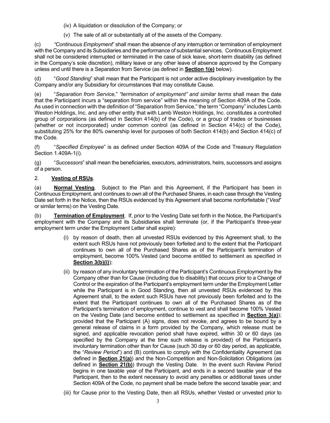 3 (iv) A liquidation or dissolution of the Company; or (v) The sale of all or substantially all of the assets of the Company. (c) “Continuous Employment” shall mean the absence of any interruption or termination of employment with the Company and its Subsidiaries and the performance of substantial services. Continuous Employment shall not be considered interrupted or terminated in the case of sick leave, short-term disability (as defined in the Company’s sole discretion), military leave or any other leave of absence approved by the Company unless and until there is a Separation from Service (as defined in Section 1(e) below). (d) “Good Standing” shall mean that the Participant is not under active disciplinary investigation by the Company and/or any Subsidiary for circumstances that may constitute Cause. (e) “Separation from Service,” “termination of employment” and similar terms shall mean the date that the Participant incurs a “separation from service” within the meaning of Section 409A of the Code. As used in connection with the definition of “Separation from Service,” the term “Company” includes Lamb Weston Holdings, Inc. and any other entity that with Lamb Weston Holdings, Inc. constitutes a controlled group of corporations (as defined in Section 414(b) of the Code), or a group of trades or businesses (whether or not incorporated) under common control (as defined in Section 414(c) of the Code), substituting 25% for the 80% ownership level for purposes of both Section 414(b) and Section 414(c) of the Code. (f) “Specified Employee” is as defined under Section 409A of the Code and Treasury Regulation Section 1.409A-1(i). (g) “Successors” shall mean the beneficiaries, executors, administrators, heirs, successors and assigns of a person. 2. Vesting of RSUs. (a) Normal Vesting. Subject to the Plan and this Agreement, if the Participant has been in Continuous Employment, and continues to own all of the Purchased Shares, in each case through the Vesting Date set forth in the Notice, then the RSUs evidenced by this Agreement shall become nonforfeitable (“Vest” or similar terms) on the Vesting Date. (b) Termination of Employment. If, prior to the Vesting Date set forth in the Notice, the Participant’s employment with the Company and its Subsidiaries shall terminate (or, if the Participant’s three-year employment term under the Employment Letter shall expire): (i) by reason of death, then all unvested RSUs evidenced by this Agreement shall, to the extent such RSUs have not previously been forfeited and to the extent that the Participant continues to own all of the Purchased Shares as of the Participant’s termination of employment, become 100% Vested (and become entitled to settlement as specified in Section 3(b)(i)); (ii) by reason of any involuntary termination of the Participant’s Continuous Employment by the Company other than for Cause (including due to disability) that occurs prior to a Change of Control or the expiration of the Participant’s employment term under the Employment Letter while the Participant is in Good Standing, then all unvested RSUs evidenced by this Agreement shall, to the extent such RSUs have not previously been forfeited and to the extent that the Participant continues to own all of the Purchased Shares as of the Participant’s termination of employment, continue to vest and shall become 100% Vested on the Vesting Date (and become entitled to settlement as specified in Section 3(a)); provided that the Participant (A) signs, does not revoke, and agrees to be bound by a general release of claims in a form provided by the Company, which release must be signed, and applicable revocation period shall have expired, within 30 or 60 days (as specified by the Company at the time such release is provided) of the Participant’s involuntary termination other than for Cause (such 30 day or 60 day period, as applicable, the “Review Period”) and (B) continues to comply with the Confidentiality Agreement (as defined in Section 21(a)) and the Non-Competition and Non-Solicitation Obligations (as defined in Section 21(b)) through the Vesting Date. In the event such Review Period begins in one taxable year of the Participant, and ends in a second taxable year of the Participant, then to the extent necessary to avoid any penalties or additional taxes under Section 409A of the Code, no payment shall be made before the second taxable year; and (iii) for Cause prior to the Vesting Date, then all RSUs, whether Vested or unvested prior to