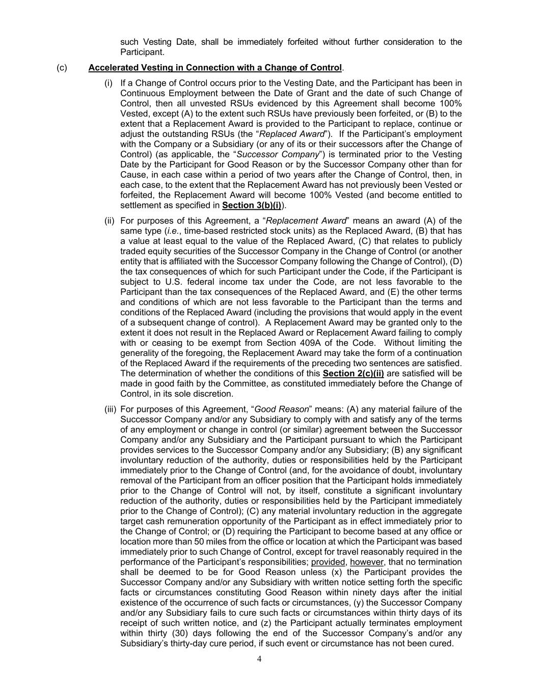 4 such Vesting Date, shall be immediately forfeited without further consideration to the Participant. (c) Accelerated Vesting in Connection with a Change of Control. (i) If a Change of Control occurs prior to the Vesting Date, and the Participant has been in Continuous Employment between the Date of Grant and the date of such Change of Control, then all unvested RSUs evidenced by this Agreement shall become 100% Vested, except (A) to the extent such RSUs have previously been forfeited, or (B) to the extent that a Replacement Award is provided to the Participant to replace, continue or adjust the outstanding RSUs (the “Replaced Award”). If the Participant’s employment with the Company or a Subsidiary (or any of its or their successors after the Change of Control) (as applicable, the “Successor Company”) is terminated prior to the Vesting Date by the Participant for Good Reason or by the Successor Company other than for Cause, in each case within a period of two years after the Change of Control, then, in each case, to the extent that the Replacement Award has not previously been Vested or forfeited, the Replacement Award will become 100% Vested (and become entitled to settlement as specified in Section 3(b)(i)). (ii) For purposes of this Agreement, a “Replacement Award” means an award (A) of the same type (i.e., time-based restricted stock units) as the Replaced Award, (B) that has a value at least equal to the value of the Replaced Award, (C) that relates to publicly traded equity securities of the Successor Company in the Change of Control (or another entity that is affiliated with the Successor Company following the Change of Control), (D) the tax consequences of which for such Participant under the Code, if the Participant is subject to U.S. federal income tax under the Code, are not less favorable to the Participant than the tax consequences of the Replaced Award, and (E) the other terms and conditions of which are not less favorable to the Participant than the terms and conditions of the Replaced Award (including the provisions that would apply in the event of a subsequent change of control). A Replacement Award may be granted only to the extent it does not result in the Replaced Award or Replacement Award failing to comply with or ceasing to be exempt from Section 409A of the Code. Without limiting the generality of the foregoing, the Replacement Award may take the form of a continuation of the Replaced Award if the requirements of the preceding two sentences are satisfied. The determination of whether the conditions of this Section 2(c)(ii) are satisfied will be made in good faith by the Committee, as constituted immediately before the Change of Control, in its sole discretion. (iii) For purposes of this Agreement, “Good Reason” means: (A) any material failure of the Successor Company and/or any Subsidiary to comply with and satisfy any of the terms of any employment or change in control (or similar) agreement between the Successor Company and/or any Subsidiary and the Participant pursuant to which the Participant provides services to the Successor Company and/or any Subsidiary; (B) any significant involuntary reduction of the authority, duties or responsibilities held by the Participant immediately prior to the Change of Control (and, for the avoidance of doubt, involuntary removal of the Participant from an officer position that the Participant holds immediately prior to the Change of Control will not, by itself, constitute a significant involuntary reduction of the authority, duties or responsibilities held by the Participant immediately prior to the Change of Control); (C) any material involuntary reduction in the aggregate target cash remuneration opportunity of the Participant as in effect immediately prior to the Change of Control; or (D) requiring the Participant to become based at any office or location more than 50 miles from the office or location at which the Participant was based immediately prior to such Change of Control, except for travel reasonably required in the performance of the Participant’s responsibilities; provided, however, that no termination shall be deemed to be for Good Reason unless (x) the Participant provides the Successor Company and/or any Subsidiary with written notice setting forth the specific facts or circumstances constituting Good Reason within ninety days after the initial existence of the occurrence of such facts or circumstances, (y) the Successor Company and/or any Subsidiary fails to cure such facts or circumstances within thirty days of its receipt of such written notice, and (z) the Participant actually terminates employment within thirty (30) days following the end of the Successor Company’s and/or any Subsidiary’s thirty-day cure period, if such event or circumstance has not been cured.