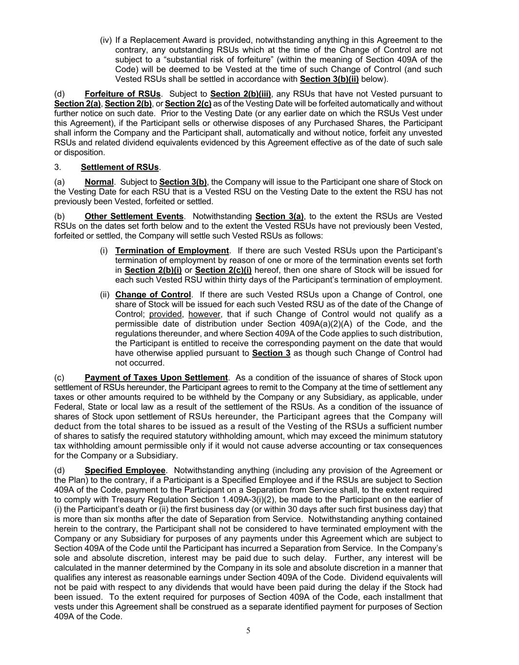 5 (iv) If a Replacement Award is provided, notwithstanding anything in this Agreement to the contrary, any outstanding RSUs which at the time of the Change of Control are not subject to a “substantial risk of forfeiture” (within the meaning of Section 409A of the Code) will be deemed to be Vested at the time of such Change of Control (and such Vested RSUs shall be settled in accordance with Section 3(b)(ii) below). (d) Forfeiture of RSUs. Subject to Section 2(b)(iii), any RSUs that have not Vested pursuant to Section 2(a), Section 2(b), or Section 2(c) as of the Vesting Date will be forfeited automatically and without further notice on such date. Prior to the Vesting Date (or any earlier date on which the RSUs Vest under this Agreement), if the Participant sells or otherwise disposes of any Purchased Shares, the Participant shall inform the Company and the Participant shall, automatically and without notice, forfeit any unvested RSUs and related dividend equivalents evidenced by this Agreement effective as of the date of such sale or disposition. 3. Settlement of RSUs. (a) Normal. Subject to Section 3(b), the Company will issue to the Participant one share of Stock on the Vesting Date for each RSU that is a Vested RSU on the Vesting Date to the extent the RSU has not previously been Vested, forfeited or settled. (b) Other Settlement Events. Notwithstanding Section 3(a), to the extent the RSUs are Vested RSUs on the dates set forth below and to the extent the Vested RSUs have not previously been Vested, forfeited or settled, the Company will settle such Vested RSUs as follows: (i) Termination of Employment. If there are such Vested RSUs upon the Participant’s termination of employment by reason of one or more of the termination events set forth in Section 2(b)(i) or Section 2(c)(i) hereof, then one share of Stock will be issued for each such Vested RSU within thirty days of the Participant’s termination of employment. (ii) Change of Control. If there are such Vested RSUs upon a Change of Control, one share of Stock will be issued for each such Vested RSU as of the date of the Change of Control; provided, however, that if such Change of Control would not qualify as a permissible date of distribution under Section 409A(a)(2)(A) of the Code, and the regulations thereunder, and where Section 409A of the Code applies to such distribution, the Participant is entitled to receive the corresponding payment on the date that would have otherwise applied pursuant to Section 3 as though such Change of Control had not occurred. (c) Payment of Taxes Upon Settlement. As a condition of the issuance of shares of Stock upon settlement of RSUs hereunder, the Participant agrees to remit to the Company at the time of settlement any taxes or other amounts required to be withheld by the Company or any Subsidiary, as applicable, under Federal, State or local law as a result of the settlement of the RSUs. As a condition of the issuance of shares of Stock upon settlement of RSUs hereunder, the Participant agrees that the Company will deduct from the total shares to be issued as a result of the Vesting of the RSUs a sufficient number of shares to satisfy the required statutory withholding amount, which may exceed the minimum statutory tax withholding amount permissible only if it would not cause adverse accounting or tax consequences for the Company or a Subsidiary. (d) Specified Employee. Notwithstanding anything (including any provision of the Agreement or the Plan) to the contrary, if a Participant is a Specified Employee and if the RSUs are subject to Section 409A of the Code, payment to the Participant on a Separation from Service shall, to the extent required to comply with Treasury Regulation Section 1.409A-3(i)(2), be made to the Participant on the earlier of (i) the Participant’s death or (ii) the first business day (or within 30 days after such first business day) that is more than six months after the date of Separation from Service. Notwithstanding anything contained herein to the contrary, the Participant shall not be considered to have terminated employment with the Company or any Subsidiary for purposes of any payments under this Agreement which are subject to Section 409A of the Code until the Participant has incurred a Separation from Service. In the Company’s sole and absolute discretion, interest may be paid due to such delay. Further, any interest will be calculated in the manner determined by the Company in its sole and absolute discretion in a manner that qualifies any interest as reasonable earnings under Section 409A of the Code. Dividend equivalents will not be paid with respect to any dividends that would have been paid during the delay if the Stock had been issued. To the extent required for purposes of Section 409A of the Code, each installment that vests under this Agreement shall be construed as a separate identified payment for purposes of Section 409A of the Code.