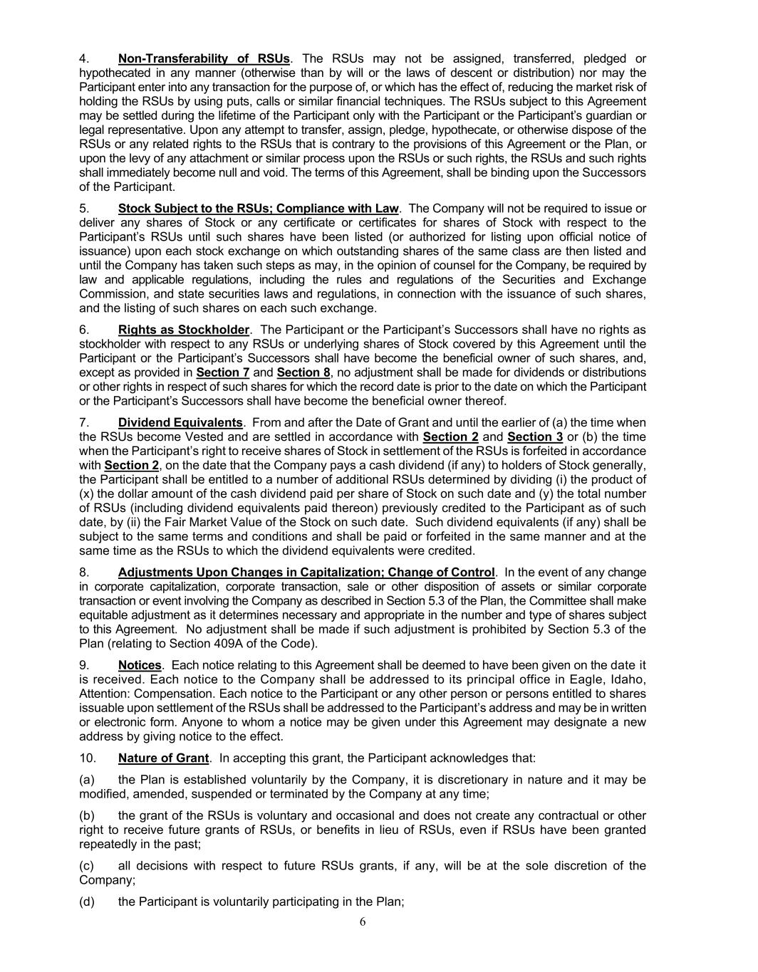 6 4. Non-Transferability of RSUs. The RSUs may not be assigned, transferred, pledged or hypothecated in any manner (otherwise than by will or the laws of descent or distribution) nor may the Participant enter into any transaction for the purpose of, or which has the effect of, reducing the market risk of holding the RSUs by using puts, calls or similar financial techniques. The RSUs subject to this Agreement may be settled during the lifetime of the Participant only with the Participant or the Participant’s guardian or legal representative. Upon any attempt to transfer, assign, pledge, hypothecate, or otherwise dispose of the RSUs or any related rights to the RSUs that is contrary to the provisions of this Agreement or the Plan, or upon the levy of any attachment or similar process upon the RSUs or such rights, the RSUs and such rights shall immediately become null and void. The terms of this Agreement, shall be binding upon the Successors of the Participant. 5. Stock Subject to the RSUs; Compliance with Law. The Company will not be required to issue or deliver any shares of Stock or any certificate or certificates for shares of Stock with respect to the Participant’s RSUs until such shares have been listed (or authorized for listing upon official notice of issuance) upon each stock exchange on which outstanding shares of the same class are then listed and until the Company has taken such steps as may, in the opinion of counsel for the Company, be required by law and applicable regulations, including the rules and regulations of the Securities and Exchange Commission, and state securities laws and regulations, in connection with the issuance of such shares, and the listing of such shares on each such exchange. 6. Rights as Stockholder. The Participant or the Participant’s Successors shall have no rights as stockholder with respect to any RSUs or underlying shares of Stock covered by this Agreement until the Participant or the Participant’s Successors shall have become the beneficial owner of such shares, and, except as provided in Section 7 and Section 8, no adjustment shall be made for dividends or distributions or other rights in respect of such shares for which the record date is prior to the date on which the Participant or the Participant’s Successors shall have become the beneficial owner thereof. 7. Dividend Equivalents. From and after the Date of Grant and until the earlier of (a) the time when the RSUs become Vested and are settled in accordance with Section 2 and Section 3 or (b) the time when the Participant’s right to receive shares of Stock in settlement of the RSUs is forfeited in accordance with Section 2, on the date that the Company pays a cash dividend (if any) to holders of Stock generally, the Participant shall be entitled to a number of additional RSUs determined by dividing (i) the product of (x) the dollar amount of the cash dividend paid per share of Stock on such date and (y) the total number of RSUs (including dividend equivalents paid thereon) previously credited to the Participant as of such date, by (ii) the Fair Market Value of the Stock on such date. Such dividend equivalents (if any) shall be subject to the same terms and conditions and shall be paid or forfeited in the same manner and at the same time as the RSUs to which the dividend equivalents were credited. 8. Adjustments Upon Changes in Capitalization; Change of Control. In the event of any change in corporate capitalization, corporate transaction, sale or other disposition of assets or similar corporate transaction or event involving the Company as described in Section 5.3 of the Plan, the Committee shall make equitable adjustment as it determines necessary and appropriate in the number and type of shares subject to this Agreement. No adjustment shall be made if such adjustment is prohibited by Section 5.3 of the Plan (relating to Section 409A of the Code). 9. Notices. Each notice relating to this Agreement shall be deemed to have been given on the date it is received. Each notice to the Company shall be addressed to its principal office in Eagle, Idaho, Attention: Compensation. Each notice to the Participant or any other person or persons entitled to shares issuable upon settlement of the RSUs shall be addressed to the Participant’s address and may be in written or electronic form. Anyone to whom a notice may be given under this Agreement may designate a new address by giving notice to the effect. 10. Nature of Grant. In accepting this grant, the Participant acknowledges that: (a) the Plan is established voluntarily by the Company, it is discretionary in nature and it may be modified, amended, suspended or terminated by the Company at any time; (b) the grant of the RSUs is voluntary and occasional and does not create any contractual or other right to receive future grants of RSUs, or benefits in lieu of RSUs, even if RSUs have been granted repeatedly in the past; (c) all decisions with respect to future RSUs grants, if any, will be at the sole discretion of the Company; (d) the Participant is voluntarily participating in the Plan;