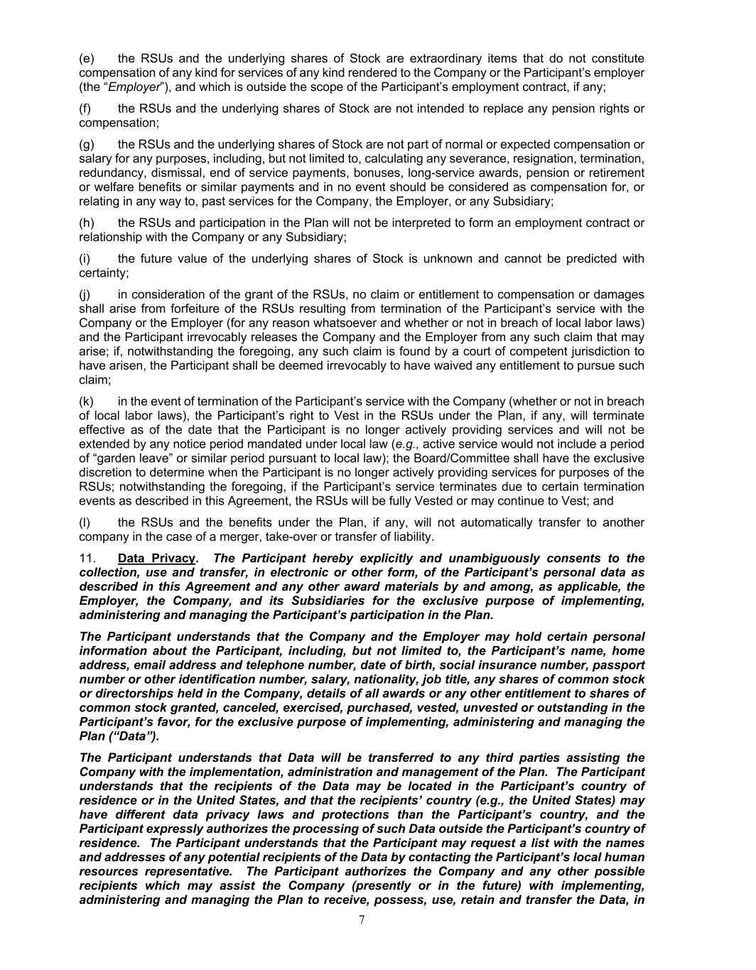 7 (e) the RSUs and the underlying shares of Stock are extraordinary items that do not constitute compensation of any kind for services of any kind rendered to the Company or the Participant’s employer (the “Employer”), and which is outside the scope of the Participant’s employment contract, if any; (f) the RSUs and the underlying shares of Stock are not intended to replace any pension rights or compensation; (g) the RSUs and the underlying shares of Stock are not part of normal or expected compensation or salary for any purposes, including, but not limited to, calculating any severance, resignation, termination, redundancy, dismissal, end of service payments, bonuses, long-service awards, pension or retirement or welfare benefits or similar payments and in no event should be considered as compensation for, or relating in any way to, past services for the Company, the Employer, or any Subsidiary; (h) the RSUs and participation in the Plan will not be interpreted to form an employment contract or relationship with the Company or any Subsidiary; (i) the future value of the underlying shares of Stock is unknown and cannot be predicted with certainty; (j) in consideration of the grant of the RSUs, no claim or entitlement to compensation or damages shall arise from forfeiture of the RSUs resulting from termination of the Participant’s service with the Company or the Employer (for any reason whatsoever and whether or not in breach of local labor laws) and the Participant irrevocably releases the Company and the Employer from any such claim that may arise; if, notwithstanding the foregoing, any such claim is found by a court of competent jurisdiction to have arisen, the Participant shall be deemed irrevocably to have waived any entitlement to pursue such claim; (k) in the event of termination of the Participant’s service with the Company (whether or not in breach of local labor laws), the Participant’s right to Vest in the RSUs under the Plan, if any, will terminate effective as of the date that the Participant is no longer actively providing services and will not be extended by any notice period mandated under local law (e.g., active service would not include a period of “garden leave” or similar period pursuant to local law); the Board/Committee shall have the exclusive discretion to determine when the Participant is no longer actively providing services for purposes of the RSUs; notwithstanding the foregoing, if the Participant’s service terminates due to certain termination events as described in this Agreement, the RSUs will be fully Vested or may continue to Vest; and (l) the RSUs and the benefits under the Plan, if any, will not automatically transfer to another company in the case of a merger, take-over or transfer of liability. 11. Data Privacy. The Participant hereby explicitly and unambiguously consents to the collection, use and transfer, in electronic or other form, of the Participant’s personal data as described in this Agreement and any other award materials by and among, as applicable, the Employer, the Company, and its Subsidiaries for the exclusive purpose of implementing, administering and managing the Participant’s participation in the Plan. The Participant understands that the Company and the Employer may hold certain personal information about the Participant, including, but not limited to, the Participant’s name, home address, email address and telephone number, date of birth, social insurance number, passport number or other identification number, salary, nationality, job title, any shares of common stock or directorships held in the Company, details of all awards or any other entitlement to shares of common stock granted, canceled, exercised, purchased, vested, unvested or outstanding in the Participant’s favor, for the exclusive purpose of implementing, administering and managing the Plan (“Data”). The Participant understands that Data will be transferred to any third parties assisting the Company with the implementation, administration and management of the Plan. The Participant understands that the recipients of the Data may be located in the Participant’s country of residence or in the United States, and that the recipients’ country (e.g., the United States) may have different data privacy laws and protections than the Participant’s country, and the Participant expressly authorizes the processing of such Data outside the Participant’s country of residence. The Participant understands that the Participant may request a list with the names and addresses of any potential recipients of the Data by contacting the Participant’s local human resources representative. The Participant authorizes the Company and any other possible recipients which may assist the Company (presently or in the future) with implementing, administering and managing the Plan to receive, possess, use, retain and transfer the Data, in