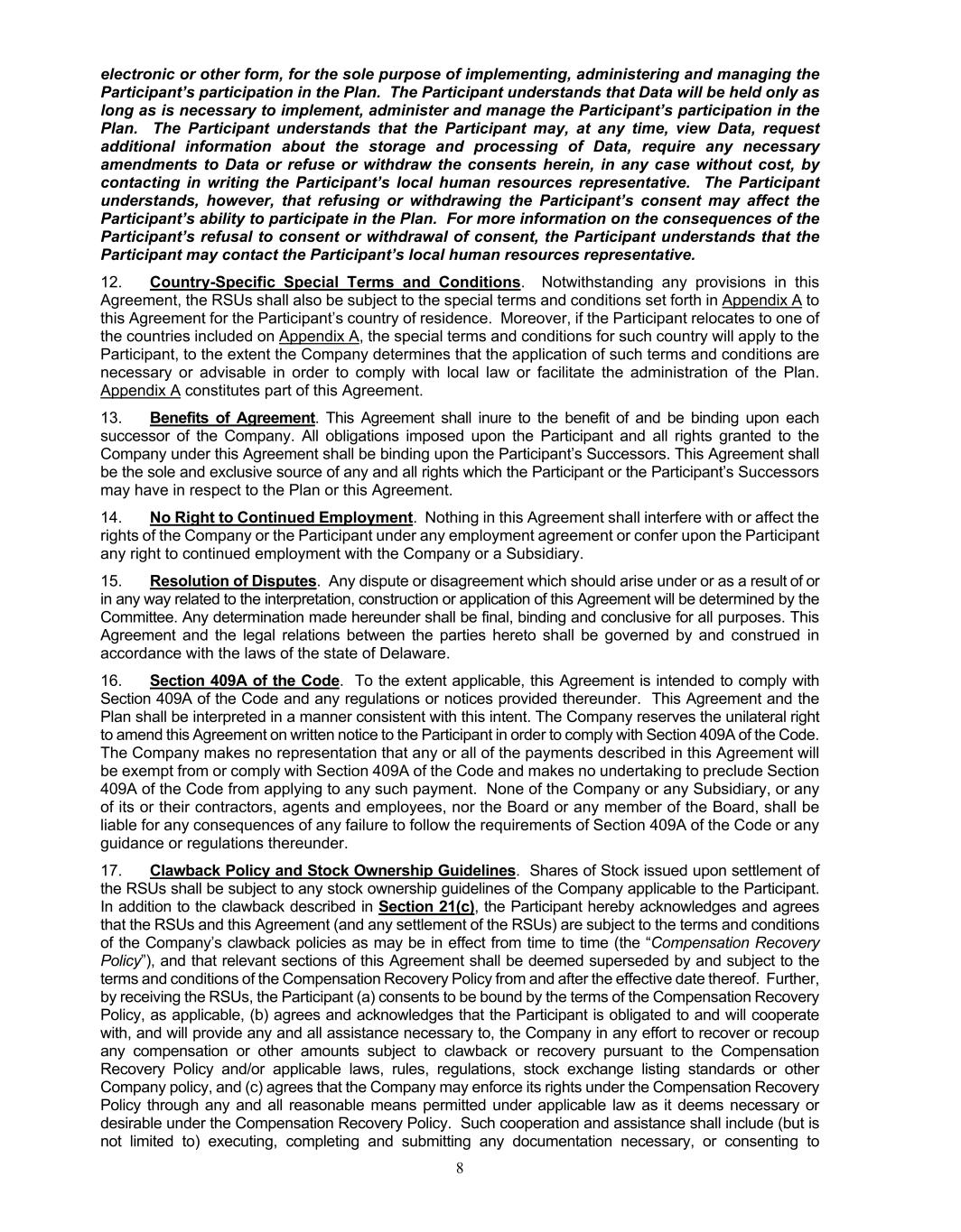 8 electronic or other form, for the sole purpose of implementing, administering and managing the Participant’s participation in the Plan. The Participant understands that Data will be held only as long as is necessary to implement, administer and manage the Participant’s participation in the Plan. The Participant understands that the Participant may, at any time, view Data, request additional information about the storage and processing of Data, require any necessary amendments to Data or refuse or withdraw the consents herein, in any case without cost, by contacting in writing the Participant’s local human resources representative. The Participant understands, however, that refusing or withdrawing the Participant’s consent may affect the Participant’s ability to participate in the Plan. For more information on the consequences of the Participant’s refusal to consent or withdrawal of consent, the Participant understands that the Participant may contact the Participant’s local human resources representative. 12. Country-Specific Special Terms and Conditions. Notwithstanding any provisions in this Agreement, the RSUs shall also be subject to the special terms and conditions set forth in Appendix A to this Agreement for the Participant’s country of residence. Moreover, if the Participant relocates to one of the countries included on Appendix A, the special terms and conditions for such country will apply to the Participant, to the extent the Company determines that the application of such terms and conditions are necessary or advisable in order to comply with local law or facilitate the administration of the Plan. Appendix A constitutes part of this Agreement. 13. Benefits of Agreement. This Agreement shall inure to the benefit of and be binding upon each successor of the Company. All obligations imposed upon the Participant and all rights granted to the Company under this Agreement shall be binding upon the Participant’s Successors. This Agreement shall be the sole and exclusive source of any and all rights which the Participant or the Participant’s Successors may have in respect to the Plan or this Agreement. 14. No Right to Continued Employment. Nothing in this Agreement shall interfere with or affect the rights of the Company or the Participant under any employment agreement or confer upon the Participant any right to continued employment with the Company or a Subsidiary. 15. Resolution of Disputes. Any dispute or disagreement which should arise under or as a result of or in any way related to the interpretation, construction or application of this Agreement will be determined by the Committee. Any determination made hereunder shall be final, binding and conclusive for all purposes. This Agreement and the legal relations between the parties hereto shall be governed by and construed in accordance with the laws of the state of Delaware. 16. Section 409A of the Code. To the extent applicable, this Agreement is intended to comply with Section 409A of the Code and any regulations or notices provided thereunder. This Agreement and the Plan shall be interpreted in a manner consistent with this intent. The Company reserves the unilateral right to amend this Agreement on written notice to the Participant in order to comply with Section 409A of the Code. The Company makes no representation that any or all of the payments described in this Agreement will be exempt from or comply with Section 409A of the Code and makes no undertaking to preclude Section 409A of the Code from applying to any such payment. None of the Company or any Subsidiary, or any of its or their contractors, agents and employees, nor the Board or any member of the Board, shall be liable for any consequences of any failure to follow the requirements of Section 409A of the Code or any guidance or regulations thereunder. 17. Clawback Policy and Stock Ownership Guidelines. Shares of Stock issued upon settlement of the RSUs shall be subject to any stock ownership guidelines of the Company applicable to the Participant. In addition to the clawback described in Section 21(c), the Participant hereby acknowledges and agrees that the RSUs and this Agreement (and any settlement of the RSUs) are subject to the terms and conditions of the Company’s clawback policies as may be in effect from time to time (the “Compensation Recovery Policy”), and that relevant sections of this Agreement shall be deemed superseded by and subject to the terms and conditions of the Compensation Recovery Policy from and after the effective date thereof. Further, by receiving the RSUs, the Participant (a) consents to be bound by the terms of the Compensation Recovery Policy, as applicable, (b) agrees and acknowledges that the Participant is obligated to and will cooperate with, and will provide any and all assistance necessary to, the Company in any effort to recover or recoup any compensation or other amounts subject to clawback or recovery pursuant to the Compensation Recovery Policy and/or applicable laws, rules, regulations, stock exchange listing standards or other Company policy, and (c) agrees that the Company may enforce its rights under the Compensation Recovery Policy through any and all reasonable means permitted under applicable law as it deems necessary or desirable under the Compensation Recovery Policy. Such cooperation and assistance shall include (but is not limited to) executing, completing and submitting any documentation necessary, or consenting to