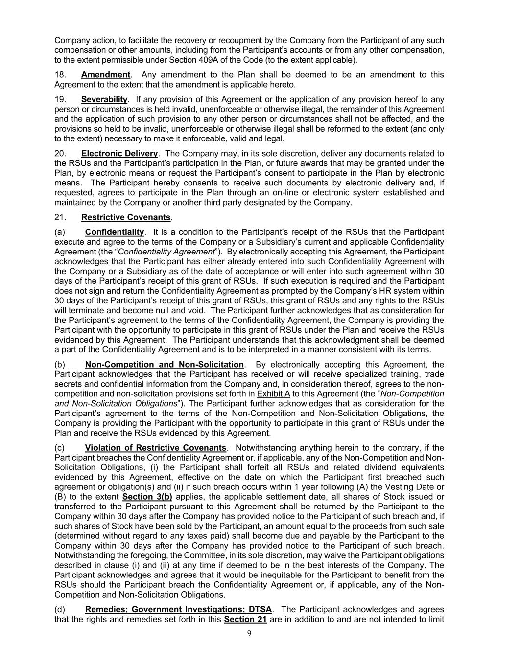 9 Company action, to facilitate the recovery or recoupment by the Company from the Participant of any such compensation or other amounts, including from the Participant’s accounts or from any other compensation, to the extent permissible under Section 409A of the Code (to the extent applicable). 18. Amendment. Any amendment to the Plan shall be deemed to be an amendment to this Agreement to the extent that the amendment is applicable hereto. 19. Severability. If any provision of this Agreement or the application of any provision hereof to any person or circumstances is held invalid, unenforceable or otherwise illegal, the remainder of this Agreement and the application of such provision to any other person or circumstances shall not be affected, and the provisions so held to be invalid, unenforceable or otherwise illegal shall be reformed to the extent (and only to the extent) necessary to make it enforceable, valid and legal. 20. Electronic Delivery. The Company may, in its sole discretion, deliver any documents related to the RSUs and the Participant’s participation in the Plan, or future awards that may be granted under the Plan, by electronic means or request the Participant’s consent to participate in the Plan by electronic means. The Participant hereby consents to receive such documents by electronic delivery and, if requested, agrees to participate in the Plan through an on-line or electronic system established and maintained by the Company or another third party designated by the Company. 21. Restrictive Covenants. (a) Confidentiality. It is a condition to the Participant’s receipt of the RSUs that the Participant execute and agree to the terms of the Company or a Subsidiary’s current and applicable Confidentiality Agreement (the “Confidentiality Agreement”). By electronically accepting this Agreement, the Participant acknowledges that the Participant has either already entered into such Confidentiality Agreement with the Company or a Subsidiary as of the date of acceptance or will enter into such agreement within 30 days of the Participant’s receipt of this grant of RSUs. If such execution is required and the Participant does not sign and return the Confidentiality Agreement as prompted by the Company’s HR system within 30 days of the Participant’s receipt of this grant of RSUs, this grant of RSUs and any rights to the RSUs will terminate and become null and void. The Participant further acknowledges that as consideration for the Participant’s agreement to the terms of the Confidentiality Agreement, the Company is providing the Participant with the opportunity to participate in this grant of RSUs under the Plan and receive the RSUs evidenced by this Agreement. The Participant understands that this acknowledgment shall be deemed a part of the Confidentiality Agreement and is to be interpreted in a manner consistent with its terms. (b) Non-Competition and Non-Solicitation. By electronically accepting this Agreement, the Participant acknowledges that the Participant has received or will receive specialized training, trade secrets and confidential information from the Company and, in consideration thereof, agrees to the non- competition and non-solicitation provisions set forth in Exhibit A to this Agreement (the “Non-Competition and Non-Solicitation Obligations”). The Participant further acknowledges that as consideration for the Participant’s agreement to the terms of the Non-Competition and Non-Solicitation Obligations, the Company is providing the Participant with the opportunity to participate in this grant of RSUs under the Plan and receive the RSUs evidenced by this Agreement. (c) Violation of Restrictive Covenants. Notwithstanding anything herein to the contrary, if the Participant breaches the Confidentiality Agreement or, if applicable, any of the Non-Competition and Non- Solicitation Obligations, (i) the Participant shall forfeit all RSUs and related dividend equivalents evidenced by this Agreement, effective on the date on which the Participant first breached such agreement or obligation(s) and (ii) if such breach occurs within 1 year following (A) the Vesting Date or (B) to the extent Section 3(b) applies, the applicable settlement date, all shares of Stock issued or transferred to the Participant pursuant to this Agreement shall be returned by the Participant to the Company within 30 days after the Company has provided notice to the Participant of such breach and, if such shares of Stock have been sold by the Participant, an amount equal to the proceeds from such sale (determined without regard to any taxes paid) shall become due and payable by the Participant to the Company within 30 days after the Company has provided notice to the Participant of such breach. Notwithstanding the foregoing, the Committee, in its sole discretion, may waive the Participant obligations described in clause (i) and (ii) at any time if deemed to be in the best interests of the Company. The Participant acknowledges and agrees that it would be inequitable for the Participant to benefit from the RSUs should the Participant breach the Confidentiality Agreement or, if applicable, any of the Non- Competition and Non-Solicitation Obligations. (d) Remedies; Government Investigations; DTSA. The Participant acknowledges and agrees that the rights and remedies set forth in this Section 21 are in addition to and are not intended to limit
