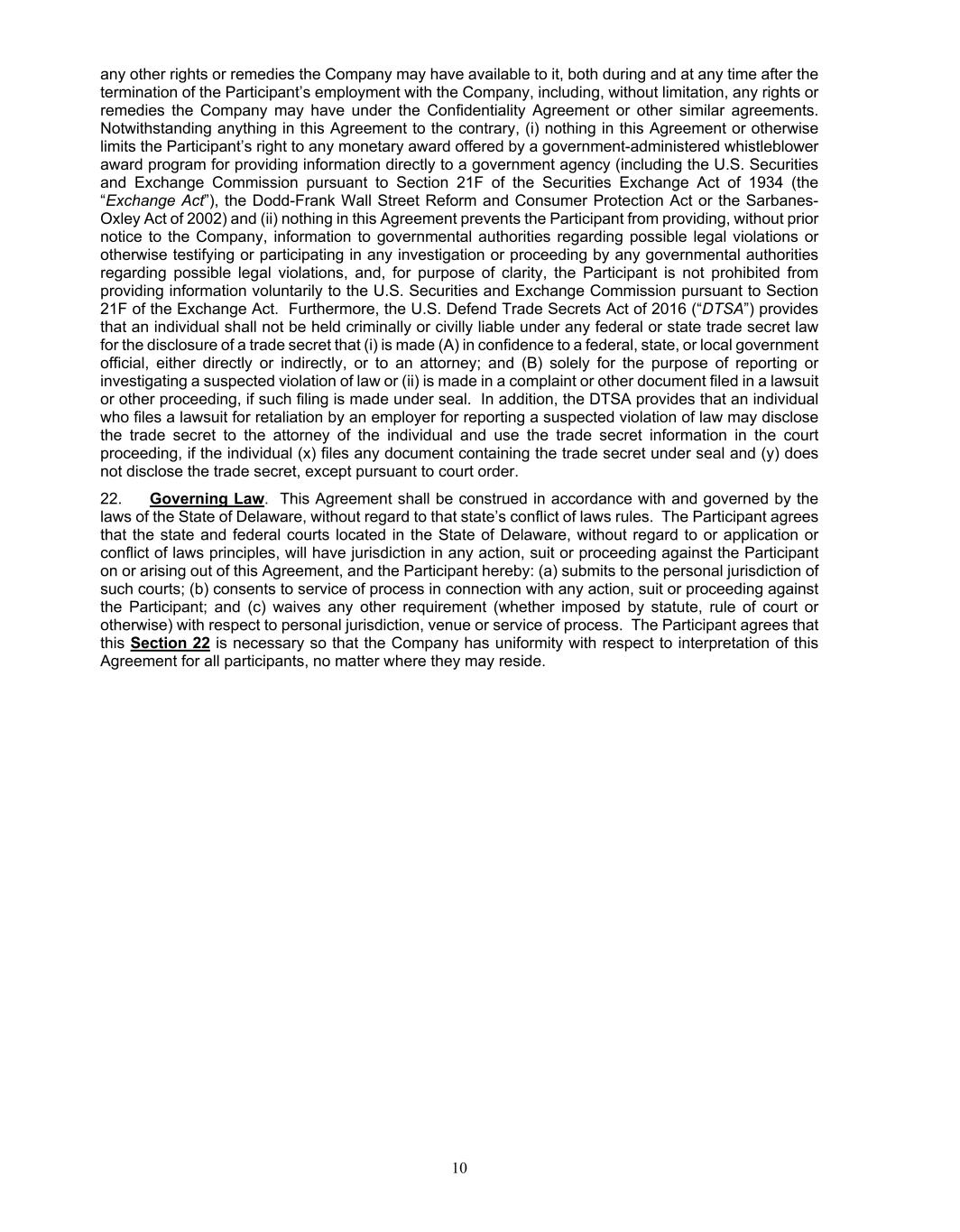 10 any other rights or remedies the Company may have available to it, both during and at any time after the termination of the Participant’s employment with the Company, including, without limitation, any rights or remedies the Company may have under the Confidentiality Agreement or other similar agreements. Notwithstanding anything in this Agreement to the contrary, (i) nothing in this Agreement or otherwise limits the Participant’s right to any monetary award offered by a government-administered whistleblower award program for providing information directly to a government agency (including the U.S. Securities and Exchange Commission pursuant to Section 21F of the Securities Exchange Act of 1934 (the “Exchange Act”), the Dodd-Frank Wall Street Reform and Consumer Protection Act or the Sarbanes- Oxley Act of 2002) and (ii) nothing in this Agreement prevents the Participant from providing, without prior notice to the Company, information to governmental authorities regarding possible legal violations or otherwise testifying or participating in any investigation or proceeding by any governmental authorities regarding possible legal violations, and, for purpose of clarity, the Participant is not prohibited from providing information voluntarily to the U.S. Securities and Exchange Commission pursuant to Section 21F of the Exchange Act. Furthermore, the U.S. Defend Trade Secrets Act of 2016 (“DTSA”) provides that an individual shall not be held criminally or civilly liable under any federal or state trade secret law for the disclosure of a trade secret that (i) is made (A) in confidence to a federal, state, or local government official, either directly or indirectly, or to an attorney; and (B) solely for the purpose of reporting or investigating a suspected violation of law or (ii) is made in a complaint or other document filed in a lawsuit or other proceeding, if such filing is made under seal. In addition, the DTSA provides that an individual who files a lawsuit for retaliation by an employer for reporting a suspected violation of law may disclose the trade secret to the attorney of the individual and use the trade secret information in the court proceeding, if the individual (x) files any document containing the trade secret under seal and (y) does not disclose the trade secret, except pursuant to court order. 22. Governing Law. This Agreement shall be construed in accordance with and governed by the laws of the State of Delaware, without regard to that state’s conflict of laws rules. The Participant agrees that the state and federal courts located in the State of Delaware, without regard to or application or conflict of laws principles, will have jurisdiction in any action, suit or proceeding against the Participant on or arising out of this Agreement, and the Participant hereby: (a) submits to the personal jurisdiction of such courts; (b) consents to service of process in connection with any action, suit or proceeding against the Participant; and (c) waives any other requirement (whether imposed by statute, rule of court or otherwise) with respect to personal jurisdiction, venue or service of process. The Participant agrees that this Section 22 is necessary so that the Company has uniformity with respect to interpretation of this Agreement for all participants, no matter where they may reside.