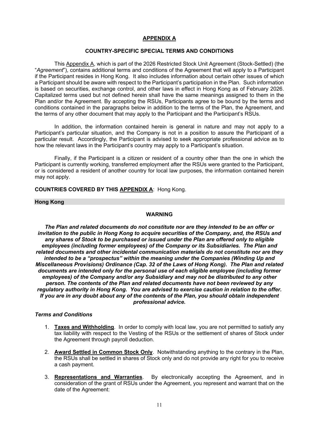 11 APPENDIX A COUNTRY-SPECIFIC SPECIAL TERMS AND CONDITIONS This Appendix A, which is part of the 2026 Restricted Stock Unit Agreement (Stock-Settled) (the “Agreement”), contains additional terms and conditions of the Agreement that will apply to a Participant if the Participant resides in Hong Kong. It also includes information about certain other issues of which a Participant should be aware with respect to the Participant’s participation in the Plan. Such information is based on securities, exchange control, and other laws in effect in Hong Kong as of February 2026. Capitalized terms used but not defined herein shall have the same meanings assigned to them in the Plan and/or the Agreement. By accepting the RSUs, Participants agree to be bound by the terms and conditions contained in the paragraphs below in addition to the terms of the Plan, the Agreement, and the terms of any other document that may apply to the Participant and the Participant’s RSUs. In addition, the information contained herein is general in nature and may not apply to a Participant’s particular situation, and the Company is not in a position to assure the Participant of a particular result. Accordingly, the Participant is advised to seek appropriate professional advice as to how the relevant laws in the Participant’s country may apply to a Participant’s situation. Finally, if the Participant is a citizen or resident of a country other than the one in which the Participant is currently working, transferred employment after the RSUs were granted to the Participant, or is considered a resident of another country for local law purposes, the information contained herein may not apply. COUNTRIES COVERED BY THIS APPENDIX A: Hong Kong. Hong Kong WARNING The Plan and related documents do not constitute nor are they intended to be an offer or invitation to the public in Hong Kong to acquire securities of the Company, and, the RSUs and any shares of Stock to be purchased or issued under the Plan are offered only to eligible employees (including former employees) of the Company or its Subsidiaries. The Plan and related documents and other incidental communication materials do not constitute nor are they intended to be a “prospectus” within the meaning under the Companies (Winding Up and Miscellaneous Provisions) Ordinance (Cap. 32 of the Laws of Hong Kong). The Plan and related documents are intended only for the personal use of each eligible employee (including former employees) of the Company and/or any Subsidiary and may not be distributed to any other person. The contents of the Plan and related documents have not been reviewed by any regulatory authority in Hong Kong. You are advised to exercise caution in relation to the offer. If you are in any doubt about any of the contents of the Plan, you should obtain independent professional advice. Terms and Conditions 1. Taxes and Withholding. In order to comply with local law, you are not permitted to satisfy any tax liability with respect to the Vesting of the RSUs or the settlement of shares of Stock under the Agreement through payroll deduction. 2. Award Settled in Common Stock Only. Notwithstanding anything to the contrary in the Plan, the RSUs shall be settled in shares of Stock only and do not provide any right for you to receive a cash payment. 3. Representations and Warranties. By electronically accepting the Agreement, and in consideration of the grant of RSUs under the Agreement, you represent and warrant that on the date of the Agreement: