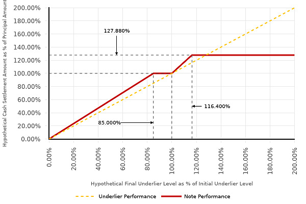 The notes do not bear interest. The amount that you will be paid on your notes on the stated maturity date (April 19, 2028, subject to adjustment) is based on the performance of the S&P 500® Index (the “underlier”) as measured from the trade date (March 30, 2026) to and including the determination date (April 17, 2028, subject to adjustment). If the final underlier level on the determination date is greater than the initial underlier level (6,343.72, which was the closing level of the underlier on the trade date), the return on your notes will be positive and will equal the upside participation rate of 1.7 times the underlier return, subject to the maximum settlement amount of $1,278.80 for each $1,000 principal amount of your notes. If the final underlier level declines by up to 15.00% from the initial underlier level, you will receive the principal amount of your notes. If the final underlier level declines by more than 15.00% from the initial underlier level, the return on your notes will be negative. You could lose your entire investment in the notes.