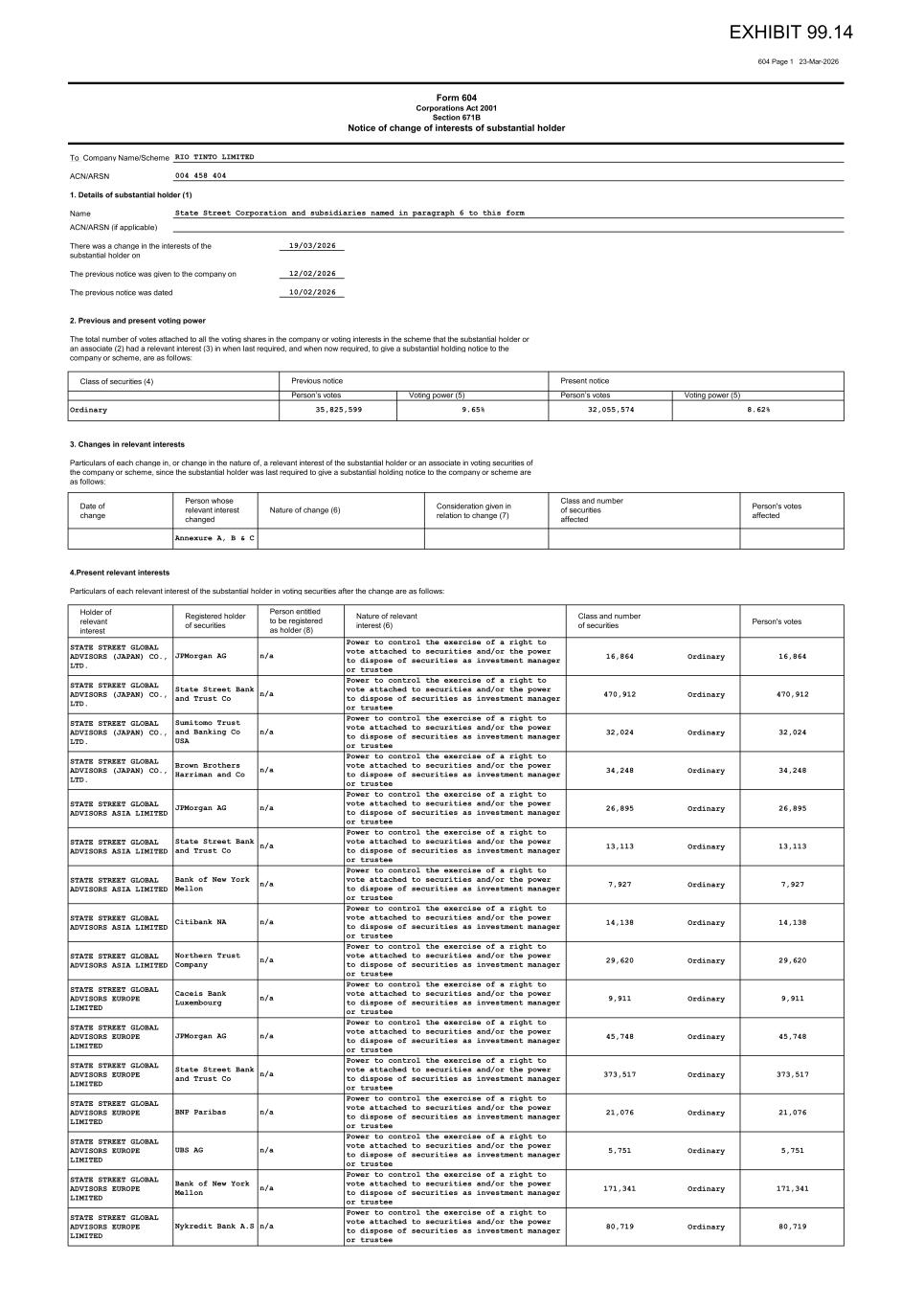 604 Page 1 23-Mar-2026 To Company Name/Scheme ACN/ARSN 1. Details of substantial holder (1) Name ACN/ARSN (if applicable) There was a change in the interests of the 19/03/2026 substantial holder on The previous notice was given to the company on 12/02/2026 The previous notice was dated 10/02/2026 2. Previous and present voting power The total number of votes attached to all the voting shares in the company or voting interests in the scheme that the substantial holder or an associate (2) had a relevant interest (3) in when last required, and when now required, to give a substantial holding notice to the company or scheme, are as follows: Class of securities (4) 3. Changes in relevant interests Particulars of each change in, or change in the nature of, a relevant interest of the substantial holder or an associate in voting securities of the company or scheme, since the substantial holder was last required to give a substantial holding notice to the company or scheme are as follows: Date of change Consideration given in relation to change (7) Person's votes affected 4.Present relevant interests Particulars of each relevant interest of the substantial holder in voting securities after the change are as follows: Holder of relevant interest Person's votes STATE STREET GLOBAL ADVISORS (JAPAN) CO., LTD. 16,864 Ordinary 16,864 STATE STREET GLOBAL ADVISORS (JAPAN) CO., LTD. 470,912 Ordinary 470,912 STATE STREET GLOBAL ADVISORS (JAPAN) CO., LTD. 32,024 Ordinary 32,024 STATE STREET GLOBAL ADVISORS (JAPAN) CO., LTD. 34,248 Ordinary 34,248 STATE STREET GLOBAL ADVISORS ASIA LIMITED 26,895 Ordinary 26,895 STATE STREET GLOBAL ADVISORS ASIA LIMITED 13,113 Ordinary 13,113 STATE STREET GLOBAL ADVISORS ASIA LIMITED 7,927 Ordinary 7,927 STATE STREET GLOBAL ADVISORS ASIA LIMITED 14,138 Ordinary 14,138 STATE STREET GLOBAL ADVISORS ASIA LIMITED 29,620 Ordinary 29,620 STATE STREET GLOBAL ADVISORS EUROPE LIMITED 9,911 Ordinary 9,911 STATE STREET GLOBAL ADVISORS EUROPE LIMITED 45,748 Ordinary 45,748 STATE STREET GLOBAL ADVISORS EUROPE LIMITED 373,517 Ordinary 373,517 STATE STREET GLOBAL ADVISORS EUROPE LIMITED 21,076 Ordinary 21,076 STATE STREET GLOBAL ADVISORS EUROPE LIMITED 5,751 Ordinary 5,751 STATE STREET GLOBAL ADVISORS EUROPE LIMITED 171,341 Ordinary 171,341 STATE STREET GLOBAL ADVISORS EUROPE LIMITED 80,719 Ordinary 80,719 n/a Nykredit Bank A.S BNP Paribas State Street Bank and Trust Co n/a 35,825,599 Nature of relevant interest (6) Bank of New York Mellon n/a JPMorgan AG n/a Caceis Bank Luxembourg 004 458 404 Nature of change (6) Registered holder of securities n/a Ordinary Person’s votes Power to control the exercise of a right to vote attached to securities and/or the power to dispose of securities as investment manager or trustee Power to control the exercise of a right to vote attached to securities and/or the power to dispose of securities as investment manager or trustee Power to control the exercise of a right to vote attached to securities and/or the power to dispose of securities as investment manager or trustee Power to control the exercise of a right to vote attached to securities and/or the power to dispose of securities as investment manager or trustee Power to control the exercise of a right to vote attached to securities and/or the power to dispose of securities as investment manager or trustee Power to control the exercise of a right to vote attached to securities and/or the power to dispose of securities as investment manager or trustee Power to control the exercise of a right to vote attached to securities and/or the power to dispose of securities as investment manager or trustee Power to control the exercise of a right to vote attached to securities and/or the power to dispose of securities as investment manager or trustee Power to control the exercise of a right to vote attached to securities and/or the power to dispose of securities as investment manager or trustee Power to control the exercise of a right to vote attached to securities and/or the power to dispose of securities as investment manager or trustee Power to control the exercise of a right to vote attached to securities and/or the power to dispose of securities as investment manager or trustee Voting power (5) n/a Power to control the exercise of a right to vote attached to securities and/or the power to dispose of securities as investment manager or trustee Power to control the exercise of a right to vote attached to securities and/or the power to dispose of securities as investment manager or trustee Power to control the exercise of a right to vote attached to securities and/or the power to dispose of securities as investment manager or trustee Power to control the exercise of a right to vote attached to securities and/or the power to dispose of securities as investment manager or trustee Power to control the exercise of a right to vote attached to securities and/or the power to dispose of securities as investment manager or trustee Person entitled to be registered as holder (8) Citibank NA Section 671B n/a Form 604 Northern Trust Company Notice of change of interests of substantial holder n/a Person’s votes RIO TINTO LIMITED State Street Bank and Trust Co n/a Previous notice Sumitomo Trust and Banking Co USA n/a JPMorgan AG n/a Corporations Act 2001 n/a Annexure A, B & C Voting power (5) 32,055,574 Class and number of securities UBS AG n/a State Street Corporation and subsidiaries named in paragraph 6 to this form Brown Brothers Harriman and Co n/a JPMorgan AG n/a Present notice Bank of New York Mellon Person whose relevant interest changed 9.65% Class and number of securities affected n/a 8.62% State Street Bank and Trust Co EXHIBIT 99.14