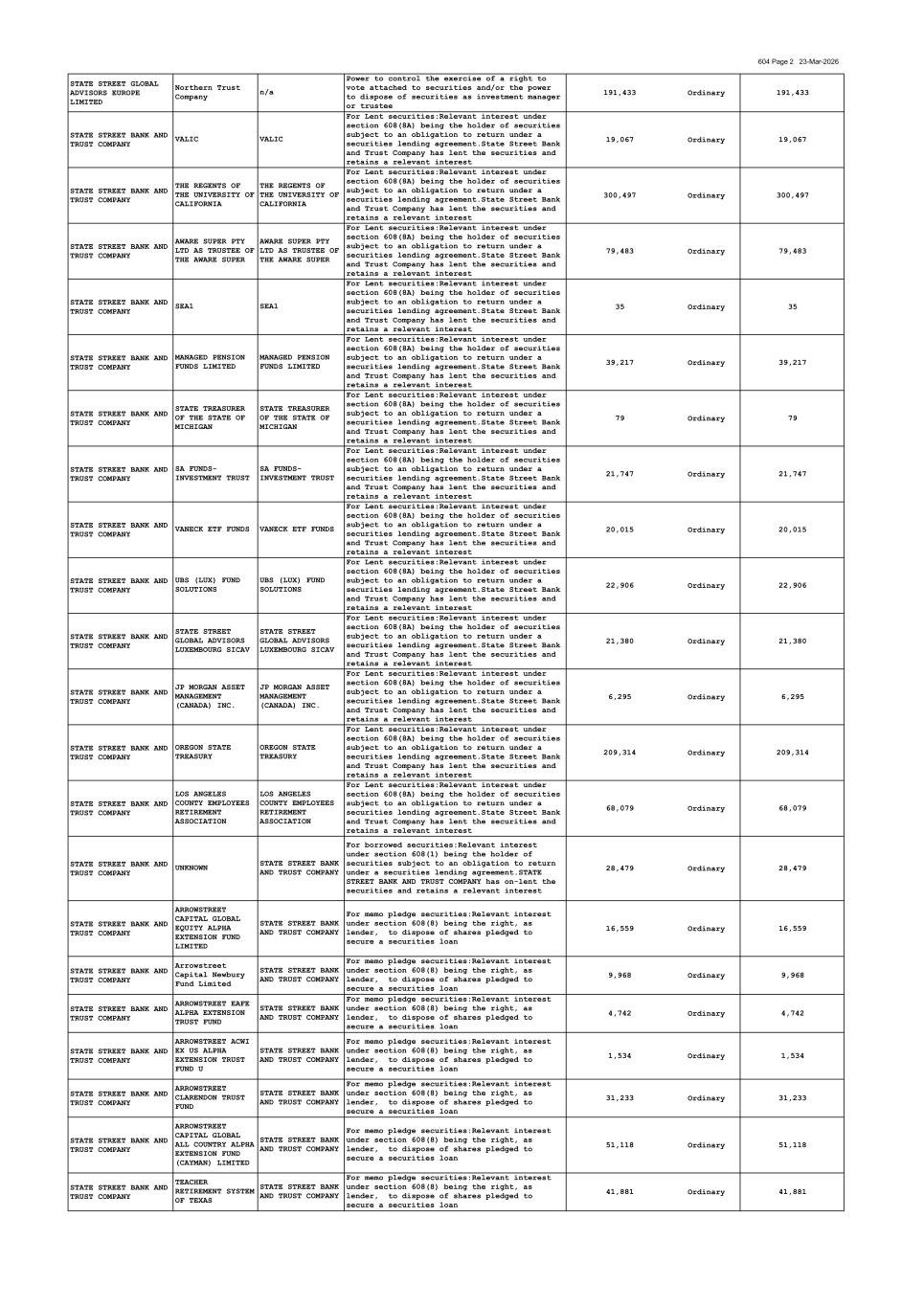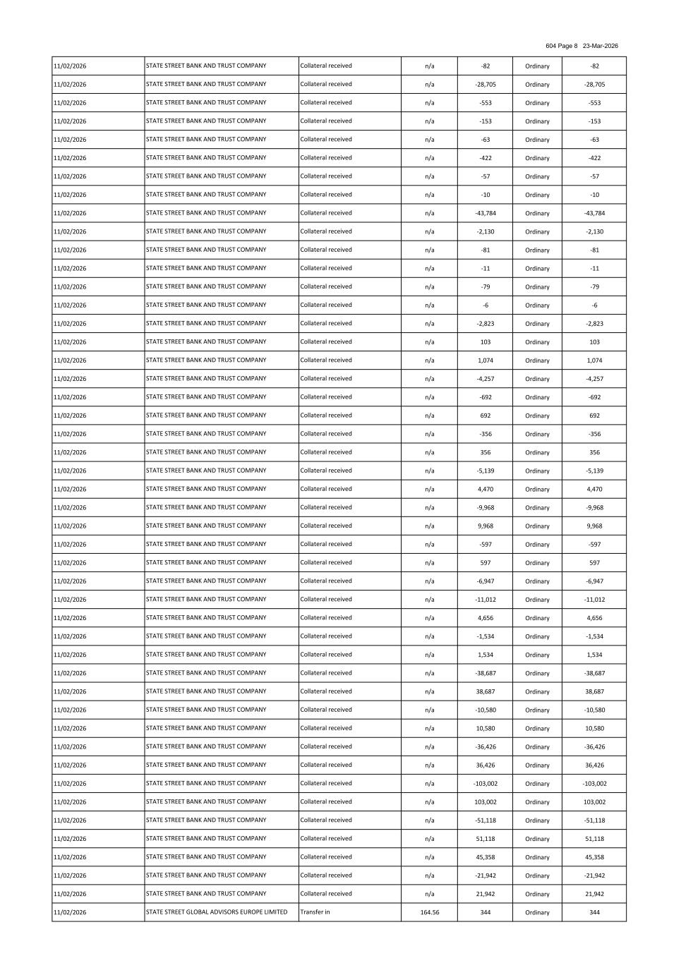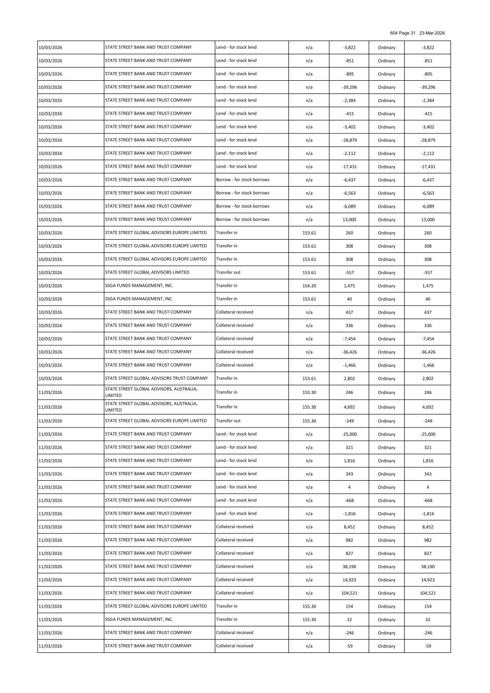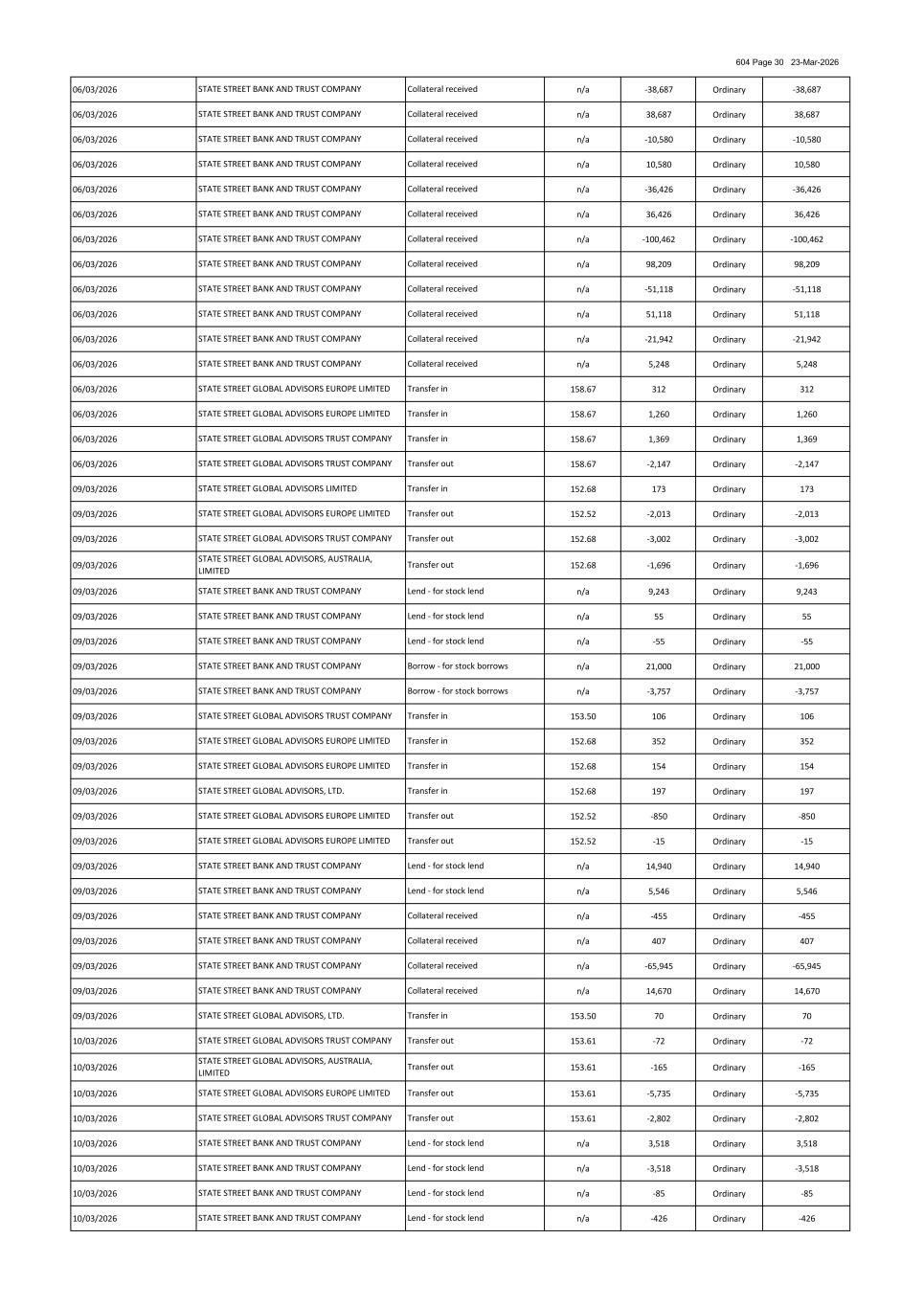 604 Page 8 23-Mar-2026 11/02/2026 n/a -82 Ordinary -82 11/02/2026 n/a -28,705 Ordinary -28,705 11/02/2026 n/a -553 Ordinary -553 11/02/2026 n/a -153 Ordinary -153 11/02/2026 n/a -63 Ordinary -63 11/02/2026 n/a -422 Ordinary -422 11/02/2026 n/a -57 Ordinary -57 11/02/2026 n/a -10 Ordinary -10 11/02/2026 n/a -43,784 Ordinary -43,784 11/02/2026 n/a -2,130 Ordinary -2,130 11/02/2026 n/a -81 Ordinary -81 11/02/2026 n/a -11 Ordinary -11 11/02/2026 n/a -79 Ordinary -79 11/02/2026 n/a -6 Ordinary -6 11/02/2026 n/a -2,823 Ordinary -2,823 11/02/2026 n/a 103 Ordinary 103 11/02/2026 n/a 1,074 Ordinary 1,074 11/02/2026 n/a -4,257 Ordinary -4,257 11/02/2026 n/a -692 Ordinary -692 11/02/2026 n/a 692 Ordinary 692 11/02/2026 n/a -356 Ordinary -356 11/02/2026 n/a 356 Ordinary 356 11/02/2026 n/a -5,139 Ordinary -5,139 11/02/2026 n/a 4,470 Ordinary 4,470 11/02/2026 n/a -9,968 Ordinary -9,968 11/02/2026 n/a 9,968 Ordinary 9,968 11/02/2026 n/a -597 Ordinary -597 11/02/2026 n/a 597 Ordinary 597 11/02/2026 n/a -6,947 Ordinary -6,947 11/02/2026 n/a -11,012 Ordinary -11,012 11/02/2026 n/a 4,656 Ordinary 4,656 11/02/2026 n/a -1,534 Ordinary -1,534 11/02/2026 n/a 1,534 Ordinary 1,534 11/02/2026 n/a -38,687 Ordinary -38,687 11/02/2026 n/a 38,687 Ordinary 38,687 11/02/2026 n/a -10,580 Ordinary -10,580 11/02/2026 n/a 10,580 Ordinary 10,580 11/02/2026 n/a -36,426 Ordinary -36,426 11/02/2026 n/a 36,426 Ordinary 36,426 11/02/2026 n/a -103,002 Ordinary -103,002 11/02/2026 n/a 103,002 Ordinary 103,002 11/02/2026 n/a -51,118 Ordinary -51,118 11/02/2026 n/a 51,118 Ordinary 51,118 11/02/2026 n/a 45,358 Ordinary 45,358 11/02/2026 n/a -21,942 Ordinary -21,942 11/02/2026 n/a 21,942 Ordinary 21,942 11/02/2026 164.56 344 Ordinary 344 STATE STREET BANK AND TRUST COMPANY STATE STREET BANK AND TRUST COMPANY STATE STREET BANK AND TRUST COMPANY Collateral received STATE STREET BANK AND TRUST COMPANY Collateral received Collateral received Collateral received STATE STREET BANK AND TRUST COMPANY STATE STREET BANK AND TRUST COMPANY STATE STREET BANK AND TRUST COMPANY Collateral received Collateral received Collateral received Collateral received Collateral received Collateral received STATE STREET BANK AND TRUST COMPANY Collateral received STATE STREET BANK AND TRUST COMPANY STATE STREET BANK AND TRUST COMPANY Collateral received Collateral received Collateral received STATE STREET BANK AND TRUST COMPANY Collateral received STATE STREET BANK AND TRUST COMPANY Collateral received STATE STREET BANK AND TRUST COMPANY STATE STREET BANK AND TRUST COMPANY Collateral received STATE STREET BANK AND TRUST COMPANY STATE STREET BANK AND TRUST COMPANY Collateral received Collateral received STATE STREET BANK AND TRUST COMPANY Collateral received Collateral received STATE STREET BANK AND TRUST COMPANY STATE STREET BANK AND TRUST COMPANY STATE STREET GLOBAL ADVISORS EUROPE LIMITED Collateral received Collateral received STATE STREET BANK AND TRUST COMPANY STATE STREET BANK AND TRUST COMPANY STATE STREET BANK AND TRUST COMPANY STATE STREET BANK AND TRUST COMPANY Collateral received STATE STREET BANK AND TRUST COMPANY Collateral received Collateral received STATE STREET BANK AND TRUST COMPANY STATE STREET BANK AND TRUST COMPANY STATE STREET BANK AND TRUST COMPANY Collateral received Collateral received Collateral received STATE STREET BANK AND TRUST COMPANY STATE STREET BANK AND TRUST COMPANY Collateral received STATE STREET BANK AND TRUST COMPANY Collateral received Collateral received Collateral received Collateral received STATE STREET BANK AND TRUST COMPANY Collateral received STATE STREET BANK AND TRUST COMPANY Collateral received STATE STREET BANK AND TRUST COMPANY Collateral received Collateral received STATE STREET BANK AND TRUST COMPANY STATE STREET BANK AND TRUST COMPANY STATE STREET BANK AND TRUST COMPANY Collateral received Collateral received Collateral received STATE STREET BANK AND TRUST COMPANY STATE STREET BANK AND TRUST COMPANY Collateral received STATE STREET BANK AND TRUST COMPANY Transfer in STATE STREET BANK AND TRUST COMPANY STATE STREET BANK AND TRUST COMPANY STATE STREET BANK AND TRUST COMPANY STATE STREET BANK AND TRUST COMPANY Collateral received Collateral received STATE STREET BANK AND TRUST COMPANY Collateral received Collateral received STATE STREET BANK AND TRUST COMPANY STATE STREET BANK AND TRUST COMPANY