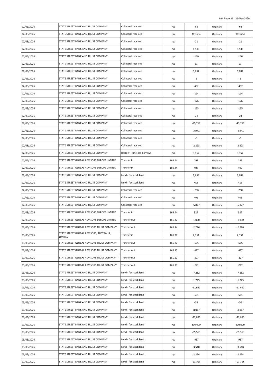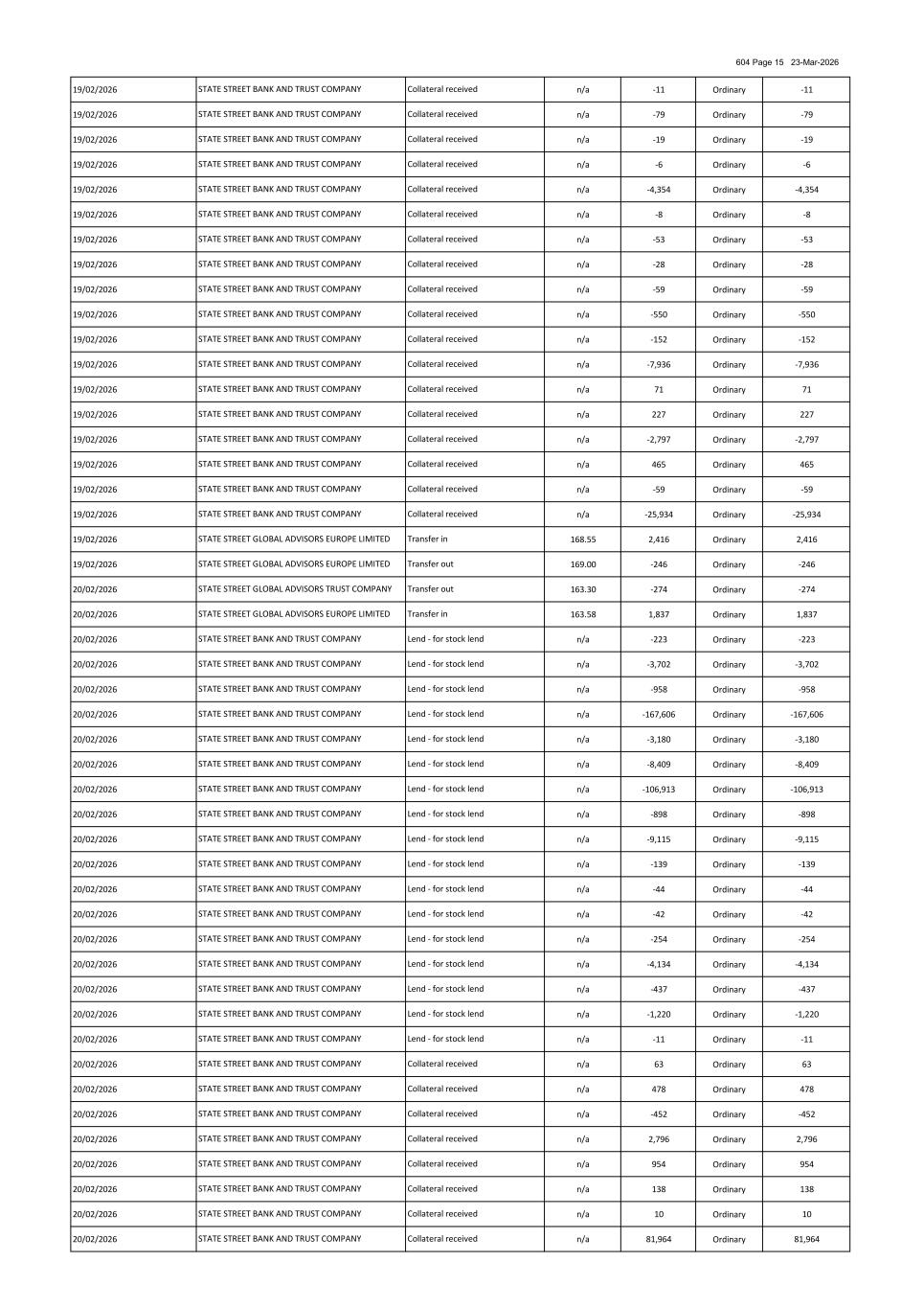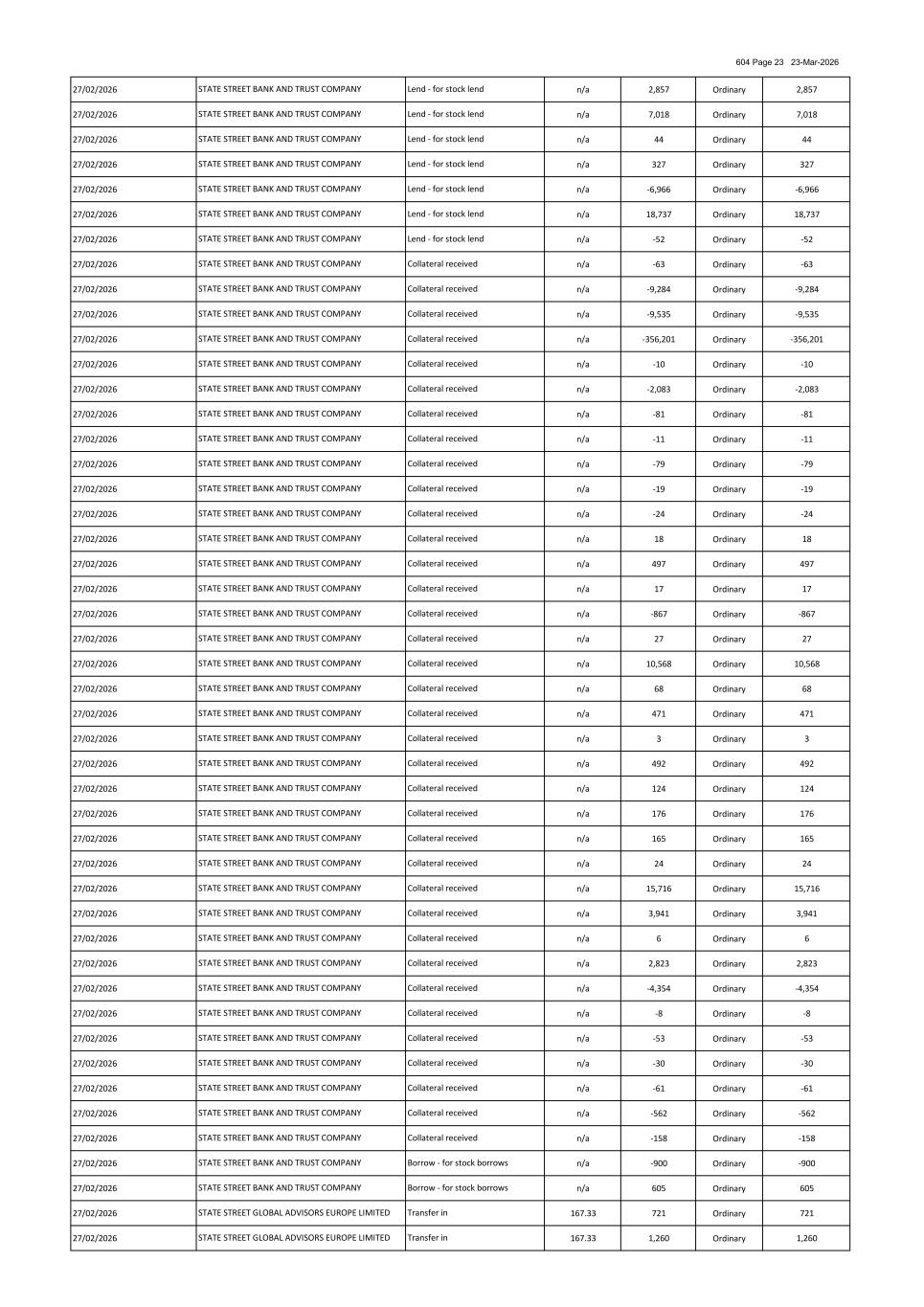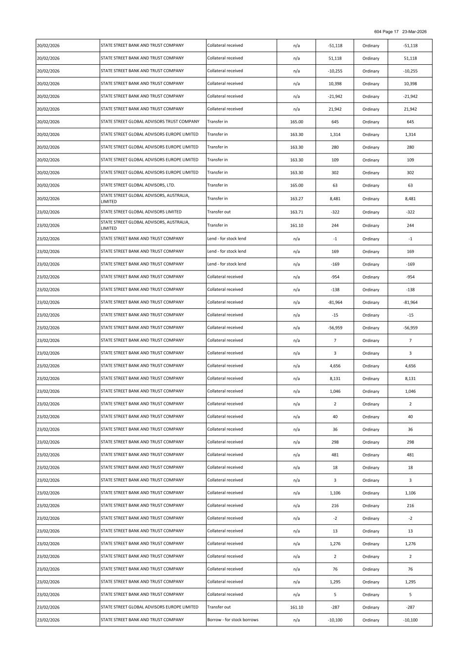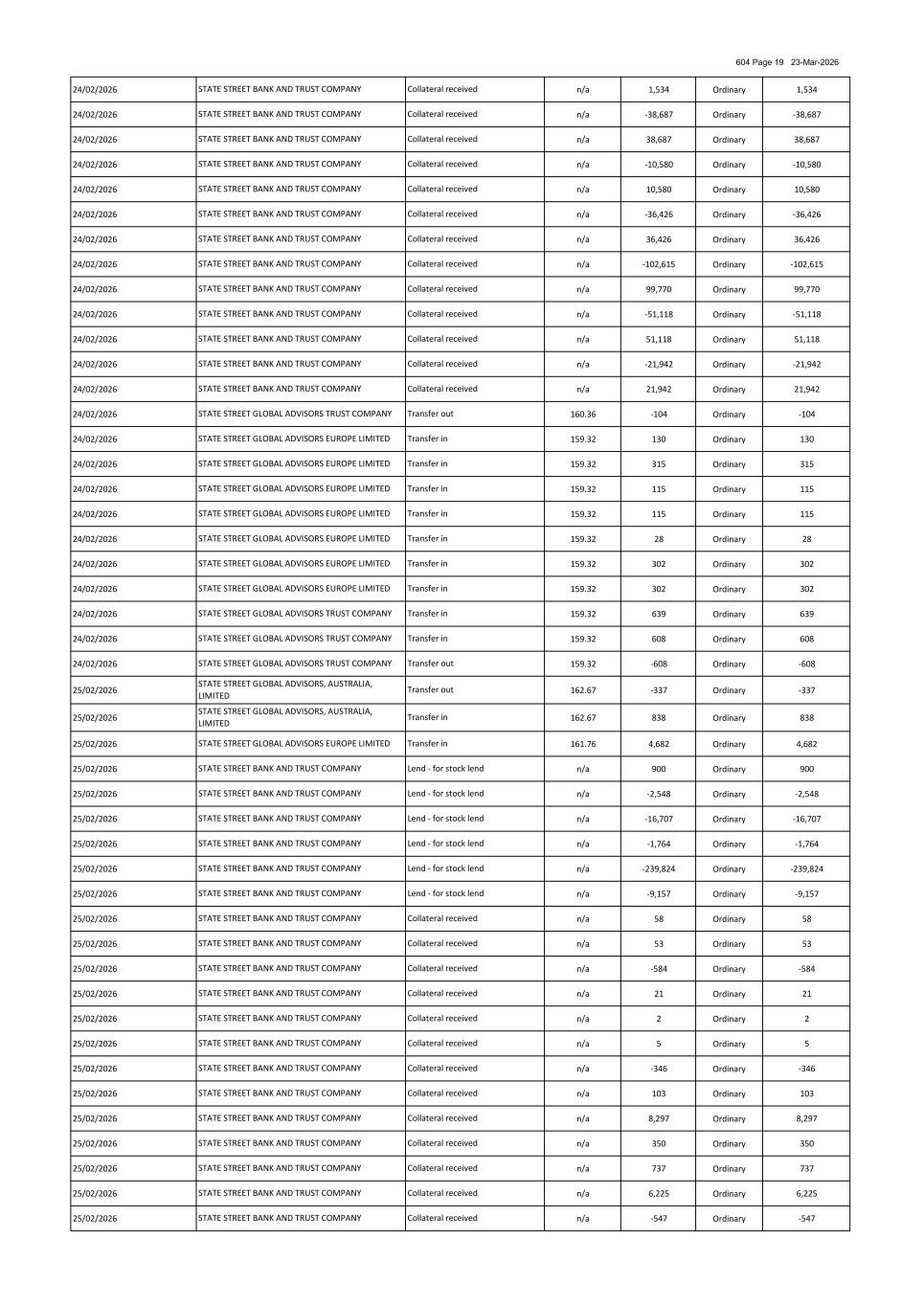 604 Page 23 23-Mar-2026 27/02/2026 n/a 2,857 Ordinary 2,857 27/02/2026 n/a 7,018 Ordinary 7,018 27/02/2026 n/a 44 Ordinary 44 27/02/2026 n/a 327 Ordinary 327 27/02/2026 n/a -6,966 Ordinary -6,966 27/02/2026 n/a 18,737 Ordinary 18,737 27/02/2026 n/a -52 Ordinary -52 27/02/2026 n/a -63 Ordinary -63 27/02/2026 n/a -9,284 Ordinary -9,284 27/02/2026 n/a -9,535 Ordinary -9,535 27/02/2026 n/a -356,201 Ordinary -356,201 27/02/2026 n/a -10 Ordinary -10 27/02/2026 n/a -2,083 Ordinary -2,083 27/02/2026 n/a -81 Ordinary -81 27/02/2026 n/a -11 Ordinary -11 27/02/2026 n/a -79 Ordinary -79 27/02/2026 n/a -19 Ordinary -19 27/02/2026 n/a -24 Ordinary -24 27/02/2026 n/a 18 Ordinary 18 27/02/2026 n/a 497 Ordinary 497 27/02/2026 n/a 17 Ordinary 17 27/02/2026 n/a -867 Ordinary -867 27/02/2026 n/a 27 Ordinary 27 27/02/2026 n/a 10,568 Ordinary 10,568 27/02/2026 n/a 68 Ordinary 68 27/02/2026 n/a 471 Ordinary 471 27/02/2026 n/a 3 Ordinary 3 27/02/2026 n/a 492 Ordinary 492 27/02/2026 n/a 124 Ordinary 124 27/02/2026 n/a 176 Ordinary 176 27/02/2026 n/a 165 Ordinary 165 27/02/2026 n/a 24 Ordinary 24 27/02/2026 n/a 15,716 Ordinary 15,716 27/02/2026 n/a 3,941 Ordinary 3,941 27/02/2026 n/a 6 Ordinary 6 27/02/2026 n/a 2,823 Ordinary 2,823 27/02/2026 n/a -4,354 Ordinary -4,354 27/02/2026 n/a -8 Ordinary -8 27/02/2026 n/a -53 Ordinary -53 27/02/2026 n/a -30 Ordinary -30 27/02/2026 n/a -61 Ordinary -61 27/02/2026 n/a -562 Ordinary -562 27/02/2026 n/a -158 Ordinary -158 27/02/2026 n/a -900 Ordinary -900 27/02/2026 n/a 605 Ordinary 605 27/02/2026 167.33 721 Ordinary 721 27/02/2026 167.33 1,260 Ordinary 1,260 Collateral received STATE STREET BANK AND TRUST COMPANY Collateral received STATE STREET BANK AND TRUST COMPANY Collateral received STATE STREET BANK AND TRUST COMPANY Lend - for stock lend Collateral received STATE STREET BANK AND TRUST COMPANY Collateral received STATE STREET BANK AND TRUST COMPANY STATE STREET BANK AND TRUST COMPANY Collateral received STATE STREET BANK AND TRUST COMPANY Collateral received Collateral received STATE STREET BANK AND TRUST COMPANY Borrow - for stock borrows Collateral received STATE STREET BANK AND TRUST COMPANY Collateral received STATE STREET BANK AND TRUST COMPANY STATE STREET BANK AND TRUST COMPANY STATE STREET BANK AND TRUST COMPANY Lend - for stock lend STATE STREET BANK AND TRUST COMPANY Collateral received STATE STREET BANK AND TRUST COMPANY Collateral received STATE STREET BANK AND TRUST COMPANY Collateral received Lend - for stock lend STATE STREET GLOBAL ADVISORS EUROPE LIMITED STATE STREET BANK AND TRUST COMPANY Collateral received Collateral received STATE STREET BANK AND TRUST COMPANY Collateral received STATE STREET BANK AND TRUST COMPANY STATE STREET BANK AND TRUST COMPANY Lend - for stock lend STATE STREET BANK AND TRUST COMPANY STATE STREET BANK AND TRUST COMPANY Collateral received STATE STREET BANK AND TRUST COMPANY Collateral received Collateral received STATE STREET BANK AND TRUST COMPANY Transfer in Collateral received STATE STREET BANK AND TRUST COMPANY STATE STREET BANK AND TRUST COMPANY Collateral received STATE STREET BANK AND TRUST COMPANY Collateral received STATE STREET BANK AND TRUST COMPANY Collateral received STATE STREET BANK AND TRUST COMPANY Lend - for stock lend STATE STREET BANK AND TRUST COMPANY Collateral received STATE STREET BANK AND TRUST COMPANY Collateral received STATE STREET BANK AND TRUST COMPANY Collateral received STATE STREET BANK AND TRUST COMPANY Lend - for stock lend Collateral received STATE STREET BANK AND TRUST COMPANY Collateral received Collateral received STATE STREET BANK AND TRUST COMPANY STATE STREET BANK AND TRUST COMPANY STATE STREET BANK AND TRUST COMPANY Collateral received Collateral received STATE STREET BANK AND TRUST COMPANY Borrow - for stock borrows STATE STREET BANK AND TRUST COMPANY Collateral received STATE STREET BANK AND TRUST COMPANY STATE STREET BANK AND TRUST COMPANY Collateral received STATE STREET BANK AND TRUST COMPANY Transfer in STATE STREET BANK AND TRUST COMPANY Collateral received Collateral received STATE STREET BANK AND TRUST COMPANY Collateral received STATE STREET BANK AND TRUST COMPANY Lend - for stock lend STATE STREET GLOBAL ADVISORS EUROPE LIMITED STATE STREET BANK AND TRUST COMPANY