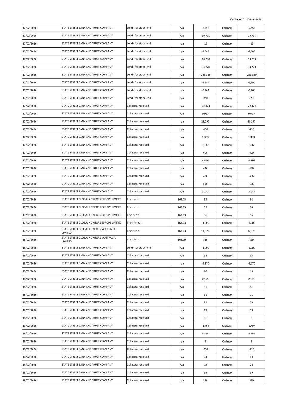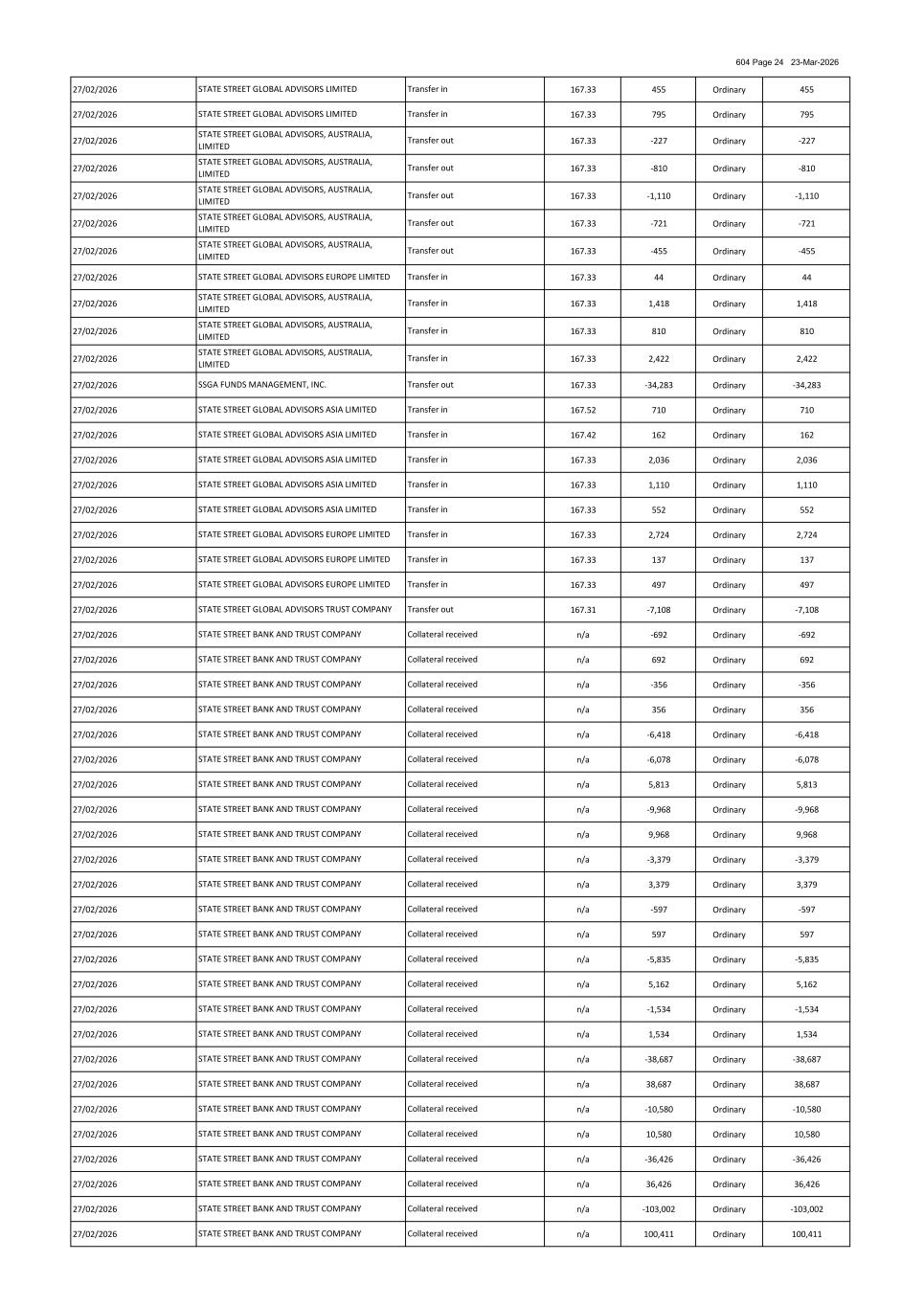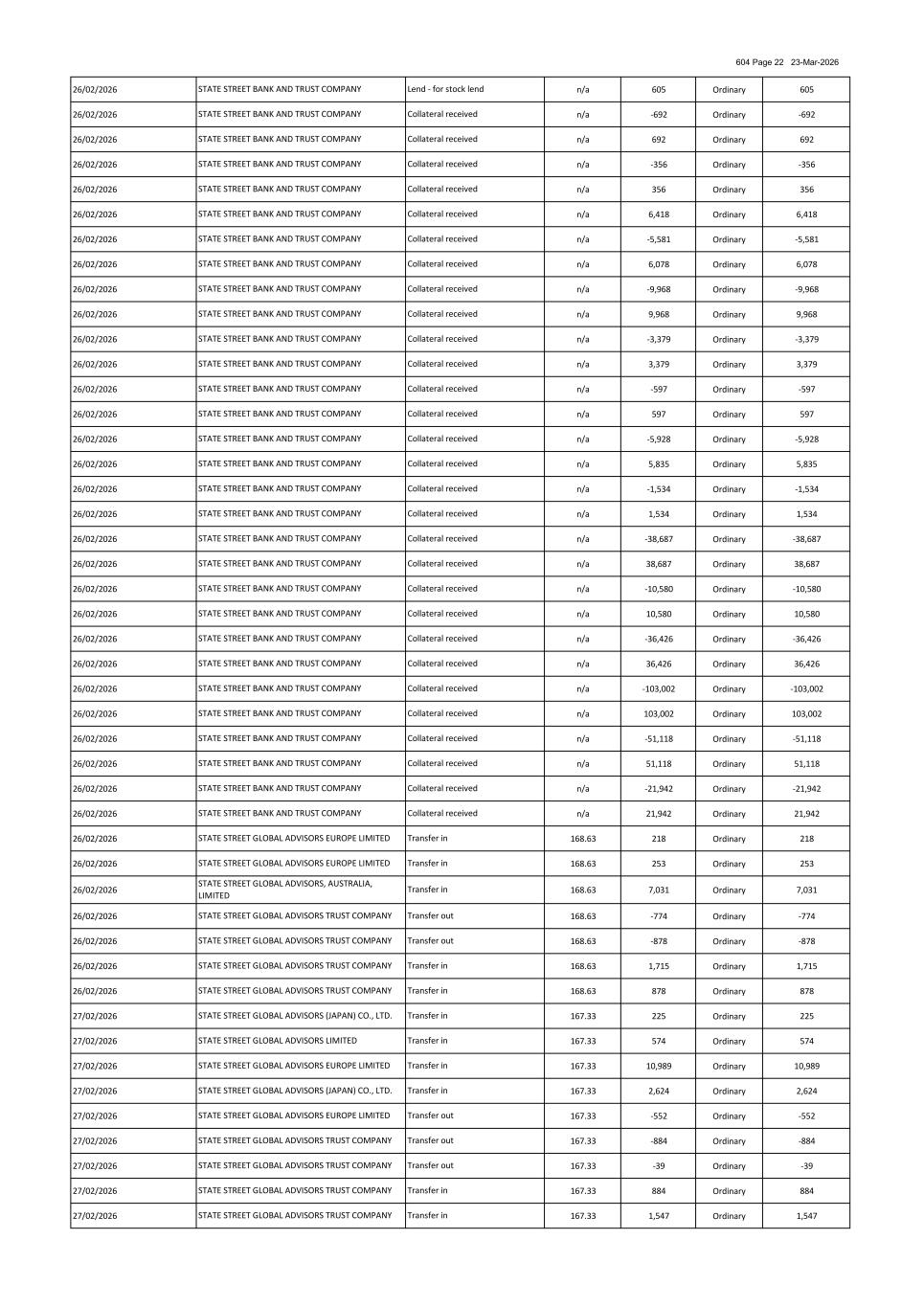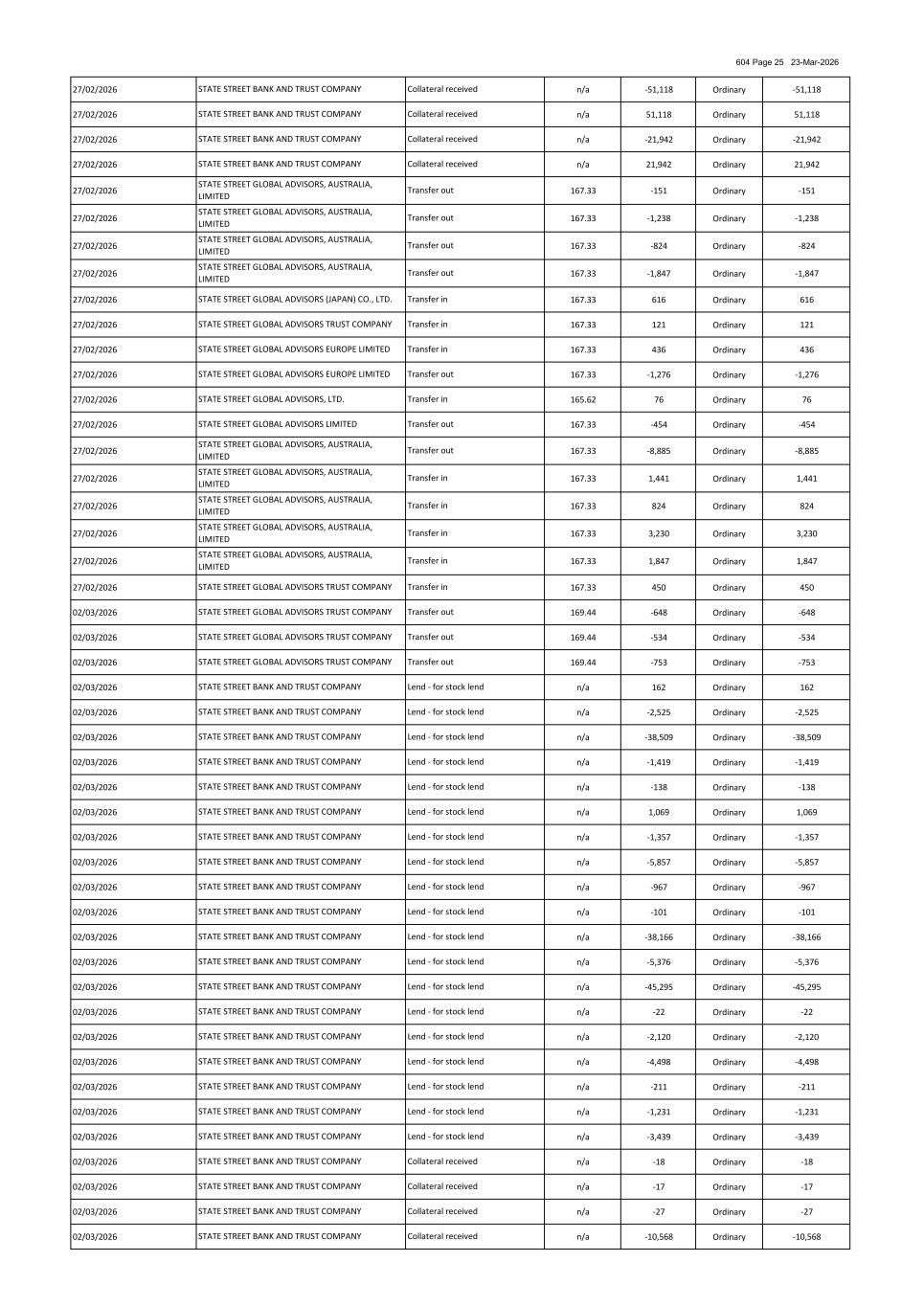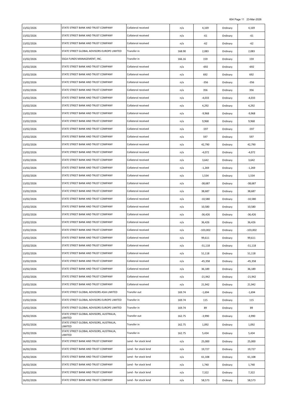 604 Page 23 23-Mar-2026 27/02/2026 n/a 2,857 Ordinary 2,857 27/02/2026 n/a 7,018 Ordinary 7,018 27/02/2026 n/a 44 Ordinary 44 27/02/2026 n/a 327 Ordinary 327 27/02/2026 n/a -6,966 Ordinary -6,966 27/02/2026 n/a 18,737 Ordinary 18,737 27/02/2026 n/a -52 Ordinary -52 27/02/2026 n/a -63 Ordinary -63 27/02/2026 n/a -9,284 Ordinary -9,284 27/02/2026 n/a -9,535 Ordinary -9,535 27/02/2026 n/a -356,201 Ordinary -356,201 27/02/2026 n/a -10 Ordinary -10 27/02/2026 n/a -2,083 Ordinary -2,083 27/02/2026 n/a -81 Ordinary -81 27/02/2026 n/a -11 Ordinary -11 27/02/2026 n/a -79 Ordinary -79 27/02/2026 n/a -19 Ordinary -19 27/02/2026 n/a -24 Ordinary -24 27/02/2026 n/a 18 Ordinary 18 27/02/2026 n/a 497 Ordinary 497 27/02/2026 n/a 17 Ordinary 17 27/02/2026 n/a -867 Ordinary -867 27/02/2026 n/a 27 Ordinary 27 27/02/2026 n/a 10,568 Ordinary 10,568 27/02/2026 n/a 68 Ordinary 68 27/02/2026 n/a 471 Ordinary 471 27/02/2026 n/a 3 Ordinary 3 27/02/2026 n/a 492 Ordinary 492 27/02/2026 n/a 124 Ordinary 124 27/02/2026 n/a 176 Ordinary 176 27/02/2026 n/a 165 Ordinary 165 27/02/2026 n/a 24 Ordinary 24 27/02/2026 n/a 15,716 Ordinary 15,716 27/02/2026 n/a 3,941 Ordinary 3,941 27/02/2026 n/a 6 Ordinary 6 27/02/2026 n/a 2,823 Ordinary 2,823 27/02/2026 n/a -4,354 Ordinary -4,354 27/02/2026 n/a -8 Ordinary -8 27/02/2026 n/a -53 Ordinary -53 27/02/2026 n/a -30 Ordinary -30 27/02/2026 n/a -61 Ordinary -61 27/02/2026 n/a -562 Ordinary -562 27/02/2026 n/a -158 Ordinary -158 27/02/2026 n/a -900 Ordinary -900 27/02/2026 n/a 605 Ordinary 605 27/02/2026 167.33 721 Ordinary 721 27/02/2026 167.33 1,260 Ordinary 1,260 Collateral received STATE STREET BANK AND TRUST COMPANY Collateral received STATE STREET BANK AND TRUST COMPANY Collateral received STATE STREET BANK AND TRUST COMPANY Lend - for stock lend Collateral received STATE STREET BANK AND TRUST COMPANY Collateral received STATE STREET BANK AND TRUST COMPANY STATE STREET BANK AND TRUST COMPANY Collateral received STATE STREET BANK AND TRUST COMPANY Collateral received Collateral received STATE STREET BANK AND TRUST COMPANY Borrow - for stock borrows Collateral received STATE STREET BANK AND TRUST COMPANY Collateral received STATE STREET BANK AND TRUST COMPANY STATE STREET BANK AND TRUST COMPANY STATE STREET BANK AND TRUST COMPANY Lend - for stock lend STATE STREET BANK AND TRUST COMPANY Collateral received STATE STREET BANK AND TRUST COMPANY Collateral received STATE STREET BANK AND TRUST COMPANY Collateral received Lend - for stock lend STATE STREET GLOBAL ADVISORS EUROPE LIMITED STATE STREET BANK AND TRUST COMPANY Collateral received Collateral received STATE STREET BANK AND TRUST COMPANY Collateral received STATE STREET BANK AND TRUST COMPANY STATE STREET BANK AND TRUST COMPANY Lend - for stock lend STATE STREET BANK AND TRUST COMPANY STATE STREET BANK AND TRUST COMPANY Collateral received STATE STREET BANK AND TRUST COMPANY Collateral received Collateral received STATE STREET BANK AND TRUST COMPANY Transfer in Collateral received STATE STREET BANK AND TRUST COMPANY STATE STREET BANK AND TRUST COMPANY Collateral received STATE STREET BANK AND TRUST COMPANY Collateral received STATE STREET BANK AND TRUST COMPANY Collateral received STATE STREET BANK AND TRUST COMPANY Lend - for stock lend STATE STREET BANK AND TRUST COMPANY Collateral received STATE STREET BANK AND TRUST COMPANY Collateral received STATE STREET BANK AND TRUST COMPANY Collateral received STATE STREET BANK AND TRUST COMPANY Lend - for stock lend Collateral received STATE STREET BANK AND TRUST COMPANY Collateral received Collateral received STATE STREET BANK AND TRUST COMPANY STATE STREET BANK AND TRUST COMPANY STATE STREET BANK AND TRUST COMPANY Collateral received Collateral received STATE STREET BANK AND TRUST COMPANY Borrow - for stock borrows STATE STREET BANK AND TRUST COMPANY Collateral received STATE STREET BANK AND TRUST COMPANY STATE STREET BANK AND TRUST COMPANY Collateral received STATE STREET BANK AND TRUST COMPANY Transfer in STATE STREET BANK AND TRUST COMPANY Collateral received Collateral received STATE STREET BANK AND TRUST COMPANY Collateral received STATE STREET BANK AND TRUST COMPANY Lend - for stock lend STATE STREET GLOBAL ADVISORS EUROPE LIMITED STATE STREET BANK AND TRUST COMPANY