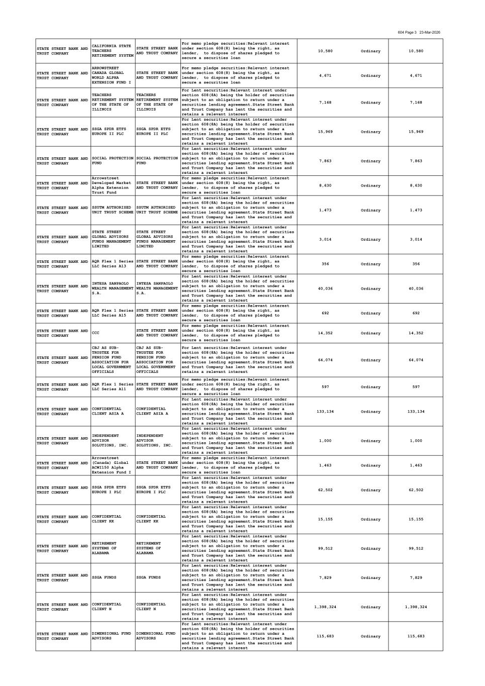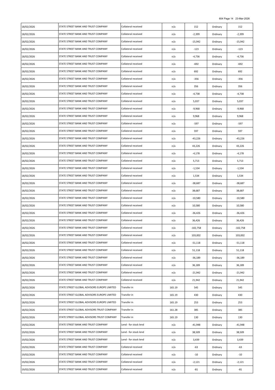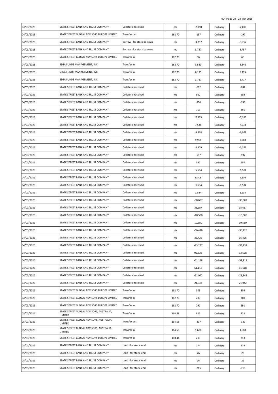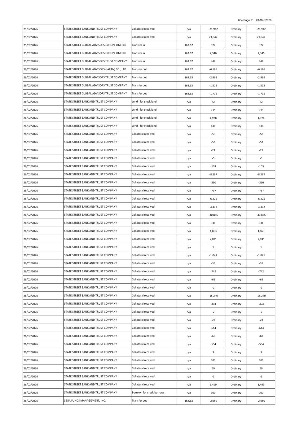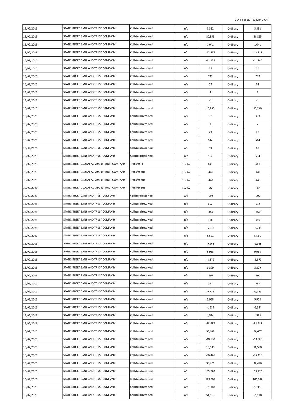 604 Page 23 23-Mar-2026 27/02/2026 n/a 2,857 Ordinary 2,857 27/02/2026 n/a 7,018 Ordinary 7,018 27/02/2026 n/a 44 Ordinary 44 27/02/2026 n/a 327 Ordinary 327 27/02/2026 n/a -6,966 Ordinary -6,966 27/02/2026 n/a 18,737 Ordinary 18,737 27/02/2026 n/a -52 Ordinary -52 27/02/2026 n/a -63 Ordinary -63 27/02/2026 n/a -9,284 Ordinary -9,284 27/02/2026 n/a -9,535 Ordinary -9,535 27/02/2026 n/a -356,201 Ordinary -356,201 27/02/2026 n/a -10 Ordinary -10 27/02/2026 n/a -2,083 Ordinary -2,083 27/02/2026 n/a -81 Ordinary -81 27/02/2026 n/a -11 Ordinary -11 27/02/2026 n/a -79 Ordinary -79 27/02/2026 n/a -19 Ordinary -19 27/02/2026 n/a -24 Ordinary -24 27/02/2026 n/a 18 Ordinary 18 27/02/2026 n/a 497 Ordinary 497 27/02/2026 n/a 17 Ordinary 17 27/02/2026 n/a -867 Ordinary -867 27/02/2026 n/a 27 Ordinary 27 27/02/2026 n/a 10,568 Ordinary 10,568 27/02/2026 n/a 68 Ordinary 68 27/02/2026 n/a 471 Ordinary 471 27/02/2026 n/a 3 Ordinary 3 27/02/2026 n/a 492 Ordinary 492 27/02/2026 n/a 124 Ordinary 124 27/02/2026 n/a 176 Ordinary 176 27/02/2026 n/a 165 Ordinary 165 27/02/2026 n/a 24 Ordinary 24 27/02/2026 n/a 15,716 Ordinary 15,716 27/02/2026 n/a 3,941 Ordinary 3,941 27/02/2026 n/a 6 Ordinary 6 27/02/2026 n/a 2,823 Ordinary 2,823 27/02/2026 n/a -4,354 Ordinary -4,354 27/02/2026 n/a -8 Ordinary -8 27/02/2026 n/a -53 Ordinary -53 27/02/2026 n/a -30 Ordinary -30 27/02/2026 n/a -61 Ordinary -61 27/02/2026 n/a -562 Ordinary -562 27/02/2026 n/a -158 Ordinary -158 27/02/2026 n/a -900 Ordinary -900 27/02/2026 n/a 605 Ordinary 605 27/02/2026 167.33 721 Ordinary 721 27/02/2026 167.33 1,260 Ordinary 1,260 Collateral received STATE STREET BANK AND TRUST COMPANY Collateral received STATE STREET BANK AND TRUST COMPANY Collateral received STATE STREET BANK AND TRUST COMPANY Lend - for stock lend Collateral received STATE STREET BANK AND TRUST COMPANY Collateral received STATE STREET BANK AND TRUST COMPANY STATE STREET BANK AND TRUST COMPANY Collateral received STATE STREET BANK AND TRUST COMPANY Collateral received Collateral received STATE STREET BANK AND TRUST COMPANY Borrow - for stock borrows Collateral received STATE STREET BANK AND TRUST COMPANY Collateral received STATE STREET BANK AND TRUST COMPANY STATE STREET BANK AND TRUST COMPANY STATE STREET BANK AND TRUST COMPANY Lend - for stock lend STATE STREET BANK AND TRUST COMPANY Collateral received STATE STREET BANK AND TRUST COMPANY Collateral received STATE STREET BANK AND TRUST COMPANY Collateral received Lend - for stock lend STATE STREET GLOBAL ADVISORS EUROPE LIMITED STATE STREET BANK AND TRUST COMPANY Collateral received Collateral received STATE STREET BANK AND TRUST COMPANY Collateral received STATE STREET BANK AND TRUST COMPANY STATE STREET BANK AND TRUST COMPANY Lend - for stock lend STATE STREET BANK AND TRUST COMPANY STATE STREET BANK AND TRUST COMPANY Collateral received STATE STREET BANK AND TRUST COMPANY Collateral received Collateral received STATE STREET BANK AND TRUST COMPANY Transfer in Collateral received STATE STREET BANK AND TRUST COMPANY STATE STREET BANK AND TRUST COMPANY Collateral received STATE STREET BANK AND TRUST COMPANY Collateral received STATE STREET BANK AND TRUST COMPANY Collateral received STATE STREET BANK AND TRUST COMPANY Lend - for stock lend STATE STREET BANK AND TRUST COMPANY Collateral received STATE STREET BANK AND TRUST COMPANY Collateral received STATE STREET BANK AND TRUST COMPANY Collateral received STATE STREET BANK AND TRUST COMPANY Lend - for stock lend Collateral received STATE STREET BANK AND TRUST COMPANY Collateral received Collateral received STATE STREET BANK AND TRUST COMPANY STATE STREET BANK AND TRUST COMPANY STATE STREET BANK AND TRUST COMPANY Collateral received Collateral received STATE STREET BANK AND TRUST COMPANY Borrow - for stock borrows STATE STREET BANK AND TRUST COMPANY Collateral received STATE STREET BANK AND TRUST COMPANY STATE STREET BANK AND TRUST COMPANY Collateral received STATE STREET BANK AND TRUST COMPANY Transfer in STATE STREET BANK AND TRUST COMPANY Collateral received Collateral received STATE STREET BANK AND TRUST COMPANY Collateral received STATE STREET BANK AND TRUST COMPANY Lend - for stock lend STATE STREET GLOBAL ADVISORS EUROPE LIMITED STATE STREET BANK AND TRUST COMPANY