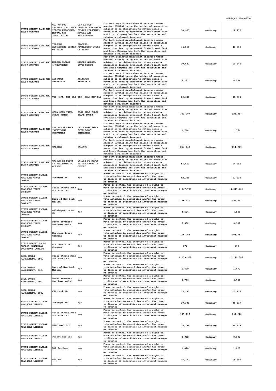 604 Page 22 23-Mar-2026 26/02/2026 n/a 605 Ordinary 605 26/02/2026 n/a -692 Ordinary -692 26/02/2026 n/a 692 Ordinary 692 26/02/2026 n/a -356 Ordinary -356 26/02/2026 n/a 356 Ordinary 356 26/02/2026 n/a 6,418 Ordinary 6,418 26/02/2026 n/a -5,581 Ordinary -5,581 26/02/2026 n/a 6,078 Ordinary 6,078 26/02/2026 n/a -9,968 Ordinary -9,968 26/02/2026 n/a 9,968 Ordinary 9,968 26/02/2026 n/a -3,379 Ordinary -3,379 26/02/2026 n/a 3,379 Ordinary 3,379 26/02/2026 n/a -597 Ordinary -597 26/02/2026 n/a 597 Ordinary 597 26/02/2026 n/a -5,928 Ordinary -5,928 26/02/2026 n/a 5,835 Ordinary 5,835 26/02/2026 n/a -1,534 Ordinary -1,534 26/02/2026 n/a 1,534 Ordinary 1,534 26/02/2026 n/a -38,687 Ordinary -38,687 26/02/2026 n/a 38,687 Ordinary 38,687 26/02/2026 n/a -10,580 Ordinary -10,580 26/02/2026 n/a 10,580 Ordinary 10,580 26/02/2026 n/a -36,426 Ordinary -36,426 26/02/2026 n/a 36,426 Ordinary 36,426 26/02/2026 n/a -103,002 Ordinary -103,002 26/02/2026 n/a 103,002 Ordinary 103,002 26/02/2026 n/a -51,118 Ordinary -51,118 26/02/2026 n/a 51,118 Ordinary 51,118 26/02/2026 n/a -21,942 Ordinary -21,942 26/02/2026 n/a 21,942 Ordinary 21,942 26/02/2026 168.63 218 Ordinary 218 26/02/2026 168.63 253 Ordinary 253 26/02/2026 168.63 7,031 Ordinary 7,031 26/02/2026 168.63 -774 Ordinary -774 26/02/2026 168.63 -878 Ordinary -878 26/02/2026 168.63 1,715 Ordinary 1,715 26/02/2026 168.63 878 Ordinary 878 27/02/2026 167.33 225 Ordinary 225 27/02/2026 167.33 574 Ordinary 574 27/02/2026 167.33 10,989 Ordinary 10,989 27/02/2026 167.33 2,624 Ordinary 2,624 27/02/2026 167.33 -552 Ordinary -552 27/02/2026 167.33 -884 Ordinary -884 27/02/2026 167.33 -39 Ordinary -39 27/02/2026 167.33 884 Ordinary 884 27/02/2026 167.33 1,547 Ordinary 1,547 STATE STREET GLOBAL ADVISORS TRUST COMPANY Transfer in Collateral received STATE STREET BANK AND TRUST COMPANY Collateral received Collateral received Transfer in STATE STREET BANK AND TRUST COMPANY Collateral received STATE STREET GLOBAL ADVISORS TRUST COMPANY STATE STREET BANK AND TRUST COMPANY Collateral received Collateral received STATE STREET BANK AND TRUST COMPANY Collateral received STATE STREET BANK AND TRUST COMPANY Transfer out STATE STREET BANK AND TRUST COMPANY STATE STREET GLOBAL ADVISORS TRUST COMPANY STATE STREET GLOBAL ADVISORS EUROPE LIMITED STATE STREET BANK AND TRUST COMPANY Collateral received Transfer in Collateral received STATE STREET BANK AND TRUST COMPANY STATE STREET BANK AND TRUST COMPANY STATE STREET GLOBAL ADVISORS TRUST COMPANY STATE STREET BANK AND TRUST COMPANY Collateral received Transfer in STATE STREET GLOBAL ADVISORS EUROPE LIMITED STATE STREET BANK AND TRUST COMPANY Collateral received Collateral received STATE STREET BANK AND TRUST COMPANY Transfer in STATE STREET GLOBAL ADVISORS TRUST COMPANY STATE STREET GLOBAL ADVISORS TRUST COMPANY Collateral received STATE STREET BANK AND TRUST COMPANY Collateral received Collateral received STATE STREET BANK AND TRUST COMPANY Transfer out STATE STREET GLOBAL ADVISORS (JAPAN) CO., LTD. STATE STREET BANK AND TRUST COMPANY Collateral received Transfer in Collateral received STATE STREET BANK AND TRUST COMPANY Transfer in STATE STREET BANK AND TRUST COMPANY STATE STREET BANK AND TRUST COMPANY STATE STREET GLOBAL ADVISORS (JAPAN) CO., LTD. Collateral received Transfer out Collateral received STATE STREET BANK AND TRUST COMPANY STATE STREET BANK AND TRUST COMPANY STATE STREET BANK AND TRUST COMPANY STATE STREET GLOBAL ADVISORS TRUST COMPANY Collateral received Transfer in STATE STREET BANK AND TRUST COMPANY STATE STREET GLOBAL ADVISORS, AUSTRALIA, LIMITED Collateral received Lend - for stock lend STATE STREET BANK AND TRUST COMPANY Transfer in Collateral received STATE STREET BANK AND TRUST COMPANY STATE STREET GLOBAL ADVISORS TRUST COMPANY Collateral received Collateral received Transfer out Collateral received STATE STREET BANK AND TRUST COMPANY STATE STREET GLOBAL ADVISORS LIMITED STATE STREET BANK AND TRUST COMPANY Transfer in Collateral received STATE STREET BANK AND TRUST COMPANY Transfer in STATE STREET BANK AND TRUST COMPANY Collateral received STATE STREET BANK AND TRUST COMPANY STATE STREET GLOBAL ADVISORS EUROPE LIMITED Collateral received Transfer out STATE STREET BANK AND TRUST COMPANY STATE STREET GLOBAL ADVISORS EUROPE LIMITED Collateral received