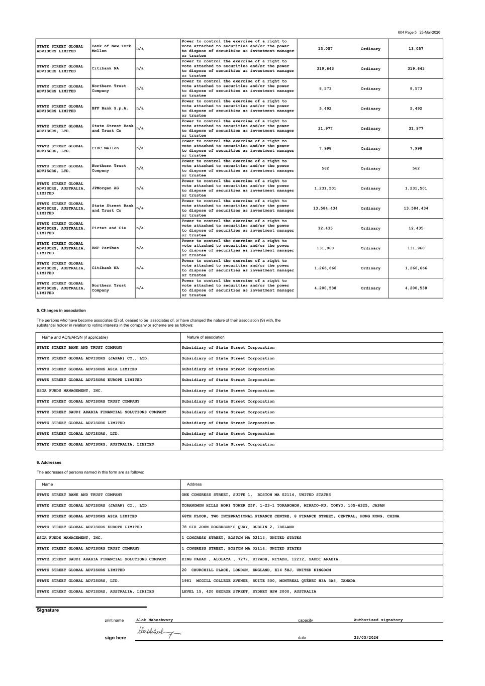 604 Page 5 23-Mar-2026 STATE STREET GLOBAL ADVISORS LIMITED 13,057 Ordinary 13,057 STATE STREET GLOBAL ADVISORS LIMITED 319,643 Ordinary 319,643 STATE STREET GLOBAL ADVISORS LIMITED 8,573 Ordinary 8,573 STATE STREET GLOBAL ADVISORS LIMITED 5,492 Ordinary 5,492 STATE STREET GLOBAL ADVISORS, LTD. 31,977 Ordinary 31,977 STATE STREET GLOBAL ADVISORS, LTD. 7,998 Ordinary 7,998 STATE STREET GLOBAL ADVISORS, LTD. 562 Ordinary 562 STATE STREET GLOBAL ADVISORS, AUSTRALIA, LIMITED 1,231,501 Ordinary 1,231,501 STATE STREET GLOBAL ADVISORS, AUSTRALIA, LIMITED 13,584,434 Ordinary 13,584,434 STATE STREET GLOBAL ADVISORS, AUSTRALIA, LIMITED 12,435 Ordinary 12,435 STATE STREET GLOBAL ADVISORS, AUSTRALIA, LIMITED 131,960 Ordinary 131,960 STATE STREET GLOBAL ADVISORS, AUSTRALIA, LIMITED 1,266,666 Ordinary 1,266,666 STATE STREET GLOBAL ADVISORS, AUSTRALIA, LIMITED 4,200,538 Ordinary 4,200,538 5. Changes in association The persons who have become associates (2) of, ceased to be associates of, or have changed the nature of their association (9) with, the substantial holder in relation to voting interests in the company or scheme are as follows: 6. Addresses The addresses of persons named in this form are as follows: Signature print name capacity sign here date 23/03/2026 STATE STREET GLOBAL ADVISORS LIMITED STATE STREET GLOBAL ADVISORS, LTD. STATE STREET GLOBAL ADVISORS, AUSTRALIA, LIMITED Power to control the exercise of a right to vote attached to securities and/or the power to dispose of securities as investment manager or trustee Power to control the exercise of a right to vote attached to securities and/or the power to dispose of securities as investment manager or trustee STATE STREET BANK AND TRUST COMPANY STATE STREET GLOBAL ADVISORS (JAPAN) CO., LTD. STATE STREET GLOBAL ADVISORS ASIA LIMITED STATE STREET GLOBAL ADVISORS EUROPE LIMITED SSGA FUNDS MANAGEMENT, INC. STATE STREET GLOBAL ADVISORS TRUST COMPANY STATE STREET SAUDI ARABIA FINANCIAL SOLUTIONS COMPANY Power to control the exercise of a right to vote attached to securities and/or the power to dispose of securities as investment manager or trustee Power to control the exercise of a right to vote attached to securities and/or the power to dispose of securities as investment manager or trustee Power to control the exercise of a right to vote attached to securities and/or the power to dispose of securities as investment manager or trustee Power to control the exercise of a right to vote attached to securities and/or the power to dispose of securities as investment manager or trustee Power to control the exercise of a right to vote attached to securities and/or the power to dispose of securities as investment manager or trustee Power to control the exercise of a right to vote attached to securities and/or the power to dispose of securities as investment manager or trustee Power to control the exercise of a right to vote attached to securities and/or the power to dispose of securities as investment manager or trustee Power to control the exercise of a right to vote attached to securities and/or the power to dispose of securities as investment manager or trustee Power to control the exercise of a right to vote attached to securities and/or the power to dispose of securities as investment manager or trustee Power to control the exercise of a right to vote attached to securities and/or the power to dispose of securities as investment manager or trustee Power to control the exercise of a right to vote attached to securities and/or the power to dispose of securities as investment manager or trustee Authorised signatory n/a 1 CONGRESS STREET, BOSTON MA 02114, UNITED STATES Bank of New York Mellon Subsidiary of State Street Corporation n/a STATE STREET GLOBAL ADVISORS, AUSTRALIA, LIMITED 1981 MCGILL COLLEGE AVENUE, SUITE 500, MONTREAL QUÉBEC H3A 3A8, CANADA BFF Bank S.p.A. Subsidiary of State Street Corporation State Street Bank and Trust Co STATE STREET GLOBAL ADVISORS EUROPE LIMITED Citibank NA Subsidiary of State Street Corporation STATE STREET GLOBAL ADVISORS LIMITED Name and ACN/ARSN (if applicable) 68TH FLOOR, TWO INTERNATIONAL FINANCE CENTRE, 8 FINANCE STREET, CENTRAL, HONG KONG, CHINA n/a STATE STREET SAUDI ARABIA FINANCIAL SOLUTIONS COMPANY KING FAHAD , ALOLAYA , 7277, RIYADH, RIYADH, 12212, SAUDI ARABIA Citibank NA Northern Trust Company Subsidiary of State Street Corporation 78 SIR JOHN ROGERSON’S QUAY, DUBLIN 2, IRELAND n/a Subsidiary of State Street Corporation Pictet and Cie n/a SSGA FUNDS MANAGEMENT, INC. ONE CONGRESS STREET, SUITE 1, BOSTON MA 02114, UNITED STATES n/a Subsidiary of State Street Corporation BNP Paribas n/a JPMorgan AG STATE STREET GLOBAL ADVISORS ASIA LIMITED TORANOMON HILLS MORI TOWER 25F, 1-23-1 TORANOMON, MINATO-KU, TOKYO, 105-6325, JAPAN Subsidiary of State Street Corporation LEVEL 15, 420 GEORGE STREET, SYDNEY NSW 2000, AUSTRALIA State Street Bank and Trust Co Subsidiary of State Street Corporation STATE STREET GLOBAL ADVISORS TRUST COMPANY STATE STREET GLOBAL ADVISORS (JAPAN) CO., LTD. Northern Trust Company Alok Maheshwary Subsidiary of State Street Corporation Name n/a Address n/a CIBC Mellon n/a 20 CHURCHILL PLACE, LONDON, ENGLAND, E14 5HJ, UNITED KINGDOM Northern Trust Company STATE STREET BANK AND TRUST COMPANY n/a 1 CONGRESS STREET, BOSTON MA 02114, UNITED STATES n/a Nature of association n/a Subsidiary of State Street Corporation STATE STREET GLOBAL ADVISORS, LTD.