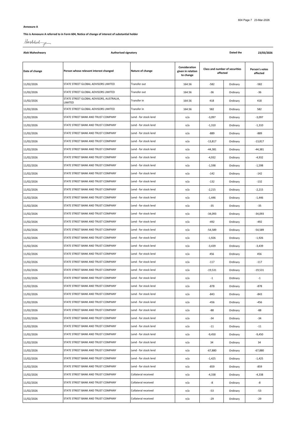 604 Page 7 23-Mar-2026 Annexure A This is Annexure A referred to in Form 604, Notice of change of interest of substantial holder 23/03/2026 Date of change Consideration given in relation to change Person's votes affected 11/02/2026 164.56 -582 Ordinary -582 11/02/2026 164.56 -36 Ordinary -36 11/02/2026 164.56 418 Ordinary 418 11/02/2026 164.56 582 Ordinary 582 11/02/2026 n/a -3,097 Ordinary -3,097 11/02/2026 n/a -1,310 Ordinary -1,310 11/02/2026 n/a -889 Ordinary -889 11/02/2026 n/a -13,817 Ordinary -13,817 11/02/2026 n/a -44,381 Ordinary -44,381 11/02/2026 n/a -4,932 Ordinary -4,932 11/02/2026 n/a -1,598 Ordinary -1,598 11/02/2026 n/a -142 Ordinary -142 11/02/2026 n/a -132 Ordinary -132 11/02/2026 n/a -2,215 Ordinary -2,215 11/02/2026 n/a -1,446 Ordinary -1,446 11/02/2026 n/a -35 Ordinary -35 11/02/2026 n/a -34,093 Ordinary -34,093 11/02/2026 n/a -492 Ordinary -492 11/02/2026 n/a -54,589 Ordinary -54,589 11/02/2026 n/a -1,926 Ordinary -1,926 11/02/2026 n/a -3,439 Ordinary -3,439 11/02/2026 n/a 456 Ordinary 456 11/02/2026 n/a -117 Ordinary -117 11/02/2026 n/a -19,531 Ordinary -19,531 11/02/2026 n/a -1 Ordinary -1 11/02/2026 n/a -878 Ordinary -878 11/02/2026 n/a -843 Ordinary -843 11/02/2026 n/a -456 Ordinary -456 11/02/2026 n/a -88 Ordinary -88 11/02/2026 n/a -34 Ordinary -34 11/02/2026 n/a -11 Ordinary -11 11/02/2026 n/a -9,450 Ordinary -9,450 11/02/2026 n/a 34 Ordinary 34 11/02/2026 n/a -67,880 Ordinary -67,880 11/02/2026 n/a -1,425 Ordinary -1,425 11/02/2026 n/a -859 Ordinary -859 11/02/2026 n/a -4,338 Ordinary -4,338 11/02/2026 n/a -8 Ordinary -8 11/02/2026 n/a -53 Ordinary -53 11/02/2026 n/a -29 Ordinary -29 Alok Maheshwary Authorised signatory Dated the STATE STREET BANK AND TRUST COMPANY Lend - for stock lend STATE STREET GLOBAL ADVISORS LIMITED Lend - for stock lend Lend - for stock lend Transfer in STATE STREET BANK AND TRUST COMPANY Lend - for stock lend Lend - for stock lend Collateral received STATE STREET BANK AND TRUST COMPANY STATE STREET BANK AND TRUST COMPANY STATE STREET BANK AND TRUST COMPANY Lend - for stock lend STATE STREET BANK AND TRUST COMPANY STATE STREET BANK AND TRUST COMPANY STATE STREET BANK AND TRUST COMPANY Lend - for stock lend Nature of change Lend - for stock lend STATE STREET BANK AND TRUST COMPANY STATE STREET GLOBAL ADVISORS LIMITED Lend - for stock lend STATE STREET BANK AND TRUST COMPANY STATE STREET BANK AND TRUST COMPANY Lend - for stock lend STATE STREET BANK AND TRUST COMPANY Lend - for stock lend STATE STREET GLOBAL ADVISORS LIMITED Lend - for stock lend STATE STREET BANK AND TRUST COMPANY Lend - for stock lend Lend - for stock lend STATE STREET BANK AND TRUST COMPANY STATE STREET BANK AND TRUST COMPANY Lend - for stock lend STATE STREET BANK AND TRUST COMPANY Transfer out Lend - for stock lend STATE STREET BANK AND TRUST COMPANY Lend - for stock lend STATE STREET BANK AND TRUST COMPANY STATE STREET BANK AND TRUST COMPANY Collateral received Class and number of securities affected STATE STREET BANK AND TRUST COMPANY Lend - for stock lend Lend - for stock lend STATE STREET BANK AND TRUST COMPANY Lend - for stock lend Lend - for stock lend STATE STREET BANK AND TRUST COMPANY STATE STREET BANK AND TRUST COMPANY STATE STREET BANK AND TRUST COMPANY Lend - for stock lend STATE STREET GLOBAL ADVISORS, AUSTRALIA, LIMITED Person whose relevant interest changed Lend - for stock lend Lend - for stock lend Lend - for stock lend STATE STREET BANK AND TRUST COMPANY STATE STREET BANK AND TRUST COMPANY STATE STREET BANK AND TRUST COMPANY STATE STREET BANK AND TRUST COMPANY Lend - for stock lend Transfer in Lend - for stock lend STATE STREET BANK AND TRUST COMPANY Lend - for stock lend STATE STREET BANK AND TRUST COMPANY STATE STREET BANK AND TRUST COMPANY Collateral received STATE STREET BANK AND TRUST COMPANY Transfer out Lend - for stock lend STATE STREET BANK AND TRUST COMPANY Lend - for stock lend Collateral received Lend - for stock lend STATE STREET BANK AND TRUST COMPANY STATE STREET BANK AND TRUST COMPANY Lend - for stock lend STATE STREET BANK AND TRUST COMPANY