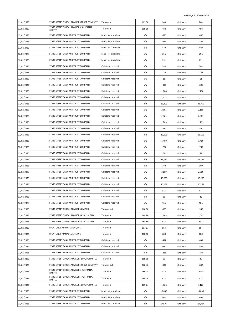 604 Page 11 23-Mar-2026 13/02/2026 n/a 4,169 Ordinary 4,169 13/02/2026 n/a -61 Ordinary -61 13/02/2026 n/a -62 Ordinary -62 13/02/2026 168.90 2,083 Ordinary 2,083 13/02/2026 166.16 159 Ordinary 159 13/02/2026 n/a -692 Ordinary -692 13/02/2026 n/a 692 Ordinary 692 13/02/2026 n/a -356 Ordinary -356 13/02/2026 n/a 356 Ordinary 356 13/02/2026 n/a -4,033 Ordinary -4,033 13/02/2026 n/a 4,292 Ordinary 4,292 13/02/2026 n/a -9,968 Ordinary -9,968 13/02/2026 n/a 9,968 Ordinary 9,968 13/02/2026 n/a -597 Ordinary -597 13/02/2026 n/a 597 Ordinary 597 13/02/2026 n/a 42,790 Ordinary 42,790 13/02/2026 n/a -4,072 Ordinary -4,072 13/02/2026 n/a 3,642 Ordinary 3,642 13/02/2026 n/a -1,269 Ordinary -1,269 13/02/2026 n/a 1,534 Ordinary 1,534 13/02/2026 n/a -38,687 Ordinary -38,687 13/02/2026 n/a 38,687 Ordinary 38,687 13/02/2026 n/a -10,580 Ordinary -10,580 13/02/2026 n/a 10,580 Ordinary 10,580 13/02/2026 n/a -36,426 Ordinary -36,426 13/02/2026 n/a 36,426 Ordinary 36,426 13/02/2026 n/a -103,002 Ordinary -103,002 13/02/2026 n/a 99,611 Ordinary 99,611 13/02/2026 n/a -51,118 Ordinary -51,118 13/02/2026 n/a 51,118 Ordinary 51,118 13/02/2026 n/a -45,358 Ordinary -45,358 13/02/2026 n/a 36,189 Ordinary 36,189 13/02/2026 n/a -21,942 Ordinary -21,942 13/02/2026 n/a 21,942 Ordinary 21,942 13/02/2026 169.74 -1,694 Ordinary -1,694 13/02/2026 169.74 115 Ordinary 115 13/02/2026 169.74 89 Ordinary 89 16/02/2026 162.75 -3,990 Ordinary -3,990 16/02/2026 162.75 1,092 Ordinary 1,092 16/02/2026 162.75 5,434 Ordinary 5,434 16/02/2026 n/a 25,000 Ordinary 25,000 16/02/2026 n/a 19,727 Ordinary 19,727 16/02/2026 n/a 61,108 Ordinary 61,108 16/02/2026 n/a 1,740 Ordinary 1,740 16/02/2026 n/a 7,322 Ordinary 7,322 16/02/2026 n/a 58,573 Ordinary 58,573 STATE STREET BANK AND TRUST COMPANY Lend - for stock lend STATE STREET GLOBAL ADVISORS EUROPE LIMITED STATE STREET BANK AND TRUST COMPANY Transfer in Transfer in Collateral received Collateral received Collateral received Collateral received STATE STREET BANK AND TRUST COMPANY STATE STREET BANK AND TRUST COMPANY STATE STREET BANK AND TRUST COMPANY Transfer in STATE STREET BANK AND TRUST COMPANY STATE STREET BANK AND TRUST COMPANY STATE STREET BANK AND TRUST COMPANY Collateral received SSGA FUNDS MANAGEMENT, INC. Collateral received Collateral received STATE STREET BANK AND TRUST COMPANY Collateral received Collateral received STATE STREET BANK AND TRUST COMPANY STATE STREET BANK AND TRUST COMPANY STATE STREET GLOBAL ADVISORS, AUSTRALIA, LIMITED Lend - for stock lend STATE STREET BANK AND TRUST COMPANY Collateral received Collateral received STATE STREET BANK AND TRUST COMPANY STATE STREET BANK AND TRUST COMPANY Lend - for stock lend Collateral received Collateral received STATE STREET BANK AND TRUST COMPANY Collateral received Collateral received STATE STREET GLOBAL ADVISORS ASIA LIMITED STATE STREET BANK AND TRUST COMPANY Transfer in STATE STREET BANK AND TRUST COMPANY STATE STREET BANK AND TRUST COMPANY STATE STREET BANK AND TRUST COMPANY Collateral received Transfer in Collateral received STATE STREET BANK AND TRUST COMPANY Collateral received STATE STREET BANK AND TRUST COMPANY STATE STREET GLOBAL ADVISORS EUROPE LIMITED STATE STREET BANK AND TRUST COMPANY STATE STREET GLOBAL ADVISORS, AUSTRALIA, LIMITED STATE STREET BANK AND TRUST COMPANY Collateral received STATE STREET BANK AND TRUST COMPANY STATE STREET BANK AND TRUST COMPANY Collateral received Collateral received Transfer in STATE STREET BANK AND TRUST COMPANY Collateral received Collateral received STATE STREET GLOBAL ADVISORS EUROPE LIMITED Lend - for stock lend STATE STREET BANK AND TRUST COMPANY Lend - for stock lend STATE STREET BANK AND TRUST COMPANY Collateral received STATE STREET BANK AND TRUST COMPANY Collateral received STATE STREET BANK AND TRUST COMPANY Transfer out Collateral received Collateral received STATE STREET BANK AND TRUST COMPANY STATE STREET BANK AND TRUST COMPANY STATE STREET BANK AND TRUST COMPANY Transfer out STATE STREET BANK AND TRUST COMPANY STATE STREET BANK AND TRUST COMPANY Collateral received STATE STREET BANK AND TRUST COMPANY STATE STREET BANK AND TRUST COMPANY Collateral received Collateral received STATE STREET BANK AND TRUST COMPANY Collateral received Collateral received STATE STREET GLOBAL ADVISORS, AUSTRALIA, LIMITED Lend - for stock lend