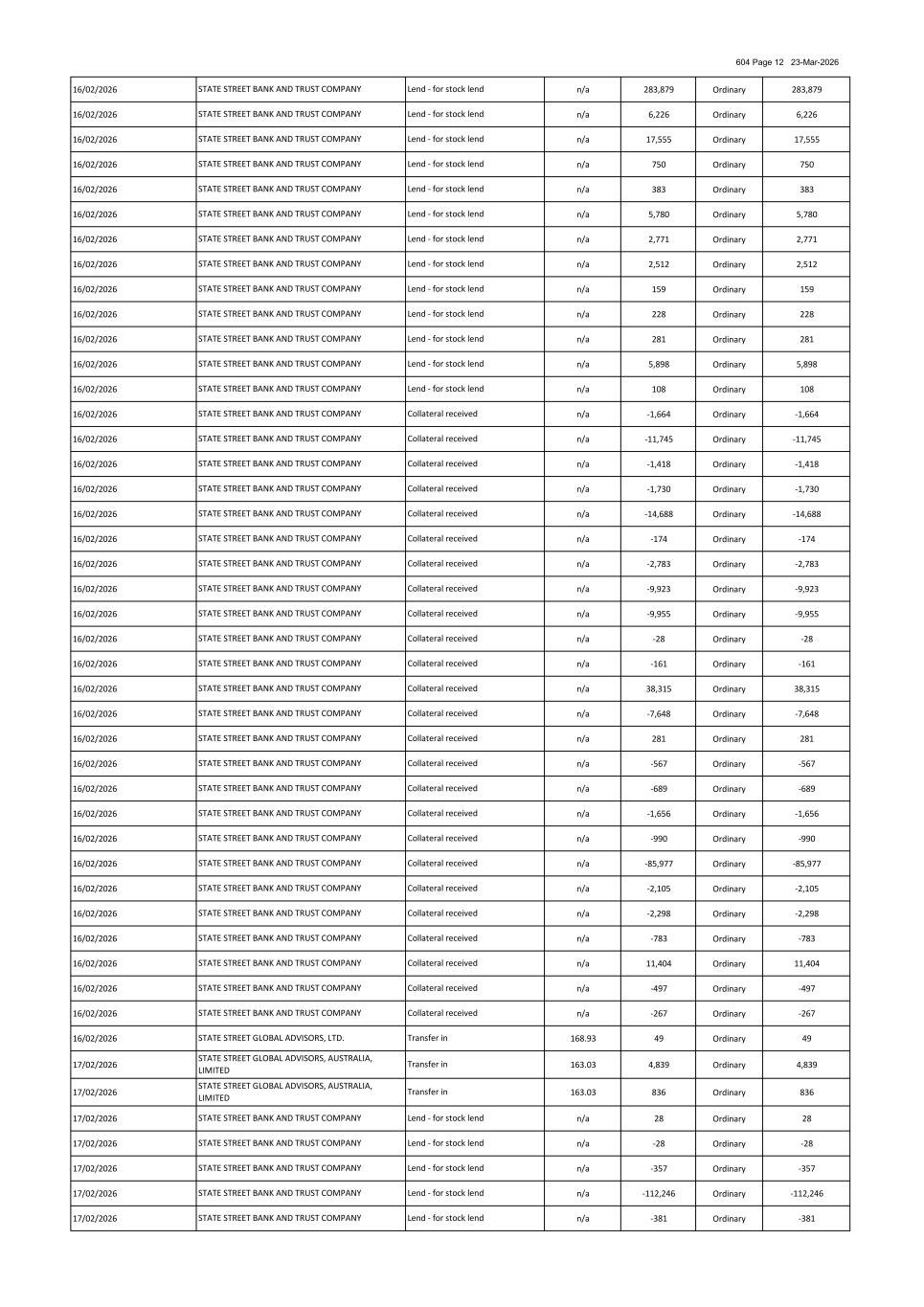 604 Page 12 23-Mar-2026 16/02/2026 n/a 283,879 Ordinary 283,879 16/02/2026 n/a 6,226 Ordinary 6,226 16/02/2026 n/a 17,555 Ordinary 17,555 16/02/2026 n/a 750 Ordinary 750 16/02/2026 n/a 383 Ordinary 383 16/02/2026 n/a 5,780 Ordinary 5,780 16/02/2026 n/a 2,771 Ordinary 2,771 16/02/2026 n/a 2,512 Ordinary 2,512 16/02/2026 n/a 159 Ordinary 159 16/02/2026 n/a 228 Ordinary 228 16/02/2026 n/a 281 Ordinary 281 16/02/2026 n/a 5,898 Ordinary 5,898 16/02/2026 n/a 108 Ordinary 108 16/02/2026 n/a -1,664 Ordinary -1,664 16/02/2026 n/a -11,745 Ordinary -11,745 16/02/2026 n/a -1,418 Ordinary -1,418 16/02/2026 n/a -1,730 Ordinary -1,730 16/02/2026 n/a -14,688 Ordinary -14,688 16/02/2026 n/a -174 Ordinary -174 16/02/2026 n/a -2,783 Ordinary -2,783 16/02/2026 n/a -9,923 Ordinary -9,923 16/02/2026 n/a -9,955 Ordinary -9,955 16/02/2026 n/a -28 Ordinary -28 16/02/2026 n/a -161 Ordinary -161 16/02/2026 n/a 38,315 Ordinary 38,315 16/02/2026 n/a -7,648 Ordinary -7,648 16/02/2026 n/a 281 Ordinary 281 16/02/2026 n/a -567 Ordinary -567 16/02/2026 n/a -689 Ordinary -689 16/02/2026 n/a -1,656 Ordinary -1,656 16/02/2026 n/a -990 Ordinary -990 16/02/2026 n/a -85,977 Ordinary -85,977 16/02/2026 n/a -2,105 Ordinary -2,105 16/02/2026 n/a -2,298 Ordinary -2,298 16/02/2026 n/a -783 Ordinary -783 16/02/2026 n/a 11,404 Ordinary 11,404 16/02/2026 n/a -497 Ordinary -497 16/02/2026 n/a -267 Ordinary -267 16/02/2026 168.93 49 Ordinary 49 17/02/2026 163.03 4,839 Ordinary 4,839 17/02/2026 163.03 836 Ordinary 836 17/02/2026 n/a 28 Ordinary 28 17/02/2026 n/a -28 Ordinary -28 17/02/2026 n/a -357 Ordinary -357 17/02/2026 n/a -112,246 Ordinary -112,246 17/02/2026 n/a -381 Ordinary -381 STATE STREET BANK AND TRUST COMPANY Lend - for stock lend Collateral received STATE STREET BANK AND TRUST COMPANY Collateral received STATE STREET BANK AND TRUST COMPANY STATE STREET GLOBAL ADVISORS, AUSTRALIA, LIMITED STATE STREET BANK AND TRUST COMPANY STATE STREET BANK AND TRUST COMPANY STATE STREET BANK AND TRUST COMPANY Lend - for stock lend STATE STREET BANK AND TRUST COMPANY Collateral received Lend - for stock lend Collateral received Transfer in Collateral received Lend - for stock lend STATE STREET BANK AND TRUST COMPANY STATE STREET BANK AND TRUST COMPANY Collateral received STATE STREET BANK AND TRUST COMPANY STATE STREET BANK AND TRUST COMPANY Lend - for stock lend STATE STREET BANK AND TRUST COMPANY Collateral received STATE STREET BANK AND TRUST COMPANY STATE STREET BANK AND TRUST COMPANY Collateral received Lend - for stock lend STATE STREET BANK AND TRUST COMPANY STATE STREET BANK AND TRUST COMPANY Collateral received STATE STREET BANK AND TRUST COMPANY STATE STREET BANK AND TRUST COMPANY Lend - for stock lend STATE STREET BANK AND TRUST COMPANY Collateral received Lend - for stock lend Collateral received STATE STREET GLOBAL ADVISORS, LTD. Lend - for stock lend Collateral received Lend - for stock lend STATE STREET BANK AND TRUST COMPANY STATE STREET BANK AND TRUST COMPANY Collateral received STATE STREET BANK AND TRUST COMPANY STATE STREET BANK AND TRUST COMPANY Transfer in Collateral received STATE STREET BANK AND TRUST COMPANY Collateral received STATE STREET BANK AND TRUST COMPANY Collateral received Lend - for stock lend Lend - for stock lend STATE STREET BANK AND TRUST COMPANY STATE STREET BANK AND TRUST COMPANY Collateral received STATE STREET BANK AND TRUST COMPANY STATE STREET GLOBAL ADVISORS, AUSTRALIA, LIMITED STATE STREET BANK AND TRUST COMPANY Lend - for stock lend STATE STREET BANK AND TRUST COMPANY Collateral received STATE STREET BANK AND TRUST COMPANY Lend - for stock lend STATE STREET BANK AND TRUST COMPANY Collateral received Lend - for stock lend Collateral received STATE STREET BANK AND TRUST COMPANY STATE STREET BANK AND TRUST COMPANY STATE STREET BANK AND TRUST COMPANY Lend - for stock lend Collateral received Collateral received STATE STREET BANK AND TRUST COMPANY STATE STREET BANK AND TRUST COMPANY Collateral received Lend - for stock lend Transfer in STATE STREET BANK AND TRUST COMPANY STATE STREET BANK AND TRUST COMPANY STATE STREET BANK AND TRUST COMPANY STATE STREET BANK AND TRUST COMPANY STATE STREET BANK AND TRUST COMPANY Collateral received Lend - for stock lend STATE STREET BANK AND TRUST COMPANY Collateral received