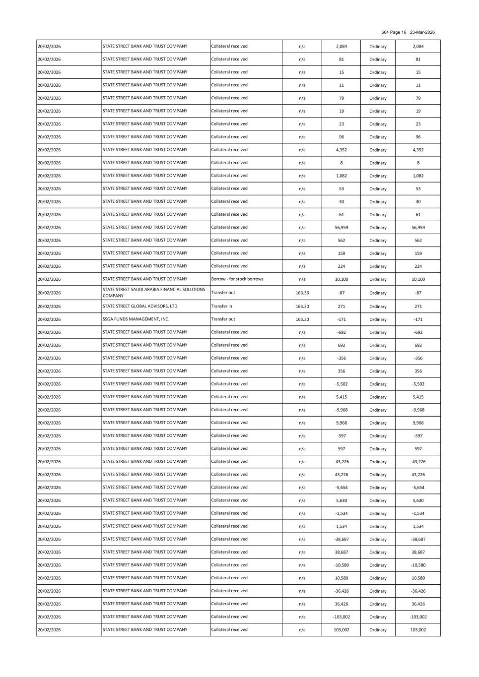 604 Page 16 23-Mar-2026 20/02/2026 n/a 2,084 Ordinary 2,084 20/02/2026 n/a 81 Ordinary 81 20/02/2026 n/a 15 Ordinary 15 20/02/2026 n/a 11 Ordinary 11 20/02/2026 n/a 79 Ordinary 79 20/02/2026 n/a 19 Ordinary 19 20/02/2026 n/a 23 Ordinary 23 20/02/2026 n/a 96 Ordinary 96 20/02/2026 n/a 4,352 Ordinary 4,352 20/02/2026 n/a 8 Ordinary 8 20/02/2026 n/a 1,082 Ordinary 1,082 20/02/2026 n/a 53 Ordinary 53 20/02/2026 n/a 30 Ordinary 30 20/02/2026 n/a 61 Ordinary 61 20/02/2026 n/a 56,959 Ordinary 56,959 20/02/2026 n/a 562 Ordinary 562 20/02/2026 n/a 159 Ordinary 159 20/02/2026 n/a 224 Ordinary 224 20/02/2026 n/a 10,100 Ordinary 10,100 20/02/2026 163.36 -87 Ordinary -87 20/02/2026 163.30 271 Ordinary 271 20/02/2026 163.30 -171 Ordinary -171 20/02/2026 n/a -692 Ordinary -692 20/02/2026 n/a 692 Ordinary 692 20/02/2026 n/a -356 Ordinary -356 20/02/2026 n/a 356 Ordinary 356 20/02/2026 n/a -5,502 Ordinary -5,502 20/02/2026 n/a 5,415 Ordinary 5,415 20/02/2026 n/a -9,968 Ordinary -9,968 20/02/2026 n/a 9,968 Ordinary 9,968 20/02/2026 n/a -597 Ordinary -597 20/02/2026 n/a 597 Ordinary 597 20/02/2026 n/a -43,226 Ordinary -43,226 20/02/2026 n/a 43,226 Ordinary 43,226 20/02/2026 n/a -5,654 Ordinary -5,654 20/02/2026 n/a 5,630 Ordinary 5,630 20/02/2026 n/a -1,534 Ordinary -1,534 20/02/2026 n/a 1,534 Ordinary 1,534 20/02/2026 n/a -38,687 Ordinary -38,687 20/02/2026 n/a 38,687 Ordinary 38,687 20/02/2026 n/a -10,580 Ordinary -10,580 20/02/2026 n/a 10,580 Ordinary 10,580 20/02/2026 n/a -36,426 Ordinary -36,426 20/02/2026 n/a 36,426 Ordinary 36,426 20/02/2026 n/a -103,002 Ordinary -103,002 20/02/2026 n/a 103,002 Ordinary 103,002 STATE STREET GLOBAL ADVISORS, LTD. STATE STREET BANK AND TRUST COMPANY Collateral received Collateral received Collateral received Collateral received STATE STREET BANK AND TRUST COMPANY STATE STREET BANK AND TRUST COMPANY STATE STREET BANK AND TRUST COMPANY STATE STREET BANK AND TRUST COMPANY STATE STREET BANK AND TRUST COMPANY Transfer out STATE STREET BANK AND TRUST COMPANY STATE STREET BANK AND TRUST COMPANY STATE STREET BANK AND TRUST COMPANY Collateral received Collateral received Collateral received STATE STREET BANK AND TRUST COMPANY Borrow - for stock borrows Collateral received STATE STREET BANK AND TRUST COMPANY STATE STREET BANK AND TRUST COMPANY STATE STREET BANK AND TRUST COMPANY Collateral received Collateral received Collateral received Collateral received STATE STREET BANK AND TRUST COMPANY Collateral received STATE STREET BANK AND TRUST COMPANY Collateral received STATE STREET BANK AND TRUST COMPANY Collateral received Collateral received STATE STREET BANK AND TRUST COMPANY STATE STREET SAUDI ARABIA FINANCIAL SOLUTIONS COMPANY Collateral received STATE STREET BANK AND TRUST COMPANY STATE STREET BANK AND TRUST COMPANY STATE STREET BANK AND TRUST COMPANY STATE STREET BANK AND TRUST COMPANY Collateral received Collateral received Collateral received Transfer in STATE STREET BANK AND TRUST COMPANY STATE STREET BANK AND TRUST COMPANY Collateral received STATE STREET BANK AND TRUST COMPANY STATE STREET BANK AND TRUST COMPANY Collateral received Collateral received Collateral received STATE STREET BANK AND TRUST COMPANY Collateral received Collateral received STATE STREET BANK AND TRUST COMPANY STATE STREET BANK AND TRUST COMPANY Collateral received Collateral received SSGA FUNDS MANAGEMENT, INC. Collateral received STATE STREET BANK AND TRUST COMPANY Collateral received STATE STREET BANK AND TRUST COMPANY Collateral received Collateral received STATE STREET BANK AND TRUST COMPANY STATE STREET BANK AND TRUST COMPANY Collateral received STATE STREET BANK AND TRUST COMPANY Collateral received STATE STREET BANK AND TRUST COMPANY STATE STREET BANK AND TRUST COMPANY STATE STREET BANK AND TRUST COMPANY Collateral received STATE STREET BANK AND TRUST COMPANY Collateral received STATE STREET BANK AND TRUST COMPANY Collateral received Transfer out STATE STREET BANK AND TRUST COMPANY Collateral received STATE STREET BANK AND TRUST COMPANY Collateral received Collateral received Collateral received STATE STREET BANK AND TRUST COMPANY Collateral received STATE STREET BANK AND TRUST COMPANY STATE STREET BANK AND TRUST COMPANY