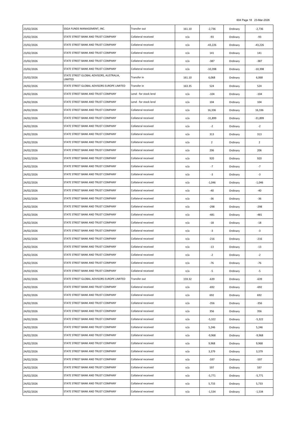 604 Page 18 23-Mar-2026 23/02/2026 161.10 -2,736 Ordinary -2,736 23/02/2026 n/a -93 Ordinary -93 23/02/2026 n/a -43,226 Ordinary -43,226 23/02/2026 n/a 141 Ordinary 141 23/02/2026 n/a -387 Ordinary -387 23/02/2026 n/a -10,398 Ordinary -10,398 23/02/2026 161.10 6,068 Ordinary 6,068 24/02/2026 163.35 524 Ordinary 524 24/02/2026 n/a -104 Ordinary -104 24/02/2026 n/a 104 Ordinary 104 24/02/2026 n/a 16,336 Ordinary 16,336 24/02/2026 n/a -31,899 Ordinary -31,899 24/02/2026 n/a -2 Ordinary -2 24/02/2026 n/a 313 Ordinary 313 24/02/2026 n/a 2 Ordinary 2 24/02/2026 n/a 206 Ordinary 206 24/02/2026 n/a 920 Ordinary 920 24/02/2026 n/a -7 Ordinary -7 24/02/2026 n/a -3 Ordinary -3 24/02/2026 n/a -1,046 Ordinary -1,046 24/02/2026 n/a -40 Ordinary -40 24/02/2026 n/a -36 Ordinary -36 24/02/2026 n/a -298 Ordinary -298 24/02/2026 n/a -481 Ordinary -481 24/02/2026 n/a -18 Ordinary -18 24/02/2026 n/a -3 Ordinary -3 24/02/2026 n/a -216 Ordinary -216 24/02/2026 n/a -13 Ordinary -13 24/02/2026 n/a -2 Ordinary -2 24/02/2026 n/a -76 Ordinary -76 24/02/2026 n/a -5 Ordinary -5 24/02/2026 159.32 -639 Ordinary -639 24/02/2026 n/a -692 Ordinary -692 24/02/2026 n/a 692 Ordinary 692 24/02/2026 n/a -356 Ordinary -356 24/02/2026 n/a 356 Ordinary 356 24/02/2026 n/a -5,322 Ordinary -5,322 24/02/2026 n/a 5,246 Ordinary 5,246 24/02/2026 n/a -9,968 Ordinary -9,968 24/02/2026 n/a 9,968 Ordinary 9,968 24/02/2026 n/a 3,379 Ordinary 3,379 24/02/2026 n/a -597 Ordinary -597 24/02/2026 n/a 597 Ordinary 597 24/02/2026 n/a -5,771 Ordinary -5,771 24/02/2026 n/a 5,733 Ordinary 5,733 24/02/2026 n/a -1,534 Ordinary -1,534 STATE STREET BANK AND TRUST COMPANY STATE STREET BANK AND TRUST COMPANY Collateral received Lend - for stock lend STATE STREET BANK AND TRUST COMPANY Collateral received STATE STREET BANK AND TRUST COMPANY Transfer out STATE STREET BANK AND TRUST COMPANY STATE STREET BANK AND TRUST COMPANY Collateral received Collateral received Collateral received STATE STREET BANK AND TRUST COMPANY STATE STREET BANK AND TRUST COMPANY STATE STREET BANK AND TRUST COMPANY Collateral received STATE STREET BANK AND TRUST COMPANY Collateral received Collateral received STATE STREET BANK AND TRUST COMPANY Collateral received Collateral received STATE STREET BANK AND TRUST COMPANY STATE STREET BANK AND TRUST COMPANY STATE STREET GLOBAL ADVISORS, AUSTRALIA, LIMITED STATE STREET BANK AND TRUST COMPANY STATE STREET BANK AND TRUST COMPANY Collateral received STATE STREET BANK AND TRUST COMPANY Collateral received STATE STREET BANK AND TRUST COMPANY STATE STREET BANK AND TRUST COMPANY Collateral received STATE STREET BANK AND TRUST COMPANY Collateral received Transfer in Collateral received Collateral received STATE STREET BANK AND TRUST COMPANY STATE STREET BANK AND TRUST COMPANY Collateral received Collateral received STATE STREET BANK AND TRUST COMPANY Collateral received STATE STREET BANK AND TRUST COMPANY STATE STREET BANK AND TRUST COMPANY SSGA FUNDS MANAGEMENT, INC. Collateral received Collateral received Collateral received STATE STREET BANK AND TRUST COMPANY STATE STREET BANK AND TRUST COMPANY STATE STREET BANK AND TRUST COMPANY STATE STREET BANK AND TRUST COMPANY Collateral received Collateral received Collateral received STATE STREET GLOBAL ADVISORS EUROPE LIMITED STATE STREET BANK AND TRUST COMPANY Collateral received Lend - for stock lend Collateral received STATE STREET BANK AND TRUST COMPANY STATE STREET BANK AND TRUST COMPANY Collateral received STATE STREET BANK AND TRUST COMPANY STATE STREET BANK AND TRUST COMPANY Collateral received Collateral received STATE STREET BANK AND TRUST COMPANY Transfer in Collateral received Collateral received STATE STREET BANK AND TRUST COMPANY Collateral received Collateral received STATE STREET BANK AND TRUST COMPANY Collateral received STATE STREET BANK AND TRUST COMPANY Collateral received Collateral received STATE STREET BANK AND TRUST COMPANY Transfer out STATE STREET BANK AND TRUST COMPANY Collateral received STATE STREET BANK AND TRUST COMPANY STATE STREET BANK AND TRUST COMPANY Collateral received Collateral received STATE STREET BANK AND TRUST COMPANY STATE STREET GLOBAL ADVISORS EUROPE LIMITED