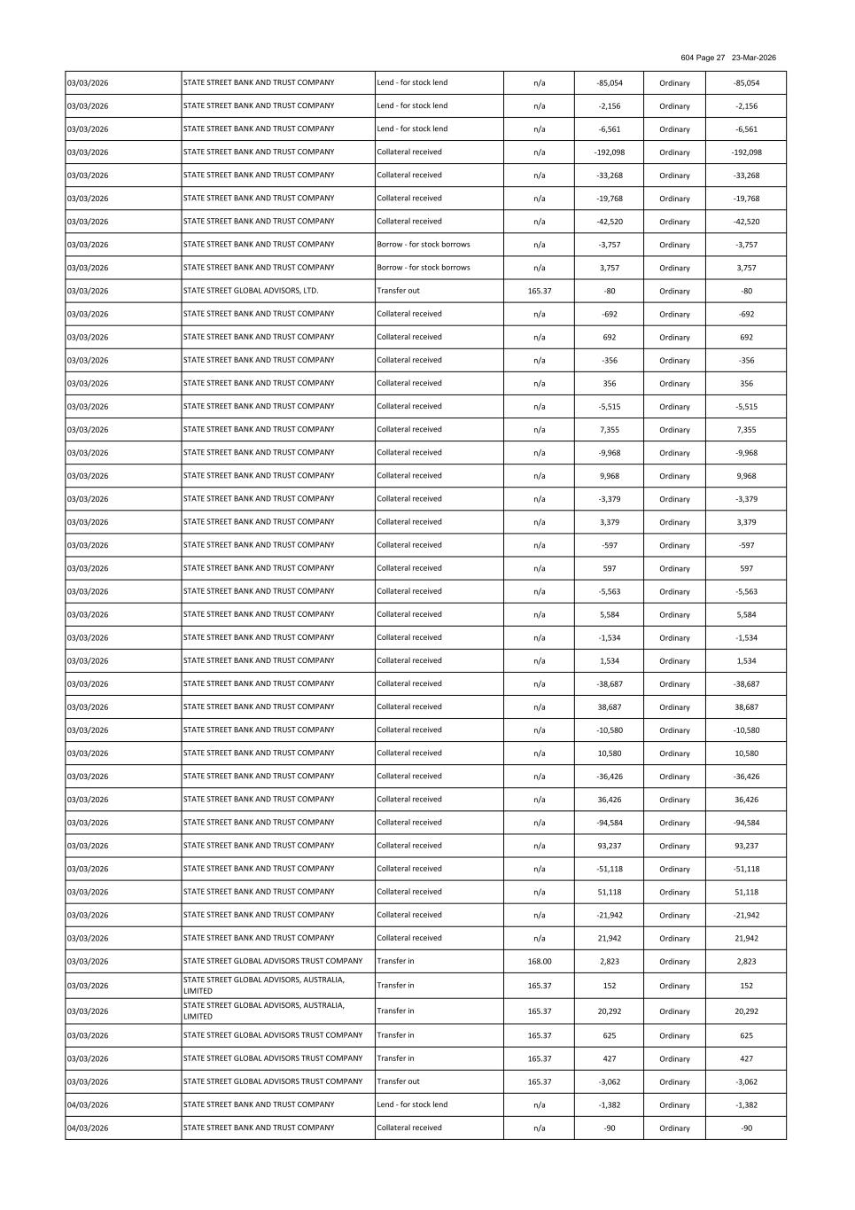 604 Page 27 23-Mar-2026 03/03/2026 n/a -85,054 Ordinary -85,054 03/03/2026 n/a -2,156 Ordinary -2,156 03/03/2026 n/a -6,561 Ordinary -6,561 03/03/2026 n/a -192,098 Ordinary -192,098 03/03/2026 n/a -33,268 Ordinary -33,268 03/03/2026 n/a -19,768 Ordinary -19,768 03/03/2026 n/a -42,520 Ordinary -42,520 03/03/2026 n/a -3,757 Ordinary -3,757 03/03/2026 n/a 3,757 Ordinary 3,757 03/03/2026 165.37 -80 Ordinary -80 03/03/2026 n/a -692 Ordinary -692 03/03/2026 n/a 692 Ordinary 692 03/03/2026 n/a -356 Ordinary -356 03/03/2026 n/a 356 Ordinary 356 03/03/2026 n/a -5,515 Ordinary -5,515 03/03/2026 n/a 7,355 Ordinary 7,355 03/03/2026 n/a -9,968 Ordinary -9,968 03/03/2026 n/a 9,968 Ordinary 9,968 03/03/2026 n/a -3,379 Ordinary -3,379 03/03/2026 n/a 3,379 Ordinary 3,379 03/03/2026 n/a -597 Ordinary -597 03/03/2026 n/a 597 Ordinary 597 03/03/2026 n/a -5,563 Ordinary -5,563 03/03/2026 n/a 5,584 Ordinary 5,584 03/03/2026 n/a -1,534 Ordinary -1,534 03/03/2026 n/a 1,534 Ordinary 1,534 03/03/2026 n/a -38,687 Ordinary -38,687 03/03/2026 n/a 38,687 Ordinary 38,687 03/03/2026 n/a -10,580 Ordinary -10,580 03/03/2026 n/a 10,580 Ordinary 10,580 03/03/2026 n/a -36,426 Ordinary -36,426 03/03/2026 n/a 36,426 Ordinary 36,426 03/03/2026 n/a -94,584 Ordinary -94,584 03/03/2026 n/a 93,237 Ordinary 93,237 03/03/2026 n/a -51,118 Ordinary -51,118 03/03/2026 n/a 51,118 Ordinary 51,118 03/03/2026 n/a -21,942 Ordinary -21,942 03/03/2026 n/a 21,942 Ordinary 21,942 03/03/2026 168.00 2,823 Ordinary 2,823 03/03/2026 165.37 152 Ordinary 152 03/03/2026 165.37 20,292 Ordinary 20,292 03/03/2026 165.37 625 Ordinary 625 03/03/2026 165.37 427 Ordinary 427 03/03/2026 165.37 -3,062 Ordinary -3,062 04/03/2026 n/a -1,382 Ordinary -1,382 04/03/2026 n/a -90 Ordinary -90 STATE STREET BANK AND TRUST COMPANY Collateral received Collateral received Transfer in STATE STREET BANK AND TRUST COMPANY STATE STREET BANK AND TRUST COMPANY STATE STREET GLOBAL ADVISORS TRUST COMPANY STATE STREET BANK AND TRUST COMPANY Collateral received STATE STREET BANK AND TRUST COMPANY Collateral received Collateral received STATE STREET BANK AND TRUST COMPANY Collateral received Transfer out Collateral received STATE STREET BANK AND TRUST COMPANY STATE STREET GLOBAL ADVISORS TRUST COMPANY Collateral received STATE STREET BANK AND TRUST COMPANY STATE STREET BANK AND TRUST COMPANY Collateral received STATE STREET BANK AND TRUST COMPANY STATE STREET BANK AND TRUST COMPANY Lend - for stock lend STATE STREET BANK AND TRUST COMPANY Collateral received STATE STREET BANK AND TRUST COMPANY Collateral received Transfer in STATE STREET BANK AND TRUST COMPANY Collateral received STATE STREET BANK AND TRUST COMPANY Collateral received STATE STREET BANK AND TRUST COMPANY STATE STREET BANK AND TRUST COMPANY Collateral received Transfer out STATE STREET BANK AND TRUST COMPANY Collateral received Borrow - for stock borrows Collateral received STATE STREET GLOBAL ADVISORS, AUSTRALIA, LIMITED STATE STREET BANK AND TRUST COMPANY Collateral received STATE STREET BANK AND TRUST COMPANY Collateral received STATE STREET BANK AND TRUST COMPANY STATE STREET GLOBAL ADVISORS TRUST COMPANY STATE STREET BANK AND TRUST COMPANY Collateral received Lend - for stock lend STATE STREET BANK AND TRUST COMPANY Collateral received Collateral received Transfer in STATE STREET BANK AND TRUST COMPANY STATE STREET BANK AND TRUST COMPANY STATE STREET GLOBAL ADVISORS, LTD. Collateral received STATE STREET BANK AND TRUST COMPANY STATE STREET BANK AND TRUST COMPANY Transfer in Collateral received STATE STREET BANK AND TRUST COMPANY Collateral received Collateral received STATE STREET BANK AND TRUST COMPANY STATE STREET BANK AND TRUST COMPANY Collateral received Lend - for stock lend Collateral received STATE STREET BANK AND TRUST COMPANY STATE STREET BANK AND TRUST COMPANY Collateral received STATE STREET GLOBAL ADVISORS, AUSTRALIA, LIMITED STATE STREET BANK AND TRUST COMPANY Borrow - for stock borrows Collateral received STATE STREET BANK AND TRUST COMPANY Collateral received STATE STREET GLOBAL ADVISORS TRUST COMPANY Collateral received STATE STREET BANK AND TRUST COMPANY STATE STREET BANK AND TRUST COMPANY STATE STREET BANK AND TRUST COMPANY Collateral received Transfer in STATE STREET BANK AND TRUST COMPANY STATE STREET BANK AND TRUST COMPANY Collateral received Lend - for stock lend
