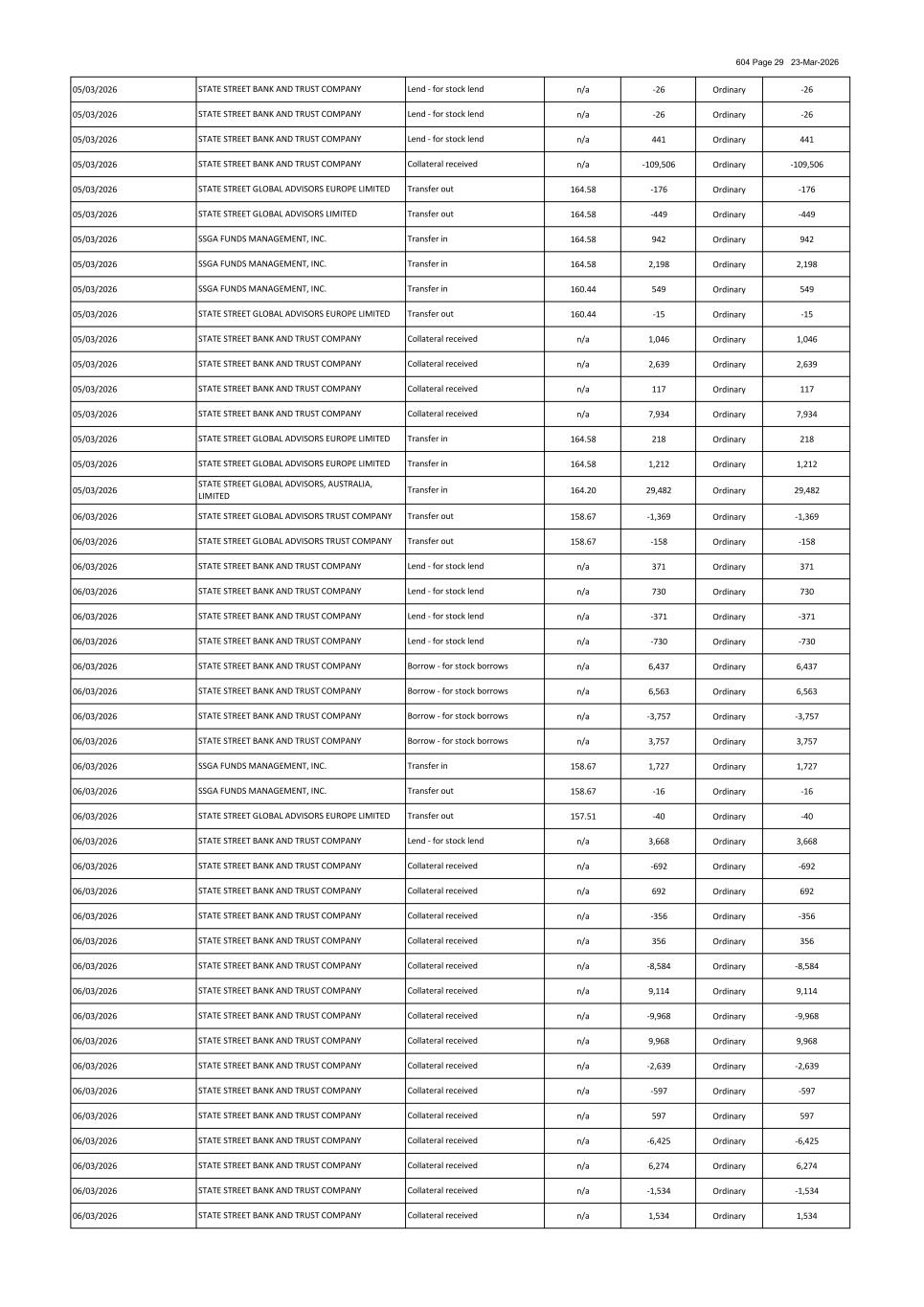 604 Page 29 23-Mar-2026 05/03/2026 n/a -26 Ordinary -26 05/03/2026 n/a -26 Ordinary -26 05/03/2026 n/a 441 Ordinary 441 05/03/2026 n/a -109,506 Ordinary -109,506 05/03/2026 164.58 -176 Ordinary -176 05/03/2026 164.58 -449 Ordinary -449 05/03/2026 164.58 942 Ordinary 942 05/03/2026 164.58 2,198 Ordinary 2,198 05/03/2026 160.44 549 Ordinary 549 05/03/2026 160.44 -15 Ordinary -15 05/03/2026 n/a 1,046 Ordinary 1,046 05/03/2026 n/a 2,639 Ordinary 2,639 05/03/2026 n/a 117 Ordinary 117 05/03/2026 n/a 7,934 Ordinary 7,934 05/03/2026 164.58 218 Ordinary 218 05/03/2026 164.58 1,212 Ordinary 1,212 05/03/2026 164.20 29,482 Ordinary 29,482 06/03/2026 158.67 -1,369 Ordinary -1,369 06/03/2026 158.67 -158 Ordinary -158 06/03/2026 n/a 371 Ordinary 371 06/03/2026 n/a 730 Ordinary 730 06/03/2026 n/a -371 Ordinary -371 06/03/2026 n/a -730 Ordinary -730 06/03/2026 n/a 6,437 Ordinary 6,437 06/03/2026 n/a 6,563 Ordinary 6,563 06/03/2026 n/a -3,757 Ordinary -3,757 06/03/2026 n/a 3,757 Ordinary 3,757 06/03/2026 158.67 1,727 Ordinary 1,727 06/03/2026 158.67 -16 Ordinary -16 06/03/2026 157.51 -40 Ordinary -40 06/03/2026 n/a 3,668 Ordinary 3,668 06/03/2026 n/a -692 Ordinary -692 06/03/2026 n/a 692 Ordinary 692 06/03/2026 n/a -356 Ordinary -356 06/03/2026 n/a 356 Ordinary 356 06/03/2026 n/a -8,584 Ordinary -8,584 06/03/2026 n/a 9,114 Ordinary 9,114 06/03/2026 n/a -9,968 Ordinary -9,968 06/03/2026 n/a 9,968 Ordinary 9,968 06/03/2026 n/a -2,639 Ordinary -2,639 06/03/2026 n/a -597 Ordinary -597 06/03/2026 n/a 597 Ordinary 597 06/03/2026 n/a -6,425 Ordinary -6,425 06/03/2026 n/a 6,274 Ordinary 6,274 06/03/2026 n/a -1,534 Ordinary -1,534 06/03/2026 n/a 1,534 Ordinary 1,534 Borrow - for stock borrows Lend - for stock lend STATE STREET BANK AND TRUST COMPANY STATE STREET BANK AND TRUST COMPANY SSGA FUNDS MANAGEMENT, INC. Collateral received Transfer in STATE STREET BANK AND TRUST COMPANY STATE STREET BANK AND TRUST COMPANY Collateral received Transfer out Transfer out Collateral received STATE STREET BANK AND TRUST COMPANY STATE STREET BANK AND TRUST COMPANY Transfer in STATE STREET BANK AND TRUST COMPANY Collateral received Collateral received SSGA FUNDS MANAGEMENT, INC. STATE STREET BANK AND TRUST COMPANY STATE STREET BANK AND TRUST COMPANY Lend - for stock lend Collateral received STATE STREET GLOBAL ADVISORS, AUSTRALIA, LIMITED Borrow - for stock borrows Transfer out STATE STREET BANK AND TRUST COMPANY STATE STREET GLOBAL ADVISORS LIMITED Collateral received STATE STREET BANK AND TRUST COMPANY Collateral received STATE STREET BANK AND TRUST COMPANY SSGA FUNDS MANAGEMENT, INC. Lend - for stock lend Borrow - for stock borrows STATE STREET BANK AND TRUST COMPANY STATE STREET BANK AND TRUST COMPANY Transfer in Transfer out STATE STREET BANK AND TRUST COMPANY Transfer out STATE STREET BANK AND TRUST COMPANY Collateral received STATE STREET BANK AND TRUST COMPANY STATE STREET BANK AND TRUST COMPANY Collateral received STATE STREET BANK AND TRUST COMPANY Transfer out STATE STREET GLOBAL ADVISORS EUROPE LIMITED Transfer in Lend - for stock lend Collateral received SSGA FUNDS MANAGEMENT, INC. STATE STREET BANK AND TRUST COMPANY STATE STREET GLOBAL ADVISORS TRUST COMPANY Collateral received Collateral received STATE STREET BANK AND TRUST COMPANY SSGA FUNDS MANAGEMENT, INC. STATE STREET BANK AND TRUST COMPANY Borrow - for stock borrows Collateral received Lend - for stock lend Transfer in STATE STREET BANK AND TRUST COMPANY Collateral received STATE STREET BANK AND TRUST COMPANY Collateral received STATE STREET BANK AND TRUST COMPANY STATE STREET GLOBAL ADVISORS EUROPE LIMITED STATE STREET BANK AND TRUST COMPANY Transfer in STATE STREET BANK AND TRUST COMPANY Transfer out Lend - for stock lend Lend - for stock lend Collateral received STATE STREET BANK AND TRUST COMPANY STATE STREET BANK AND TRUST COMPANY STATE STREET GLOBAL ADVISORS EUROPE LIMITED Transfer in STATE STREET BANK AND TRUST COMPANY Collateral received STATE STREET BANK AND TRUST COMPANY STATE STREET GLOBAL ADVISORS EUROPE LIMITED STATE STREET GLOBAL ADVISORS EUROPE LIMITED STATE STREET BANK AND TRUST COMPANY Lend - for stock lend Collateral received Collateral received STATE STREET GLOBAL ADVISORS TRUST COMPANY