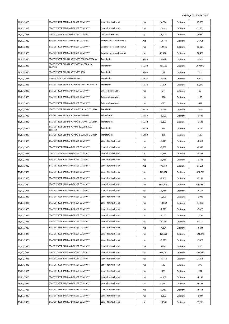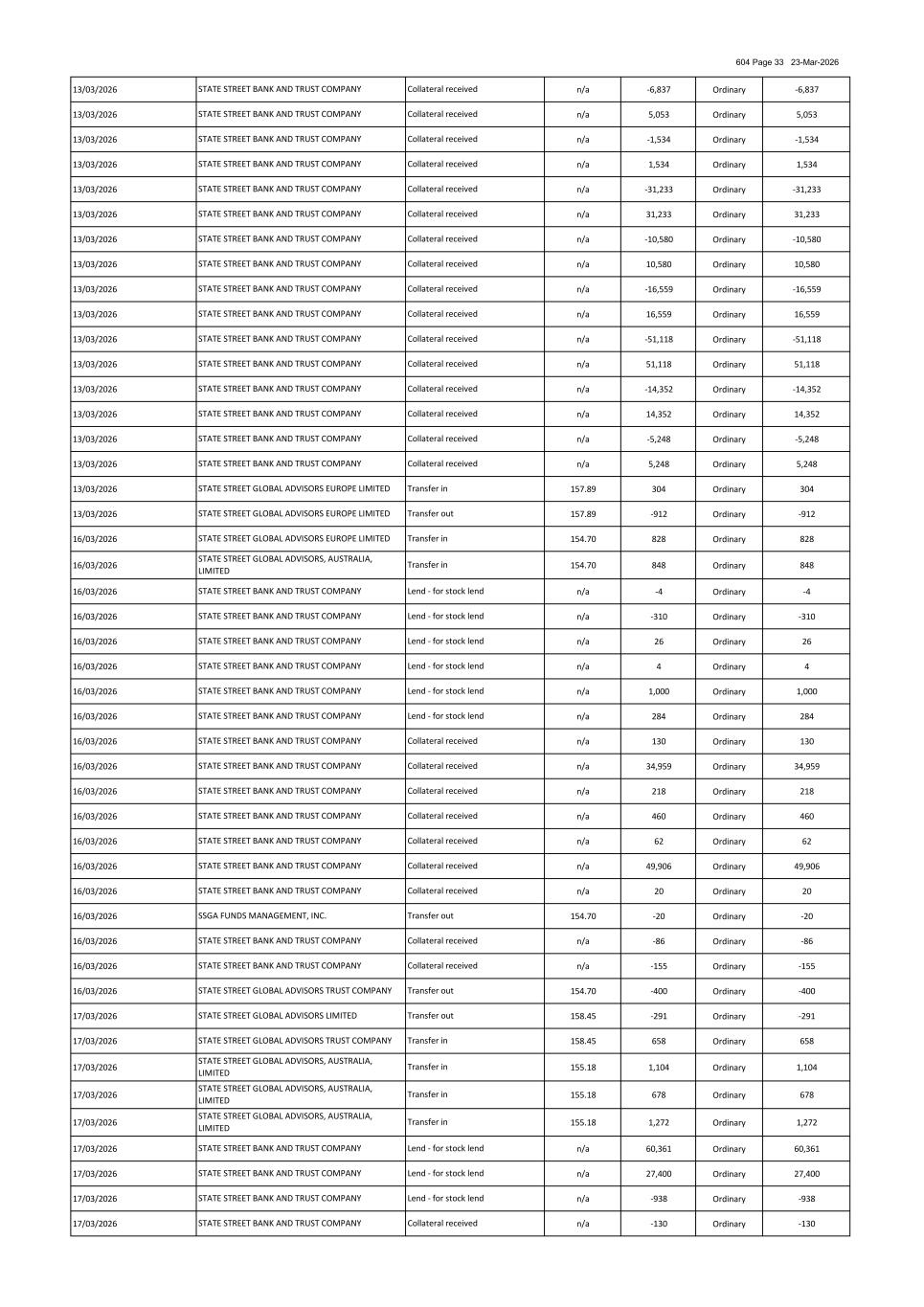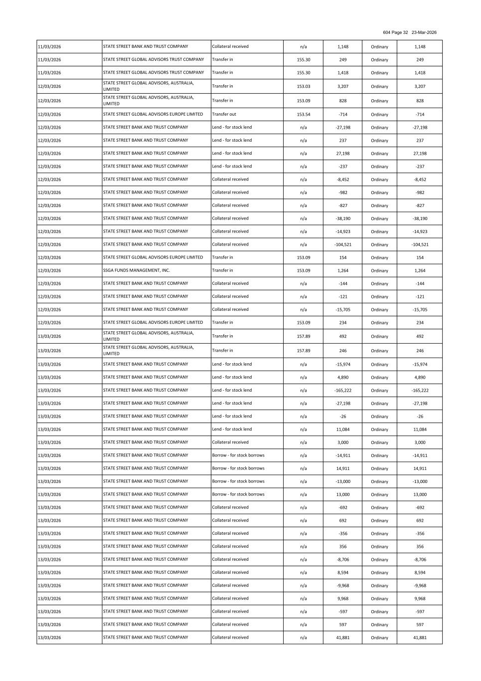 604 Page 32 23-Mar-2026 11/03/2026 n/a 1,148 Ordinary 1,148 11/03/2026 155.30 249 Ordinary 249 11/03/2026 155.30 1,418 Ordinary 1,418 12/03/2026 153.03 3,207 Ordinary 3,207 12/03/2026 153.09 828 Ordinary 828 12/03/2026 153.54 -714 Ordinary -714 12/03/2026 n/a -27,198 Ordinary -27,198 12/03/2026 n/a 237 Ordinary 237 12/03/2026 n/a 27,198 Ordinary 27,198 12/03/2026 n/a -237 Ordinary -237 12/03/2026 n/a -8,452 Ordinary -8,452 12/03/2026 n/a -982 Ordinary -982 12/03/2026 n/a -827 Ordinary -827 12/03/2026 n/a -38,190 Ordinary -38,190 12/03/2026 n/a -14,923 Ordinary -14,923 12/03/2026 n/a -104,521 Ordinary -104,521 12/03/2026 153.09 154 Ordinary 154 12/03/2026 153.09 1,264 Ordinary 1,264 12/03/2026 n/a -144 Ordinary -144 12/03/2026 n/a -121 Ordinary -121 12/03/2026 n/a -15,705 Ordinary -15,705 12/03/2026 153.09 234 Ordinary 234 13/03/2026 157.89 492 Ordinary 492 13/03/2026 157.89 246 Ordinary 246 13/03/2026 n/a -15,974 Ordinary -15,974 13/03/2026 n/a 4,890 Ordinary 4,890 13/03/2026 n/a -165,222 Ordinary -165,222 13/03/2026 n/a -27,198 Ordinary -27,198 13/03/2026 n/a -26 Ordinary -26 13/03/2026 n/a 11,084 Ordinary 11,084 13/03/2026 n/a 3,000 Ordinary 3,000 13/03/2026 n/a -14,911 Ordinary -14,911 13/03/2026 n/a 14,911 Ordinary 14,911 13/03/2026 n/a -13,000 Ordinary -13,000 13/03/2026 n/a 13,000 Ordinary 13,000 13/03/2026 n/a -692 Ordinary -692 13/03/2026 n/a 692 Ordinary 692 13/03/2026 n/a -356 Ordinary -356 13/03/2026 n/a 356 Ordinary 356 13/03/2026 n/a -8,706 Ordinary -8,706 13/03/2026 n/a 8,594 Ordinary 8,594 13/03/2026 n/a -9,968 Ordinary -9,968 13/03/2026 n/a 9,968 Ordinary 9,968 13/03/2026 n/a -597 Ordinary -597 13/03/2026 n/a 597 Ordinary 597 13/03/2026 n/a 41,881 Ordinary 41,881 Collateral received Transfer in STATE STREET BANK AND TRUST COMPANY Lend - for stock lend Collateral received STATE STREET BANK AND TRUST COMPANY Collateral received STATE STREET BANK AND TRUST COMPANY STATE STREET BANK AND TRUST COMPANY STATE STREET BANK AND TRUST COMPANY STATE STREET BANK AND TRUST COMPANY Transfer in Borrow - for stock borrows Lend - for stock lend Lend - for stock lend Collateral received STATE STREET BANK AND TRUST COMPANY STATE STREET BANK AND TRUST COMPANY STATE STREET GLOBAL ADVISORS, AUSTRALIA, LIMITED STATE STREET GLOBAL ADVISORS, AUSTRALIA, LIMITED Collateral received SSGA FUNDS MANAGEMENT, INC. STATE STREET BANK AND TRUST COMPANY Transfer in Lend - for stock lend STATE STREET BANK AND TRUST COMPANY Collateral received STATE STREET BANK AND TRUST COMPANY STATE STREET BANK AND TRUST COMPANY Lend - for stock lend STATE STREET BANK AND TRUST COMPANY STATE STREET BANK AND TRUST COMPANY Collateral received STATE STREET BANK AND TRUST COMPANY Transfer in STATE STREET BANK AND TRUST COMPANY Collateral received Transfer in STATE STREET GLOBAL ADVISORS, AUSTRALIA, LIMITED Collateral received Collateral received STATE STREET BANK AND TRUST COMPANY Collateral received STATE STREET BANK AND TRUST COMPANY Collateral received Transfer out STATE STREET GLOBAL ADVISORS TRUST COMPANY Lend - for stock lend STATE STREET BANK AND TRUST COMPANY STATE STREET BANK AND TRUST COMPANY Borrow - for stock borrows STATE STREET BANK AND TRUST COMPANY Collateral received STATE STREET BANK AND TRUST COMPANY Collateral received Transfer in STATE STREET GLOBAL ADVISORS, AUSTRALIA, LIMITED Collateral received STATE STREET BANK AND TRUST COMPANY Collateral received STATE STREET GLOBAL ADVISORS EUROPE LIMITED STATE STREET BANK AND TRUST COMPANY Lend - for stock lend STATE STREET BANK AND TRUST COMPANY Lend - for stock lend STATE STREET BANK AND TRUST COMPANY Collateral received Transfer in STATE STREET BANK AND TRUST COMPANY STATE STREET BANK AND TRUST COMPANY Borrow - for stock borrows STATE STREET BANK AND TRUST COMPANY STATE STREET BANK AND TRUST COMPANY Transfer in Collateral received Collateral received STATE STREET BANK AND TRUST COMPANY Lend - for stock lend Collateral received STATE STREET BANK AND TRUST COMPANY STATE STREET BANK AND TRUST COMPANY STATE STREET GLOBAL ADVISORS TRUST COMPANY Transfer in STATE STREET GLOBAL ADVISORS EUROPE LIMITED Borrow - for stock borrows STATE STREET GLOBAL ADVISORS EUROPE LIMITED Lend - for stock lend Collateral received STATE STREET BANK AND TRUST COMPANY STATE STREET BANK AND TRUST COMPANY STATE STREET BANK AND TRUST COMPANY Collateral received