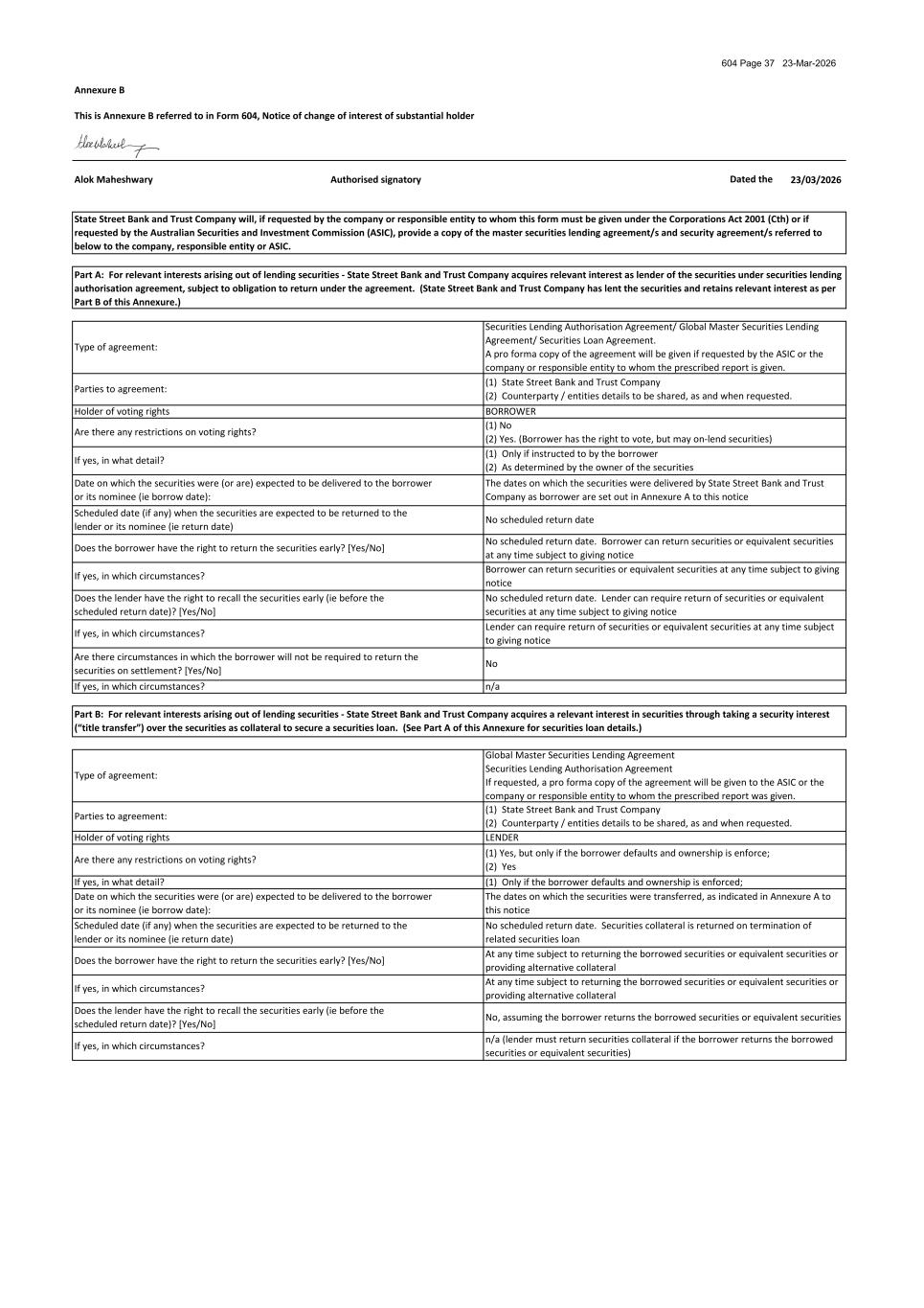 604 Page 37 23-Mar-2026 Annexure B This is Annexure B referred to in Form 604, Notice of change of interest of substantial holder 23/03/2026 Does the lender have the right to recall the securities early (ie before the scheduled return date)? [Yes/No] No, assuming the borrower returns the borrowed securities or equivalent securities If yes, in which circumstances? n/a (lender must return securities collateral if the borrower returns the borrowed securities or equivalent securities) Scheduled date (if any) when the securities are expected to be returned to the lender or its nominee (ie return date) No scheduled return date. Securities collateral is returned on termination of related securities loan Does the borrower have the right to return the securities early? [Yes/No] At any time subject to returning the borrowed securities or equivalent securities or providing alternative collateral If yes, in which circumstances? At any time subject to returning the borrowed securities or equivalent securities or providing alternative collateral Are there any restrictions on voting rights? (1) Yes, but only if the borrower defaults and ownership is enforce; (2) Yes If yes, in what detail? (1) Only if the borrower defaults and ownership is enforced; Date on which the securities were (or are) expected to be delivered to the borrower or its nominee (ie borrow date): The dates on which the securities were transferred, as indicated in Annexure A to this notice Part B: For relevant interests arising out of lending securities - State Street Bank and Trust Company acquires a relevant interest in securities through taking a security interest (“title transfer”) over the securities as collateral to secure a securities loan. (See Part A of this Annexure for securities loan details.) Type of agreement: Global Master Securities Lending Agreement Securities Lending Authorisation Agreement If requested, a pro forma copy of the agreement will be given to the ASIC or the company or responsible entity to whom the prescribed report was given. Parties to agreement: (1) State Street Bank and Trust Company (2) Counterparty / entities details to be shared, as and when requested. Holder of voting rights LENDER If yes, in which circumstances? Lender can require return of securities or equivalent securities at any time subject to giving notice Are there circumstances in which the borrower will not be required to return the securities on settlement? [Yes/No] No If yes, in which circumstances? n/a Does the borrower have the right to return the securities early? [Yes/No] No scheduled return date. Borrower can return securities or equivalent securities at any time subject to giving notice If yes, in which circumstances? Borrower can return securities or equivalent securities at any time subject to giving notice Does the lender have the right to recall the securities early (ie before the scheduled return date)? [Yes/No] No scheduled return date. Lender can require return of securities or equivalent securities at any time subject to giving notice If yes, in what detail? (1) Only if instructed to by the borrower (2) As determined by the owner of the securities Date on which the securities were (or are) expected to be delivered to the borrower or its nominee (ie borrow date): The dates on which the securities were delivered by State Street Bank and Trust Company as borrower are set out in Annexure A to this notice Scheduled date (if any) when the securities are expected to be returned to the lender or its nominee (ie return date) No scheduled return date Parties to agreement: (1) State Street Bank and Trust Company (2) Counterparty / entities details to be shared, as and when requested. Holder of voting rights BORROWER Are there any restrictions on voting rights? (1) No (2) Yes. (Borrower has the right to vote, but may on-lend securities) Alok Maheshwary Authorised signatory Dated the State Street Bank and Trust Company will, if requested by the company or responsible entity to whom this form must be given under the Corporations Act 2001 (Cth) or if requested by the Australian Securities and Investment Commission (ASIC), provide a copy of the master securities lending agreement/s and security agreement/s referred to below to the company, responsible entity or ASIC. Part A: For relevant interests arising out of lending securities - State Street Bank and Trust Company acquires relevant interest as lender of the securities under securities lending authorisation agreement, subject to obligation to return under the agreement. (State Street Bank and Trust Company has lent the securities and retains relevant interest as per Part B of this Annexure.) Type of agreement: Securities Lending Authorisation Agreement/ Global Master Securities Lending Agreement/ Securities Loan Agreement. A pro forma copy of the agreement will be given if requested by the ASIC or the company or responsible entity to whom the prescribed report is given.