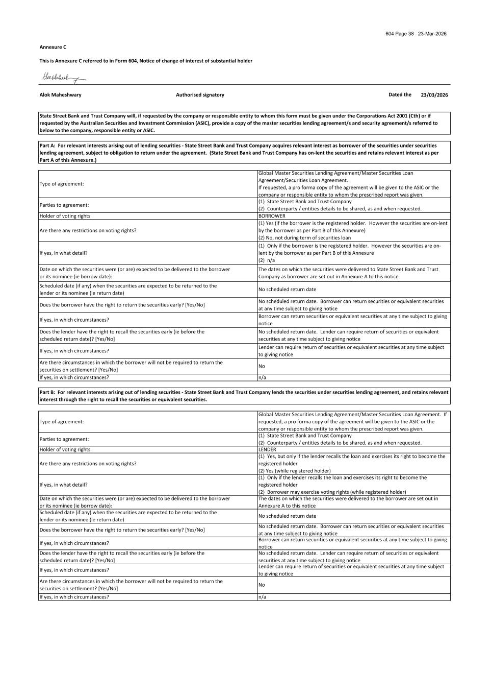 604 Page 38 23-Mar-2026 Annexure C This is Annexure C referred to in Form 604, Notice of change of interest of substantial holder 23/03/2026 If yes, in which circumstances? n/a Does the lender have the right to recall the securities early (ie before the scheduled return date)? [Yes/No] No scheduled return date. Lender can require return of securities or equivalent securities at any time subject to giving notice If yes, in which circumstances? Lender can require return of securities or equivalent securities at any time subject to giving notice Are there circumstances in which the borrower will not be required to return the securities on settlement? [Yes/No] No Scheduled date (if any) when the securities are expected to be returned to the lender or its nominee (ie return date) No scheduled return date Does the borrower have the right to return the securities early? [Yes/No] No scheduled return date. Borrower can return securities or equivalent securities at any time subject to giving notice If yes, in which circumstances? Borrower can return securities or equivalent securities at any time subject to giving notice Are there any restrictions on voting rights? (1) Yes, but only if the lender recalls the loan and exercises its right to become the registered holder (2) Yes (while registered holder) If yes, in what detail? (1) Only if the lender recalls the loan and exercises its right to become the registered holder (2) Borrower may exercise voting rights (while registered holder) Date on which the securities were (or are) expected to be delivered to the borrower or its nominee (ie borrow date): The dates on which the securities were delivered to the borrower are set out in Annexure A to this notice Part B: For relevant interests arising out of lending securities - State Street Bank and Trust Company lends the securities under securities lending agreement, and retains relevant interest through the right to recall the securities or equivalent securities. Type of agreement: Global Master Securities Lending Agreement/Master Securities Loan Agreement. If requested, a pro forma copy of the agreement will be given to the ASIC or the company or responsible entity to whom the prescribed report was given. Parties to agreement: (1) State Street Bank and Trust Company (2) Counterparty / entities details to be shared, as and when requested. Holder of voting rights LENDER If yes, in which circumstances? Lender can require return of securities or equivalent securities at any time subject to giving notice Are there circumstances in which the borrower will not be required to return the securities on settlement? [Yes/No] No If yes, in which circumstances? n/a Does the borrower have the right to return the securities early? [Yes/No] No scheduled return date. Borrower can return securities or equivalent securities at any time subject to giving notice If yes, in which circumstances? Borrower can return securities or equivalent securities at any time subject to giving notice Does the lender have the right to recall the securities early (ie before the scheduled return date)? [Yes/No] No scheduled return date. Lender can require return of securities or equivalent securities at any time subject to giving notice If yes, in what detail? (1) Only if the borrower is the registered holder. However the securities are on- lent by the borrower as per Part B of this Annexure (2) n/a Date on which the securities were (or are) expected to be delivered to the borrower or its nominee (ie borrow date): The dates on which the securities were delivered to State Street Bank and Trust Company as borrower are set out in Annexure A to this notice Scheduled date (if any) when the securities are expected to be returned to the lender or its nominee (ie return date) No scheduled return date Parties to agreement: (1) State Street Bank and Trust Company (2) Counterparty / entities details to be shared, as and when requested. Holder of voting rights BORROWER Are there any restrictions on voting rights? (1) Yes (if the borrower is the registered holder. However the securities are on-lent by the borrower as per Part B of this Annexure) (2) No, not during term of securities loan Alok Maheshwary Authorised signatory Dated the State Street Bank and Trust Company will, if requested by the company or responsible entity to whom this form must be given under the Corporations Act 2001 (Cth) or if requested by the Australian Securities and Investment Commission (ASIC), provide a copy of the master securities lending agreement/s and security agreement/s referred to below to the company, responsible entity or ASIC. Part A: For relevant interests arising out of lending securities - State Street Bank and Trust Company acquires relevant interest as borrower of the securities under securities lending agreement, subject to obligation to return under the agreement. (State Street Bank and Trust Company has on-lent the securities and retains relevant interest as per Part A of this Annexure.) Type of agreement: Global Master Securities Lending Agreement/Master Securities Loan Agreement/Securities Loan Agreement. If requested, a pro forma copy of the agreement will be given to the ASIC or the company or responsible entity to whom the prescribed report was given.