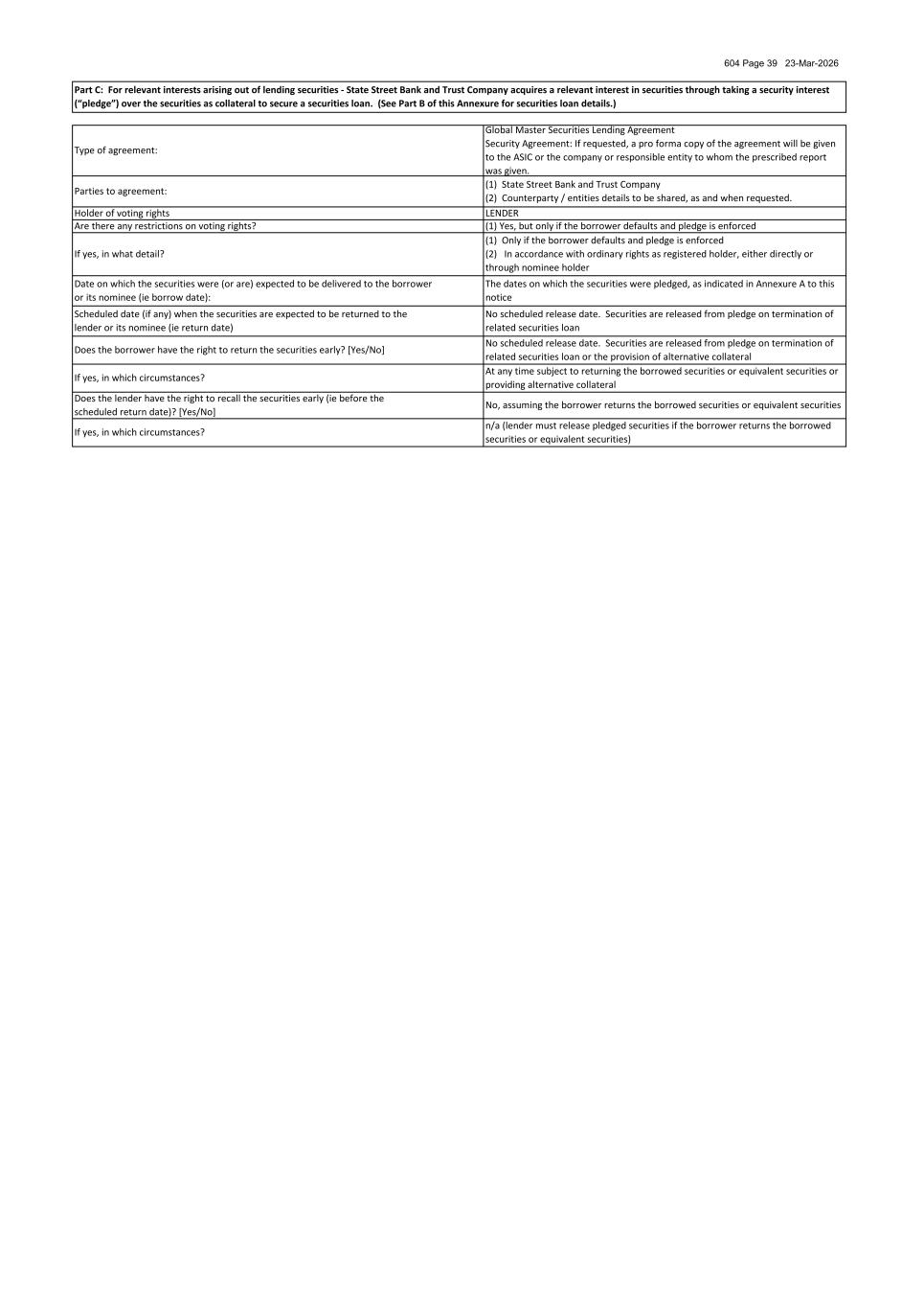 604 Page 39 23-Mar-2026 If yes, in which circumstances? At any time subject to returning the borrowed securities or equivalent securities or providing alternative collateral Does the lender have the right to recall the securities early (ie before the scheduled return date)? [Yes/No] No, assuming the borrower returns the borrowed securities or equivalent securities If yes, in which circumstances? n/a (lender must release pledged securities if the borrower returns the borrowed securities or equivalent securities) Date on which the securities were (or are) expected to be delivered to the borrower or its nominee (ie borrow date): The dates on which the securities were pledged, as indicated in Annexure A to this notice Scheduled date (if any) when the securities are expected to be returned to the lender or its nominee (ie return date) No scheduled release date. Securities are released from pledge on termination of related securities loan Does the borrower have the right to return the securities early? [Yes/No] No scheduled release date. Securities are released from pledge on termination of related securities loan or the provision of alternative collateral Holder of voting rights LENDER Are there any restrictions on voting rights? (1) Yes, but only if the borrower defaults and pledge is enforced If yes, in what detail? (1) Only if the borrower defaults and pledge is enforced (2) In accordance with ordinary rights as registered holder, either directly or through nominee holder Part C: For relevant interests arising out of lending securities - State Street Bank and Trust Company acquires a relevant interest in securities through taking a security interest (“pledge”) over the securities as collateral to secure a securities loan. (See Part B of this Annexure for securities loan details.) Type of agreement: Global Master Securities Lending Agreement Security Agreement: If requested, a pro forma copy of the agreement will be given to the ASIC or the company or responsible entity to whom the prescribed report was given. Parties to agreement: (1) State Street Bank and Trust Company (2) Counterparty / entities details to be shared, as and when requested.