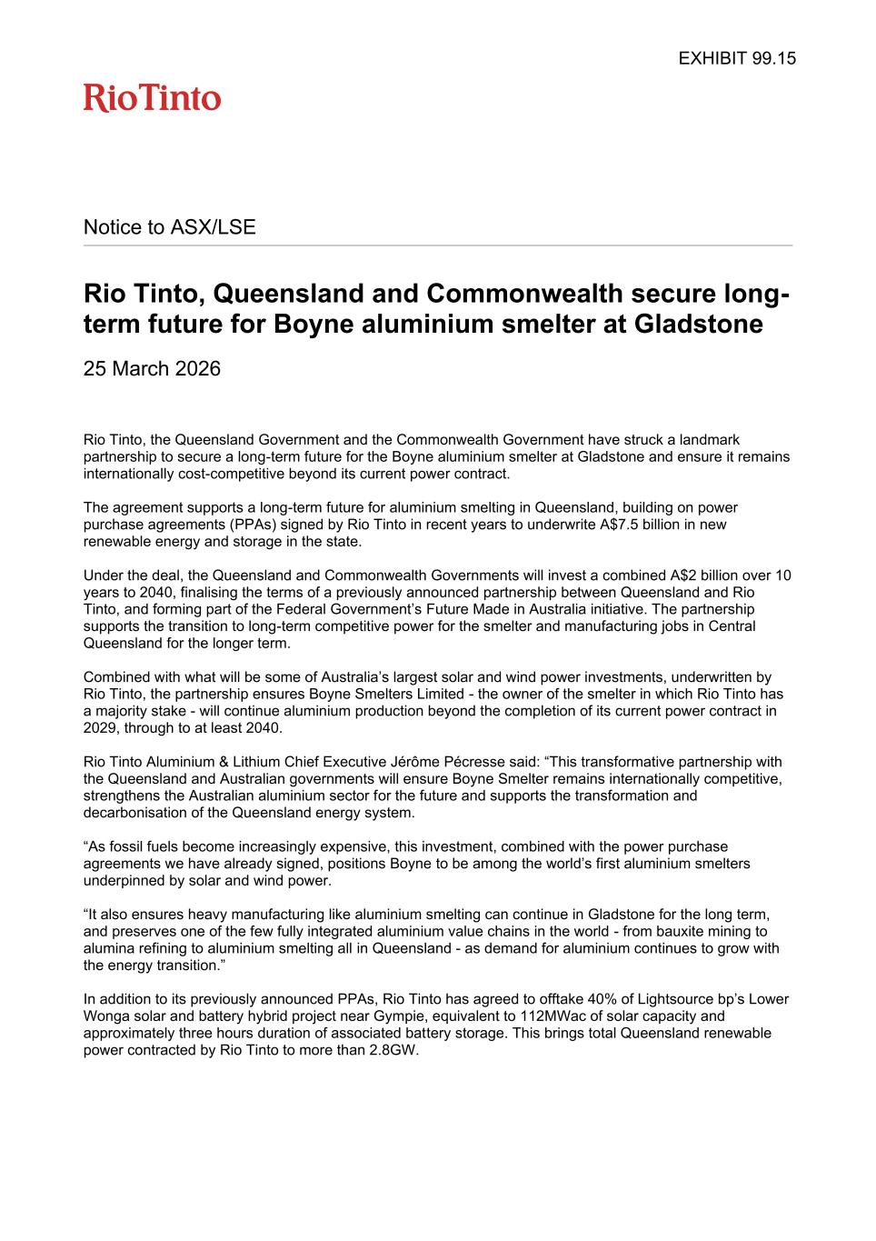 Notice to ASX/LSE Rio Tinto, Queensland and Commonwealth secure long- term future for Boyne aluminium smelter at Gladstone 25 March 2026 Rio Tinto, the Queensland Government and the Commonwealth Government have struck a landmark partnership to secure a long-term future for the Boyne aluminium smelter at Gladstone and ensure it remains internationally cost-competitive beyond its current power contract. The agreement supports a long-term future for aluminium smelting in Queensland, building on power purchase agreements (PPAs) signed by Rio Tinto in recent years to underwrite A$7.5 billion in new renewable energy and storage in the state. Under the deal, the Queensland and Commonwealth Governments will invest a combined A$2 billion over 10 years to 2040, finalising the terms of a previously announced partnership between Queensland and Rio Tinto, and forming part of the Federal Government’s Future Made in Australia initiative. The partnership supports the transition to long-term competitive power for the smelter and manufacturing jobs in Central Queensland for the longer term. Combined with what will be some of Australia’s largest solar and wind power investments, underwritten by Rio Tinto, the partnership ensures Boyne Smelters Limited - the owner of the smelter in which Rio Tinto has a majority stake - will continue aluminium production beyond the completion of its current power contract in 2029, through to at least 2040. Rio Tinto Aluminium & Lithium Chief Executive Jérôme Pécresse said: “This transformative partnership with the Queensland and Australian governments will ensure Boyne Smelter remains internationally competitive, strengthens the Australian aluminium sector for the future and supports the transformation and decarbonisation of the Queensland energy system. “As fossil fuels become increasingly expensive, this investment, combined with the power purchase agreements we have already signed, positions Boyne to be among the world’s first aluminium smelters underpinned by solar and wind power. “It also ensures heavy manufacturing like aluminium smelting can continue in Gladstone for the long term, and preserves one of the few fully integrated aluminium value chains in the world - from bauxite mining to alumina refining to aluminium smelting all in Queensland - as demand for aluminium continues to grow with the energy transition.” In addition to its previously announced PPAs, Rio Tinto has agreed to offtake 40% of Lightsource bp’s Lower Wonga solar and battery hybrid project near Gympie, equivalent to 112MWac of solar capacity and approximately three hours duration of associated battery storage. This brings total Queensland renewable power contracted by Rio Tinto to more than 2.8GW. EXHIBIT 99.15