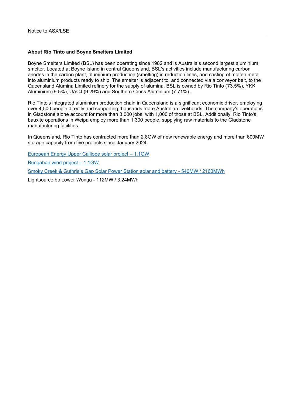 Notice to ASX/LSE About Rio Tinto and Boyne Smelters Limited Boyne Smelters Limited (BSL) has been operating since 1982 and is Australia’s second largest aluminium smelter. Located at Boyne Island in central Queensland, BSL’s activities include manufacturing carbon anodes in the carbon plant, aluminium production (smelting) in reduction lines, and casting of molten metal into aluminium products ready to ship. The smelter is adjacent to, and connected via a conveyor belt, to the Queensland Alumina Limited refinery for the supply of alumina. BSL is owned by Rio Tinto (73.5%), YKK Aluminium (9.5%), UACJ (9.29%) and Southern Cross Aluminium (7.71%). Rio Tinto's integrated aluminium production chain in Queensland is a significant economic driver, employing over 4,500 people directly and supporting thousands more Australian livelihoods. The company's operations in Gladstone alone account for more than 3,000 jobs, with 1,000 of those at BSL. Additionally, Rio Tinto's bauxite operations in Weipa employ more than 1,300 people, supplying raw materials to the Gladstone manufacturing facilities. In Queensland, Rio Tinto has contracted more than 2.8GW of new renewable energy and more than 600MW storage capacity from five projects since January 2024: European Energy Upper Calliope solar project – 1.1GW Bungaban wind project – 1.1GW Smoky Creek & Guthrie’s Gap Solar Power Station solar and battery - 540MW / 2160MWh Lightsource bp Lower Wonga - 112MW / 3.24MWh