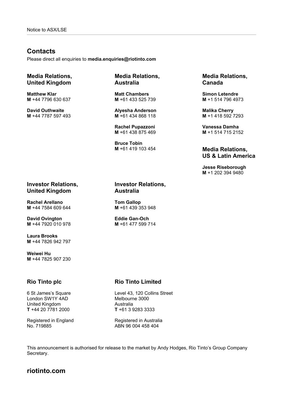 Notice to ASX/LSE Contacts Please direct all enquiries to media.enquiries@riotinto.com Media Relations, United Kingdom Matthew Klar M +44 7796 630 637 David Outhwaite M +44 7787 597 493 Media Relations, Australia Matt Chambers M +61 433 525 739 Alyesha Anderson M +61 434 868 118 Rachel Pupazzoni M +61 438 875 469 Bruce Tobin M +61 419 103 454 Media Relations, Canada Simon Letendre M +1 514 796 4973 Malika Cherry M +1 418 592 7293 Vanessa Damha M +1 514 715 2152 Media Relations, US & Latin America Jesse Riseborough M +1 202 394 9480 Investor Relations, United Kingdom Rachel Arellano M +44 7584 609 644 David Ovington M +44 7920 010 978 Laura Brooks M +44 7826 942 797 Weiwei Hu M +44 7825 907 230 Investor Relations, Australia Tom Gallop M +61 439 353 948 Eddie Gan-Och M +61 477 599 714 Rio Tinto plc 6 St James’s Square London SW1Y 4AD United Kingdom T +44 20 7781 2000 Registered in England No. 719885 Rio Tinto Limited Level 43, 120 Collins Street Melbourne 3000 Australia T +61 3 9283 3333 Registered in Australia ABN 96 004 458 404 This announcement is authorised for release to the market by Andy Hodges, Rio Tinto’s Group Company Secretary. riotinto.com