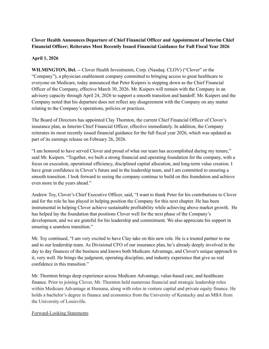 Clover Health Announces Departure of Chief Financial Officer and Appointment of Interim Chief Financial Officer; Reiterates Most Recently Issued Financial Guidance for Full Fiscal Year 2026 April 1, 2026 WILMINGTON, Del. -- Clover Health Investments, Corp. (Nasdaq: CLOV) (“Clover” or the “Company”), a physician enablement company committed to bringing access to great healthcare to everyone on Medicare, today announced that Peter Kuipers is stepping down as the Chief Financial Officer of the Company, effective March 30, 2026. Mr. Kuipers will remain with the Company in an advisory capacity through April 24, 2026 to support a smooth transition and handoff. Mr. Kuipers and the Company noted that his departure does not reflect any disagreement with the Company on any matter relating to the Company’s operations, policies or practices. The Board of Directors has appointed Clay Thornton, the current Chief Financial Officer of Clover’s insurance plan, as Interim Chief Financial Officer, effective immediately. In addition, the Company reiterates its most recently issued financial guidance for the full fiscal year 2026, which was updated as part of its earnings release on February 26, 2026. “I am honored to have served Clover and proud of what our team has accomplished during my tenure,” said Mr. Kuipers. “Together, we built a strong financial and operating foundation for the company, with a focus on execution, operational efficiency, disciplined capital allocation, and long-term value creation. I have great confidence in Clover’s future and in the leadership team, and I am committed to ensuring a smooth transition. I look forward to seeing the company continue to build on this foundation and achieve even more in the years ahead.” Andrew Toy, Clover’s Chief Executive Officer, said, “I want to thank Peter for his contributions to Clover and for the role he has played in helping position the Company for this next chapter. He has been instrumental in helping Clover achieve sustainable profitability while achieving above market growth. He has helped lay the foundation that positions Clover well for the next phase of the Company’s development, and we are grateful for his leadership and commitment. We also appreciate his support in ensuring a seamless transition.” Mr. Toy continued, “I am very excited to have Clay take on this new role. He is a trusted partner to me and to our leadership team. As Divisional CFO of our insurance plan, he’s already deeply involved in the day to day finances of the business and knows both Medicare Advantage, and Clover's unique approach to it, very well. He brings the judgment, operating discipline, and industry experience that give us real confidence in this transition.” Mr. Thornton brings deep experience across Medicare Advantage, value-based care, and healthcare finance. Prior to joining Clover, Mr. Thornton held numerous financial and strategic leadership roles within Medicare Advantage at Humana, along with roles in venture capital and private equity finance. He holds a bachelor’s degree in finance and economics from the University of Kentucky and an MBA from the University of Louisville. Forward-Looking Statements