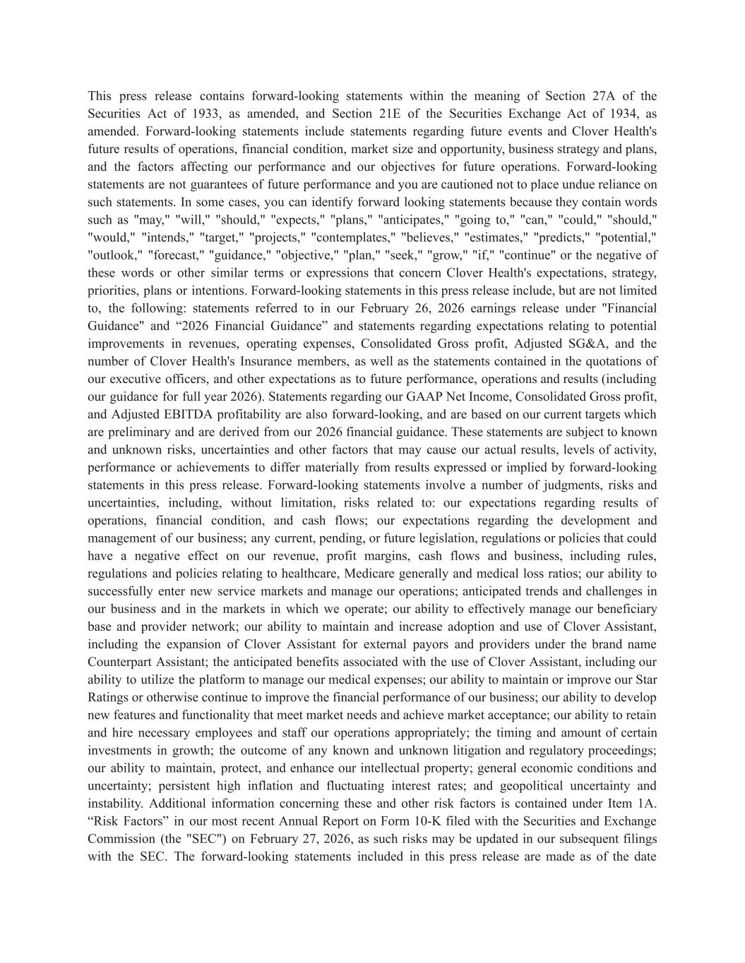 This press release contains forward-looking statements within the meaning of Section 27A of the Securities Act of 1933, as amended, and Section 21E of the Securities Exchange Act of 1934, as amended. Forward-looking statements include statements regarding future events and Clover Health's future results of operations, financial condition, market size and opportunity, business strategy and plans, and the factors affecting our performance and our objectives for future operations. Forward-looking statements are not guarantees of future performance and you are cautioned not to place undue reliance on such statements. In some cases, you can identify forward looking statements because they contain words such as "may," "will," "should," "expects," "plans," "anticipates," "going to," "can," "could," "should," "would," "intends," "target," "projects," "contemplates," "believes," "estimates," "predicts," "potential," "outlook," "forecast," "guidance," "objective," "plan," "seek," "grow," "if," "continue" or the negative of these words or other similar terms or expressions that concern Clover Health's expectations, strategy, priorities, plans or intentions. Forward-looking statements in this press release include, but are not limited to, the following: statements referred to in our February 26, 2026 earnings release under "Financial Guidance" and “2026 Financial Guidance” and statements regarding expectations relating to potential improvements in revenues, operating expenses, Consolidated Gross profit, Adjusted SG&A, and the number of Clover Health's Insurance members, as well as the statements contained in the quotations of our executive officers, and other expectations as to future performance, operations and results (including our guidance for full year 2026). Statements regarding our GAAP Net Income, Consolidated Gross profit, and Adjusted EBITDA profitability are also forward-looking, and are based on our current targets which are preliminary and are derived from our 2026 financial guidance. These statements are subject to known and unknown risks, uncertainties and other factors that may cause our actual results, levels of activity, performance or achievements to differ materially from results expressed or implied by forward-looking statements in this press release. Forward-looking statements involve a number of judgments, risks and uncertainties, including, without limitation, risks related to: our expectations regarding results of operations, financial condition, and cash flows; our expectations regarding the development and management of our business; any current, pending, or future legislation, regulations or policies that could have a negative effect on our revenue, profit margins, cash flows and business, including rules, regulations and policies relating to healthcare, Medicare generally and medical loss ratios; our ability to successfully enter new service markets and manage our operations; anticipated trends and challenges in our business and in the markets in which we operate; our ability to effectively manage our beneficiary base and provider network; our ability to maintain and increase adoption and use of Clover Assistant, including the expansion of Clover Assistant for external payors and providers under the brand name Counterpart Assistant; the anticipated benefits associated with the use of Clover Assistant, including our ability to utilize the platform to manage our medical expenses; our ability to maintain or improve our Star Ratings or otherwise continue to improve the financial performance of our business; our ability to develop new features and functionality that meet market needs and achieve market acceptance; our ability to retain and hire necessary employees and staff our operations appropriately; the timing and amount of certain investments in growth; the outcome of any known and unknown litigation and regulatory proceedings; our ability to maintain, protect, and enhance our intellectual property; general economic conditions and uncertainty; persistent high inflation and fluctuating interest rates; and geopolitical uncertainty and instability. Additional information concerning these and other risk factors is contained under Item 1A. “Risk Factors” in our most recent Annual Report on Form 10-K filed with the Securities and Exchange Commission (the "SEC") on February 27, 2026, as such risks may be updated in our subsequent filings with the SEC. The forward-looking statements included in this press release are made as of the date