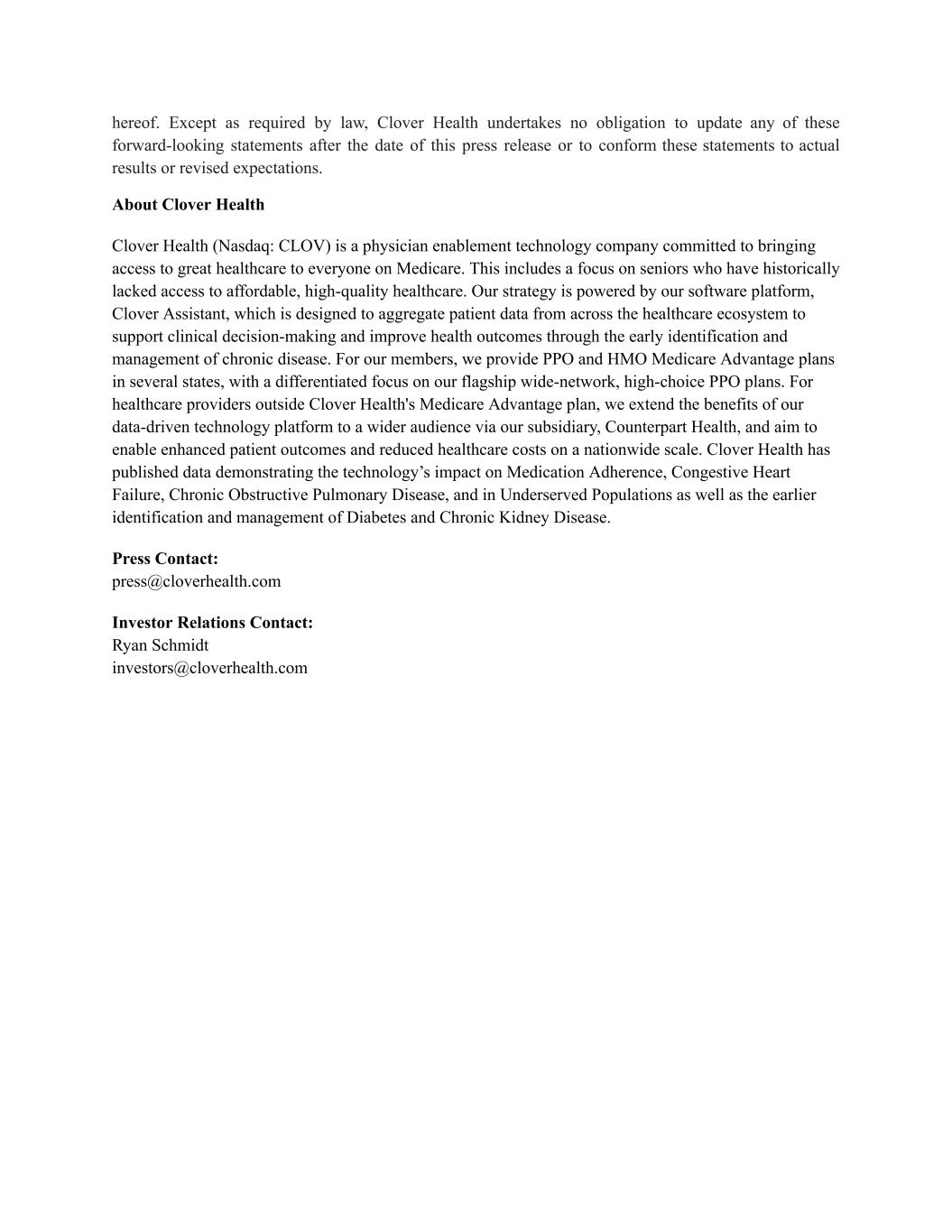 hereof. Except as required by law, Clover Health undertakes no obligation to update any of these forward-looking statements after the date of this press release or to conform these statements to actual results or revised expectations. About Clover Health Clover Health (Nasdaq: CLOV) is a physician enablement technology company committed to bringing access to great healthcare to everyone on Medicare. This includes a focus on seniors who have historically lacked access to affordable, high-quality healthcare. Our strategy is powered by our software platform, Clover Assistant, which is designed to aggregate patient data from across the healthcare ecosystem to support clinical decision-making and improve health outcomes through the early identification and management of chronic disease. For our members, we provide PPO and HMO Medicare Advantage plans in several states, with a differentiated focus on our flagship wide-network, high-choice PPO plans. For healthcare providers outside Clover Health's Medicare Advantage plan, we extend the benefits of our data-driven technology platform to a wider audience via our subsidiary, Counterpart Health, and aim to enable enhanced patient outcomes and reduced healthcare costs on a nationwide scale. Clover Health has published data demonstrating the technology’s impact on Medication Adherence, Congestive Heart Failure, Chronic Obstructive Pulmonary Disease, and in Underserved Populations as well as the earlier identification and management of Diabetes and Chronic Kidney Disease. Press Contact: press@cloverhealth.com Investor Relations Contact: Ryan Schmidt investors@cloverhealth.com