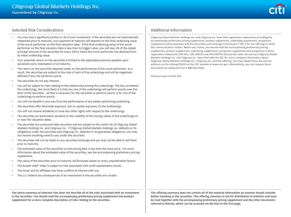 Selected Risk Considerations • You may lose a significant portion or all of your investment. If the securities are not automatically redeemed prior to maturity, your payment at maturity will depend on the final underlying value of the worst performer on the final valuation date. If the final underlying value of the worst performer on the final valuation date is less than its trigger value, you will lose 1% of the stated principal amount of the securities for every 1% by which the worst performer has declined from its initial underlying value. • Your potential return on the securities is limited to the applicable premium payable upon automatic early redemption or at maturity. • The return on the securities depends solely on the performance of the worst performer. As a result, t he securities are subject to the risks of each of the underlyings and will be negatively affected if any one performs poorly. • The securities do not pay interest. • You will be subject to risks relating to the relationship among the underlyings. The less correlated the underlyings, the more likely it is that any one of the underlyings will perform poorly over the term of the securities. All that is necessary for the securities to perform poorly is for one of the underlyings to perform poorly. • You will not benefit in any way from the performance of any better performing underlying. • The securities offer downside exposure, but no upside exposure, to the underlyings. • You will not receive dividends or have any other rights with respect to the underlyings. • The securities are particularly sensitive to the volatility of the closing values of the underlyings on or near the valuation dates. • The securities are unsecured debt securities and are subject to the credit risk of Citigroup Global Markets Holdings Inc. and Citigroup Inc. If Citigroup Global Markets Holdings Inc. defaults on its obligations under the securities and Citigroup Inc. defaults on its guarantee obligations, you may not receive anything owed to you under the securities. • The securities will not be listed on any securities exchange and you may not be able to sell them prior to maturity. • The estimated value of the securities on the pricing date is less than the issue price. For more information about the estimated value of the securities, see the accompanying preliminary pricing supplement. • The value of the securities prior to maturity will fluctuate based on many unpredictable factors. • The Russell 2000 ® Index is subject to risks associated with small capitalization stocks. • The issuer and its affiliates may have conflicts of interest with you. • The U.S. federal tax consequences of an investment in the securities are unclear. The above summary of selected risks does not describe all of the risks associated with an investment in the securities. You should read the accompanying preliminary pricing supplement and product supplement for a more complete description of risks relating to the securities. Additional Information Citigroup Global Markets Holdings Inc. and Citigroup Inc. have filed registration statements (including the accompanying preliminary pricing supplement, product supplement, underlying supplement, prospectus supplement and prospectus) with the Securities and Exchange Commission (“SEC”) for the offering to which this communication relates. Before you invest, you should read the accompanying preliminary pricing supplement, product supplement, underlying supplement, prospectus supplement and prospectus in those registration statements (File Nos. 333 - 293732 and 333 - 293732 - 02) and the other documents Citigroup Global Markets Holdings Inc. and Citigroup Inc. have filed with the SEC for more complete information about Citigroup Global Markets Holdings Inc., Citigroup Inc. and this offering. You may obtain these documents without cost by visiting EDGAR on the SEC website at www.sec.gov. Alternatively, you can request these documents by calling toll - free 1 - 800 - 831 - 9146. Filed pursuant to Rule 433 This offering summary does not contain all of the material information an investor should consider before investing in the securities. This offering summary is not for distribution in isolation and must be read together with the accompanying preliminary pricing supplement and the other documents referred to therein, which can be accessed via the link on the first page. Citigroup Global Markets Holdings Inc. Guaranteed by Citigroup Inc.