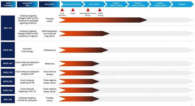 KROS 101 is a small molecule that targets the GITR ligand, a signal for T cell growth to remove a checkpoint barrier to fight a host of cancers. Our second drug, KROS 201, is a T cell therapy activated by dendritic cells to treat glioblastoma, a deadly and common brain cancer. Our ENV 105 drug seeks to address unmet medical needs in large markets of prostate and lung cancers. For example, the global prostate cancer therapeutics market size was valued at USD 7.9 billion and at USD 1.7 billion for EGFR mutant non-small cell lung cancer. Our ENV 105 biologic drug targets endoglin and addresses resistance to androgen targeted drugs and EGFR inhibitors. A Phase 2 trial involving a heavily pre-treated population suffering from prostate cancer was initiated at Cedars-Sinai Medical Center. The primary objective of the study was to measure the proportion of patients at two months who had either disease stabilization or regression (i.e. complete or partial response), referred to as the clinical benefit rate. A clinical benefit rate of 62% was observed. This Phase 2 trial involved the use of enzalutamide (Xtandi®, Pfizer) and abiraterone (ZYTIGA®, Janssen), two forms of hormone therapy that blocks the androgen receptor and its target ligand, testosterone, respectively. These two agents are considered standard of care for nearly all recurrent prostate cancer patients.