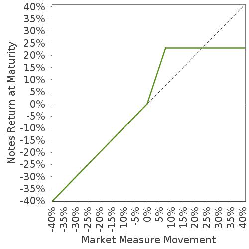 This graph reflects the returns on the notes, based on the Participation Rate of 300% and a hypothetical Capped Value of $12.30 per unit (the midpoint of the Capped Value range of [$12.10 to $12.50]). The green line reflects the returns on the notes, while the dotted gray line reflects the returns of a direct investment in the Market Measure, excluding dividends.
