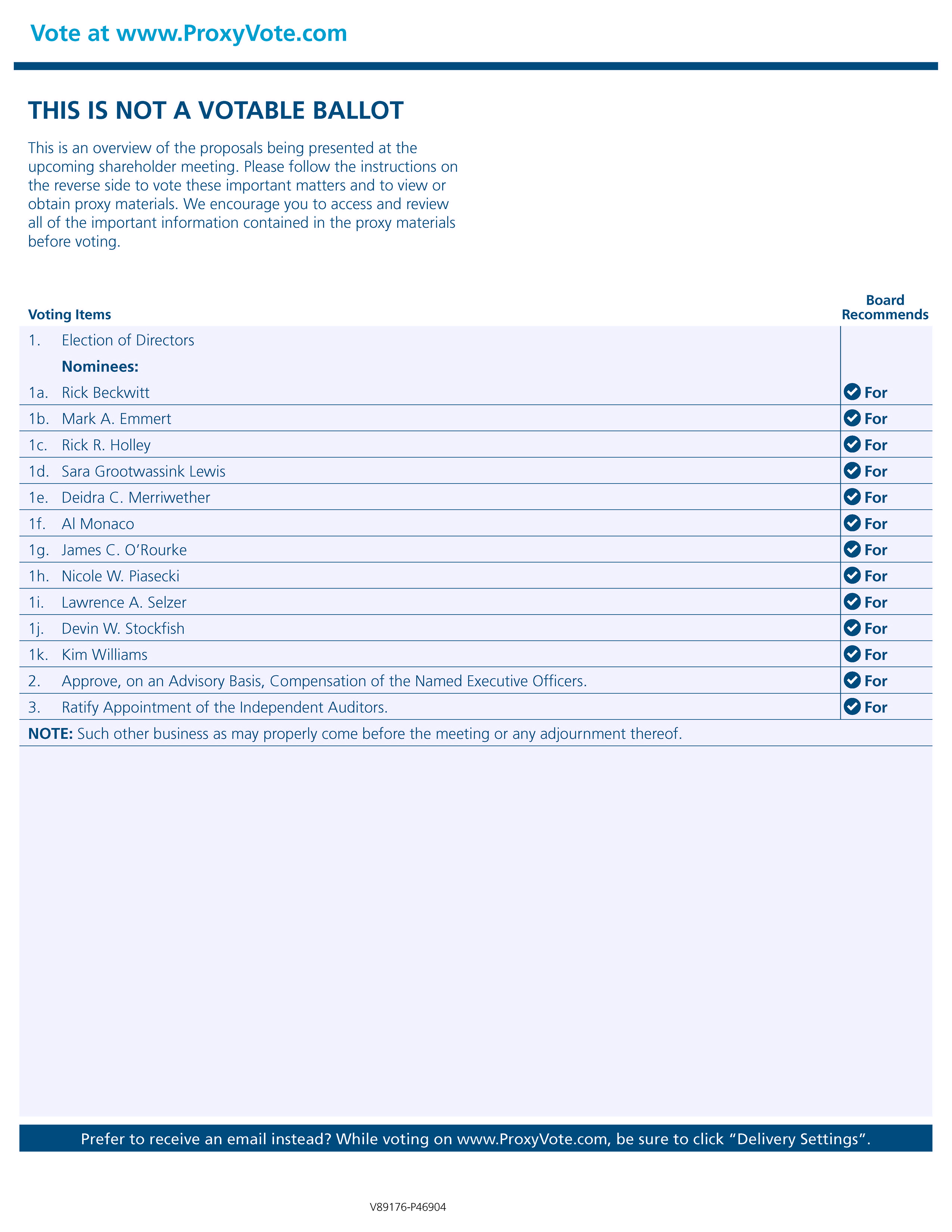 Vote at www.ProxyVote.com THIS IS NOT A VOTABLE BALLOT This is an overview of the proposals being presented at the upcoming shareholder meeting. Please follow the instructions on the reverse side to vote these important matters and to view or obtain proxy materials. We encourage you to access and review all of the important information contained in the proxy materials before voting. Voting Items Board  Recommends For 1.  Election of Directors Nominees: 1a. Mark A. Emmert 1b. Rick R. Holley 1c. Sara Grootwassink Lewis 1d. Deidra C. Merriwether 1e. Al Monaco 1f. James C. O’Rourke 1g. Nicole W. Piasecki 1h. Lawrence A. Selzer 1i.  Devin W. Stockfish 1j.  Kim Williams 2. Approval, on an advisory basis, of the compensation of the named executive officers. 3. Ratification of the selection of the independent registered public accounting firm. NOTE: Such other business as may properly come before the meeting or any adjournment thereof. Prefer to receive an email instead? While voting on www.ProxyVote.com, be sure to click “Delivery Settings”.  V65217-P25488