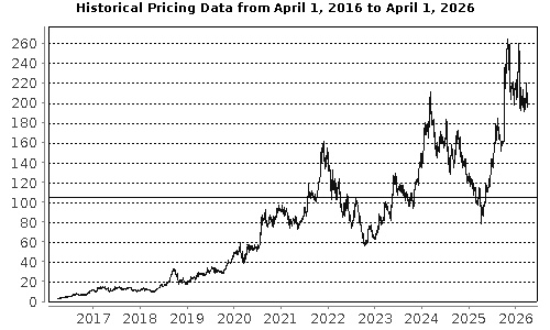 The graph below illustrates the performance of AMD's common stock for the period indicated, based on the daily closing levels as reported by Bloomberg, without independent verification. UBS has not conducted any independent review or due diligence of any publicly available information obtained from Bloomberg. The solid line represents its coupon barrier and downside threshold of $105.11, which is equal to 50.00% of the closing level on April 01, 2026. Past performance of the underlying asset is not indicative of the future performance of the underlying asset during the term of the Notes. |