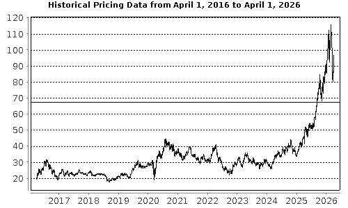 The graph below illustrates the performance of the GDX Fund's shares for the period indicated, based on the daily closing levels as reported by Bloomberg, without independent verification. UBS has not conducted any independent review or due diligence of any publicly available information obtained from Bloomberg. The solid line represents its coupon barrier and downside threshold of $67.21, which is equal to 70.00% of the closing level on April 01, 2026. Past performance of the underlying asset is not indicative of the future performance of the underlying asset during the term of the Notes. |