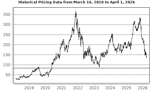 The graph below illustrates the performance of Zscaler's common stock for the period indicated, based on the daily closing levels as reported by Bloomberg, without independent verification. UBS has not conducted any independent review or due diligence of any publicly available information obtained from Bloomberg. The solid line represents its coupon barrier and downside threshold of $82.00, which is equal to 60.00% of the closing level on April 01, 2026. Past performance of the underlying asset is not indicative of the future performance of the underlying asset during the term of the Notes. |