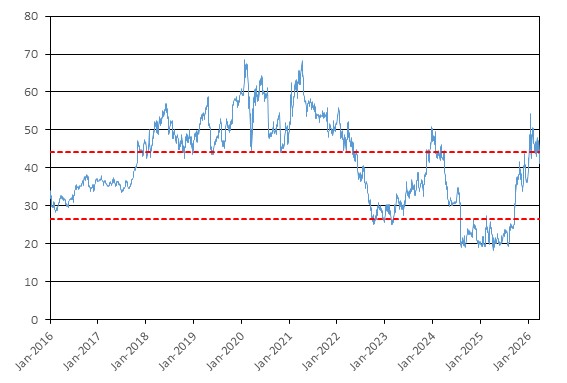 The graph below illustrates the performance of Intel’s common stock from January 1, 2016 through March 31, 2026, based on the daily closing levels as reported by Bloomberg, without independent verification. UBS has not conducted any independent review or due diligence of any publicly available information obtained from Bloomberg. The closing level of Intel’s common stock on March 31, 2026 was $44.13. The dotted lines respectively represent the call threshold level of $44.13, which is equal to 100.00% of the initial level, and the coupon barrier and downside threshold of $26.48, which is equal to 60.00% of the initial level. Past performance of the underlying asset is not indicative of the future performance of the underlying asset during the term of the Notes.