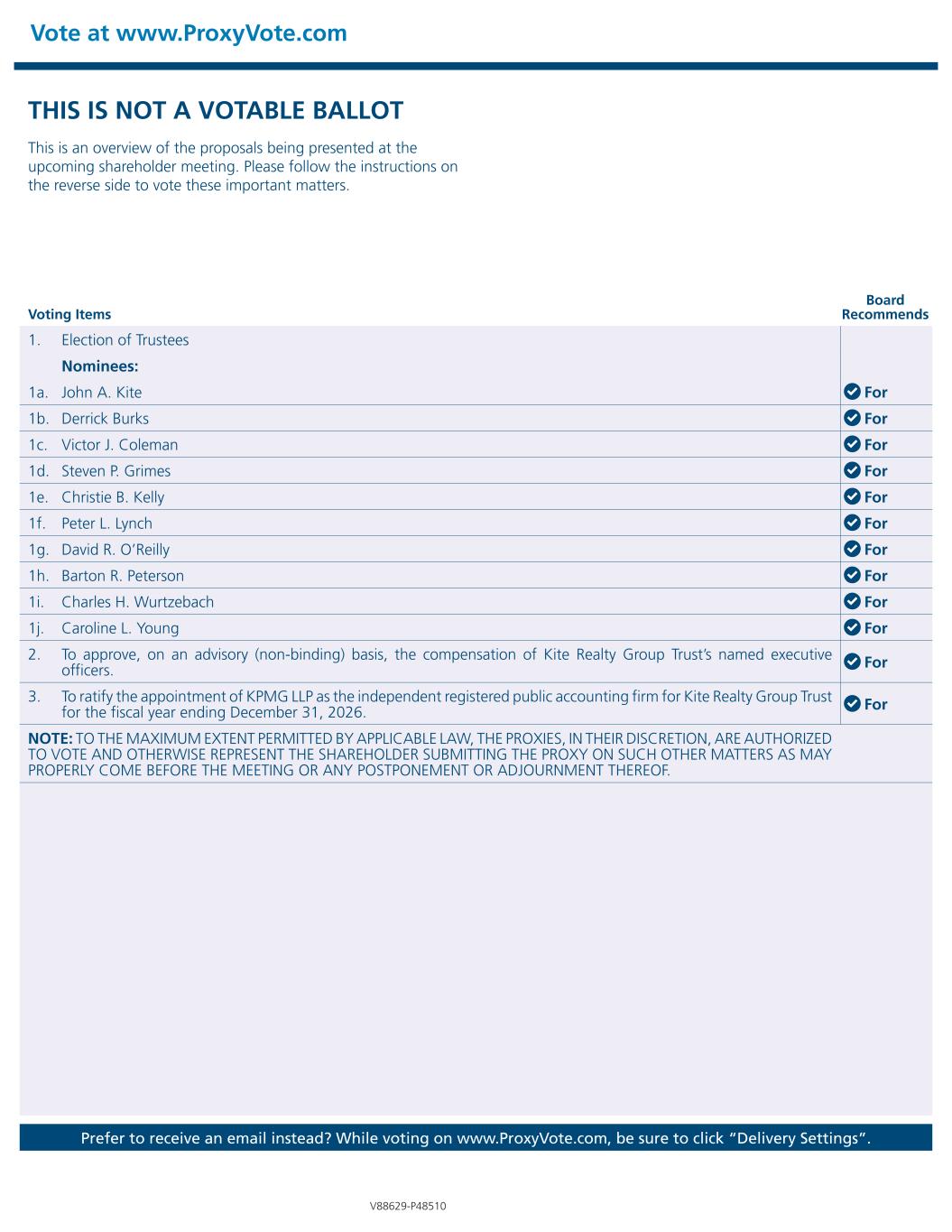 Vote at www.ProxyVote.com Prefer to receive an email instead? While voting on www.ProxyVote.com, be sure to click “Delivery Settings”. V88629-P48510 Voting Items Board Recommends 1. Election of Trustees Nominees: 1a. John A. Kite For 1b. Derrick Burks For 1c. Victor J. Coleman For 1d. Steven P. Grimes For 1e. Christie B. Kelly For 1f. Peter L. Lynch For 1g. David R. O’Reilly For 1h. Barton R. Peterson For 1i. Charles H. Wurtzebach For 1j. Caroline L. Young For 2. To approve, on an advisory (non-binding) basis, the compensation of Kite Realty Group Trust’s named executive officers. For 3. To ratify the appointment of KPMG LLP as the independent registered public accounting firm for Kite Realty Group Trust for the fiscal year ending December 31, 2026. For NOTE: TO THE MAXIMUM EXTENT PERMITTED BY APPLICABLE LAW, THE PROXIES, IN THEIR DISCRETION, ARE AUTHORIZED TO VOTE AND OTHERWISE REPRESENT THE SHAREHOLDER SUBMITTING THE PROXY ON SUCH OTHER MATTERS AS MAY PROPERLY COME BEFORE THE MEETING OR ANY POSTPONEMENT OR ADJOURNMENT THEREOF. THIS IS NOT A VOTABLE BALLOT This is an overview of the proposals being presented at the upcoming shareholder meeting. Please follow the instructions on the reverse side to vote these important matters.